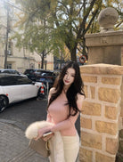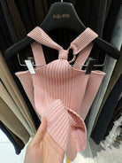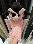 【C8379】純欲露肩掛脖長袖坑條粉色毛衣修身收腰針織衫