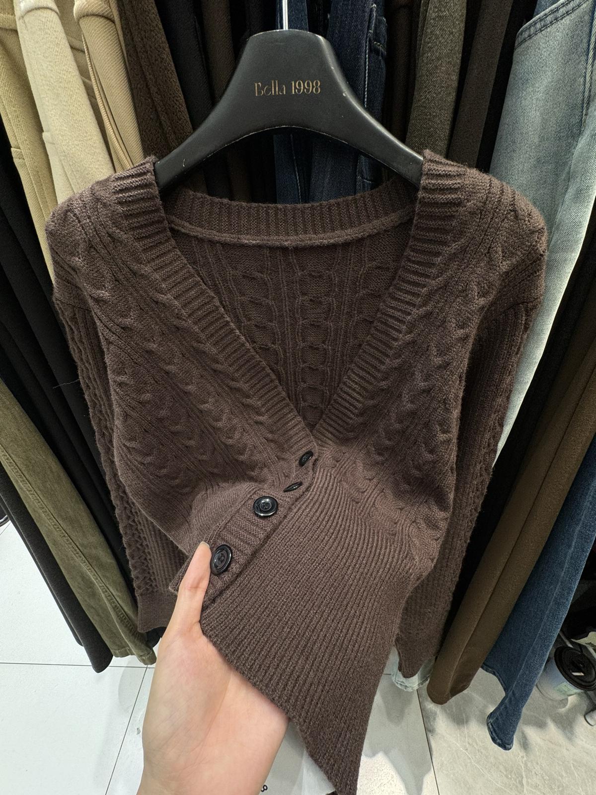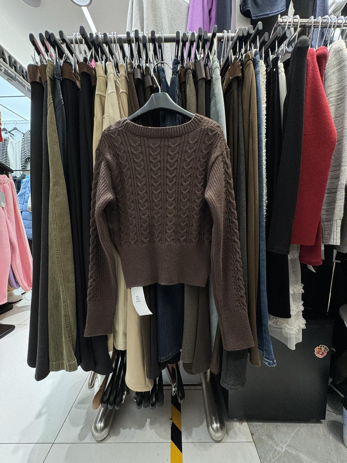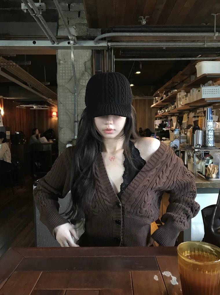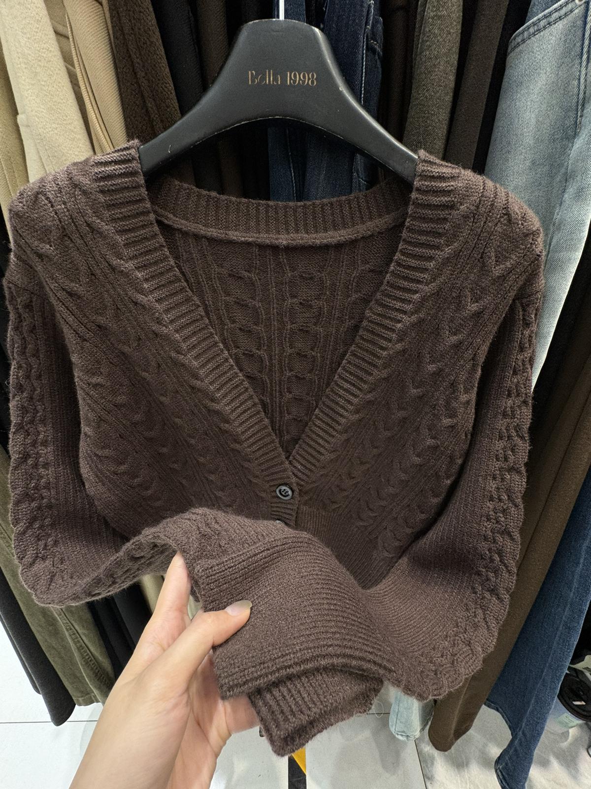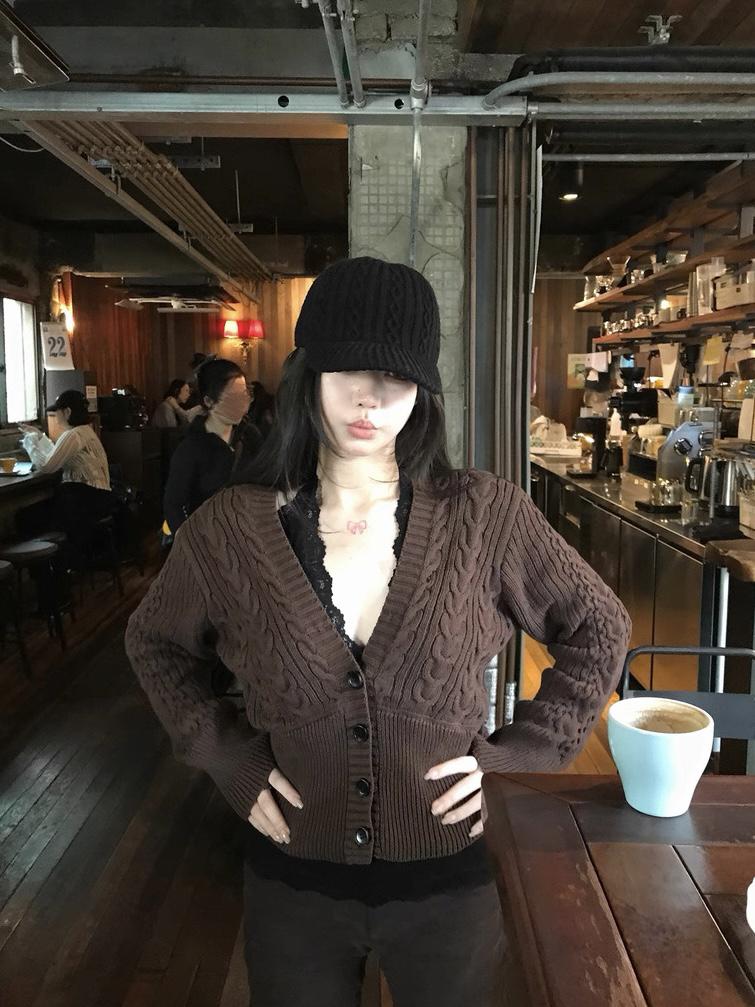 3. 【C8380】美式復古美拉徳咖色辣妹性感絞花修身外套保暖毛衣