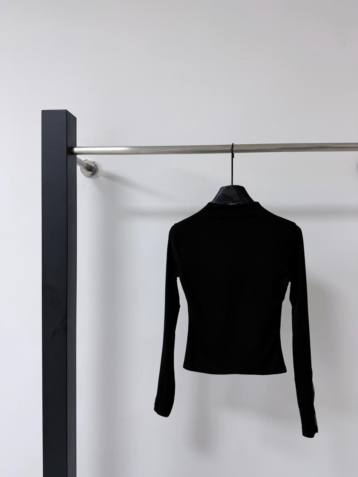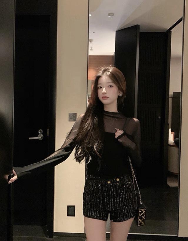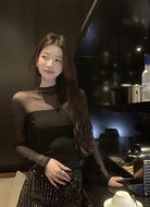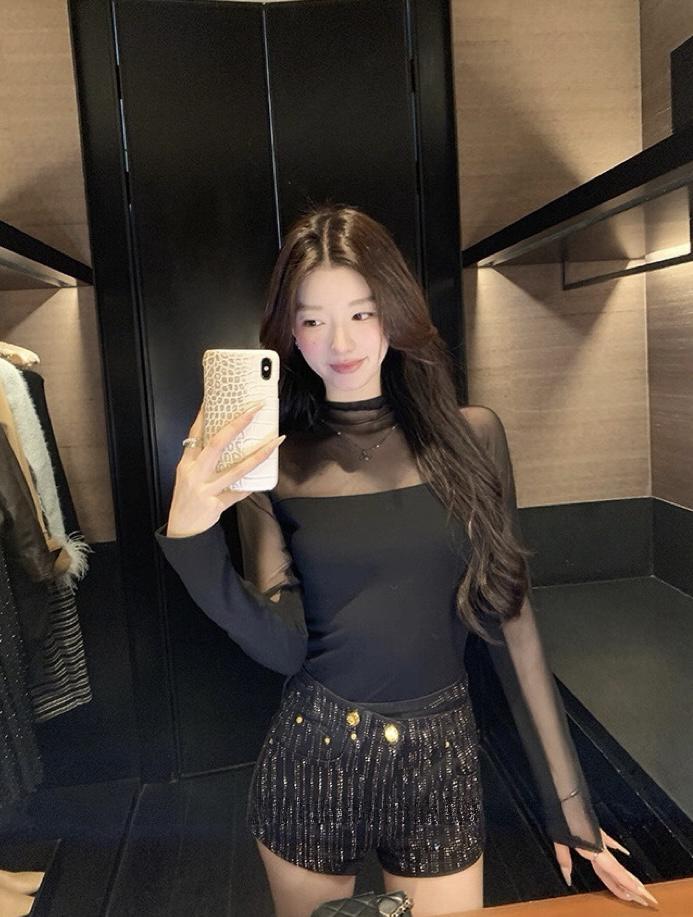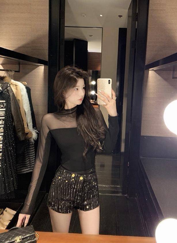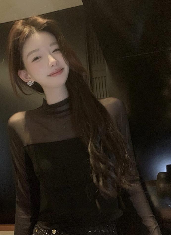 3. 【C8393】純欲辣妹小女人立領網紗拼接假兩件長袖T恤小衫