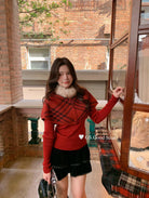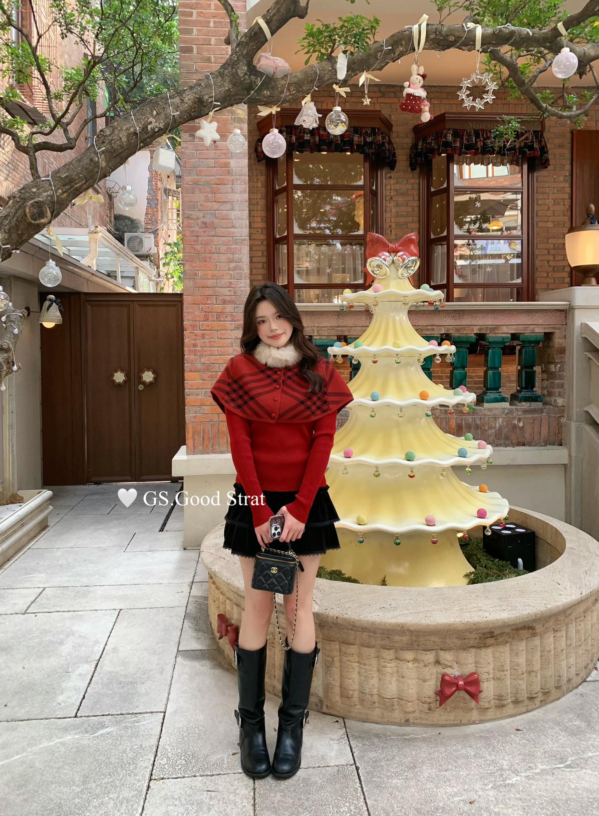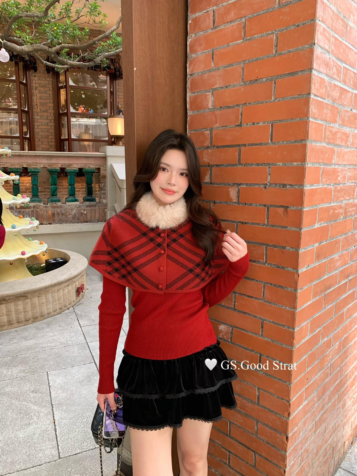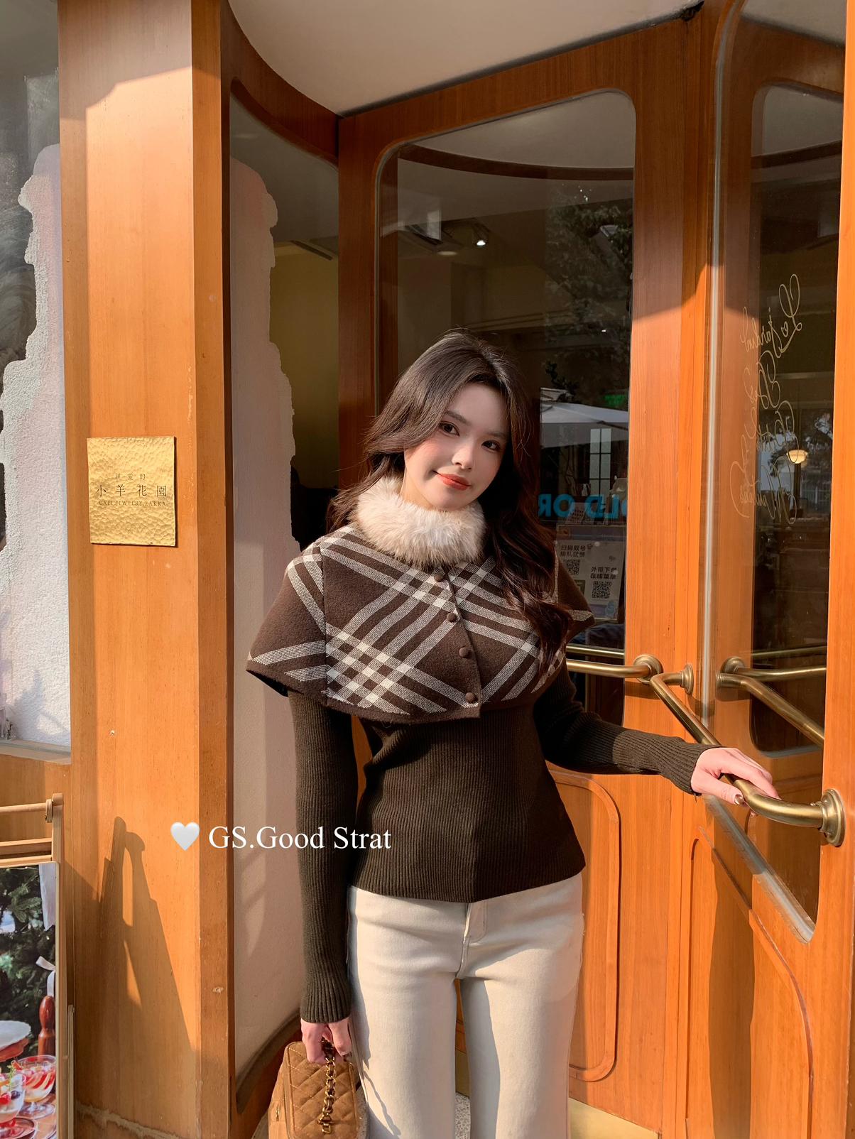 【C8407】爆單了人氣新款*典藏富家女~冬季復古氣質格紋斗篷披肩+針織衫套裝(配可拆卸毛領)