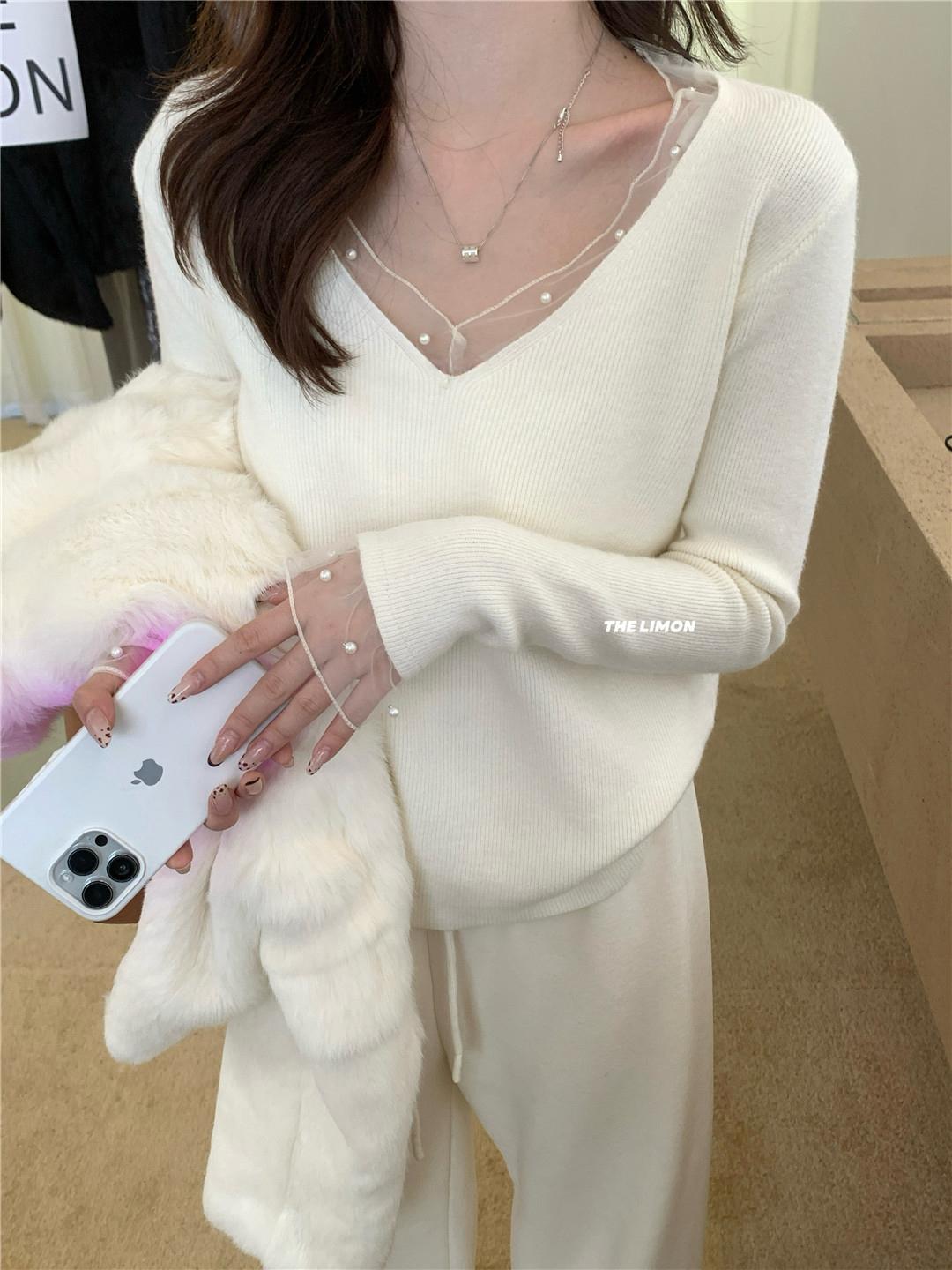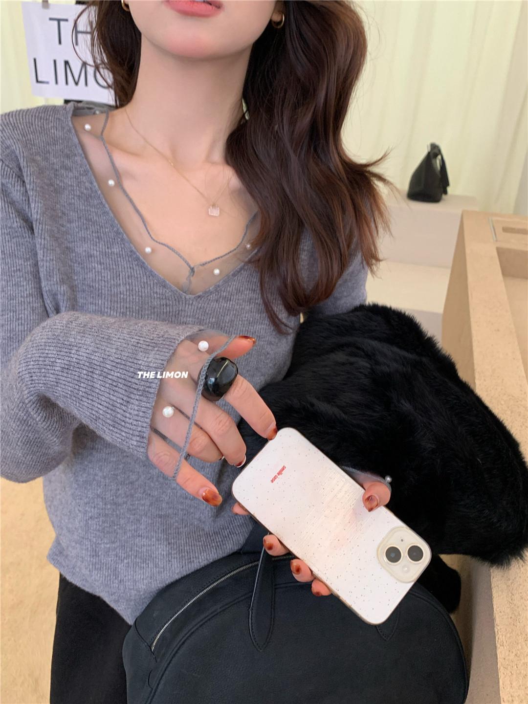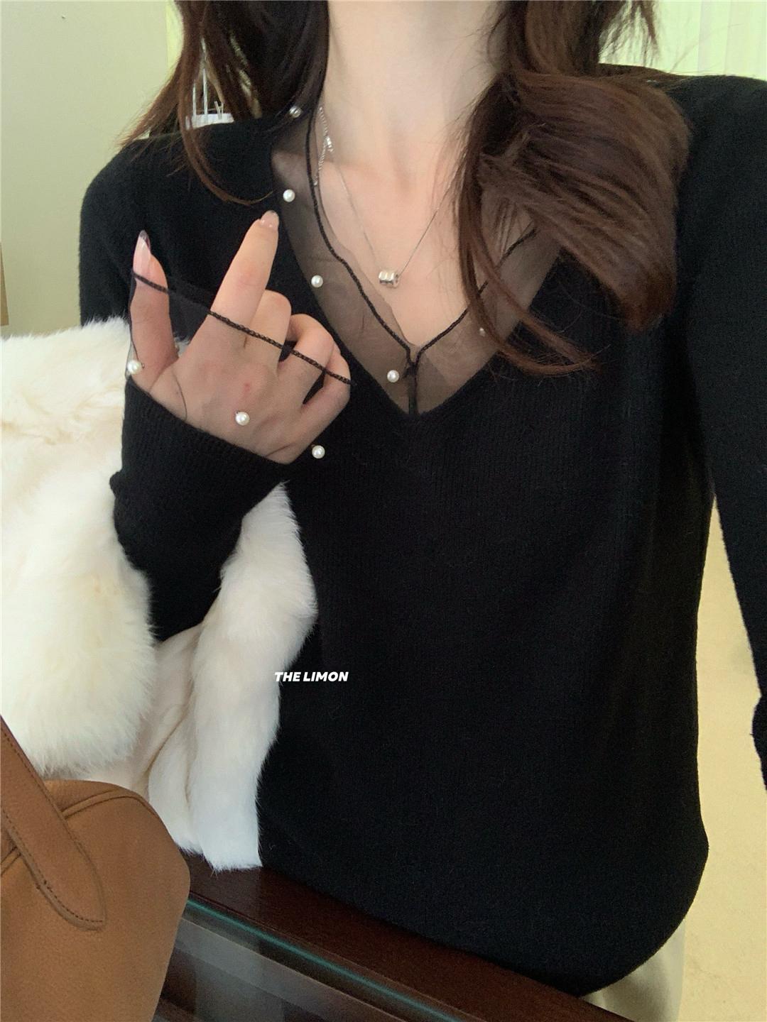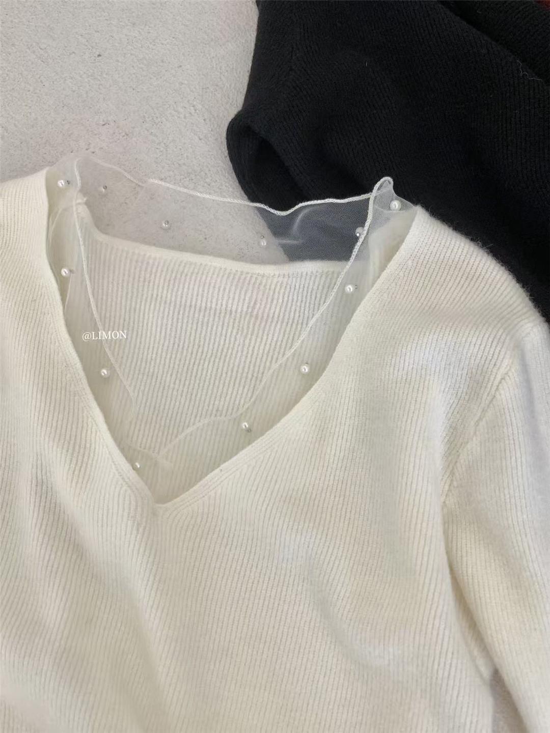 【C8414】法式復古V領長袖網紗拼接珍珠點綴針織衫