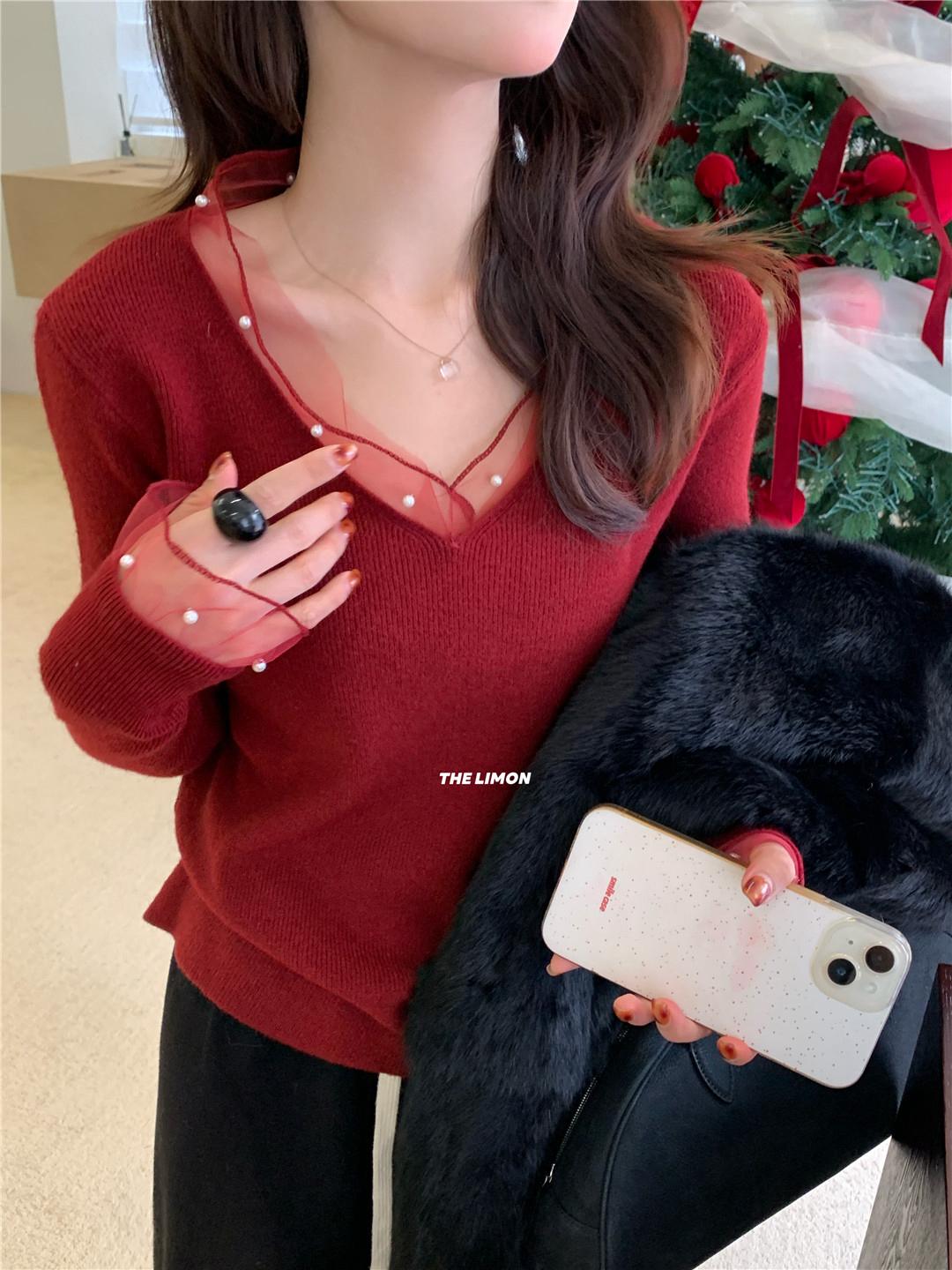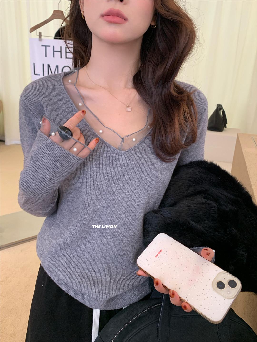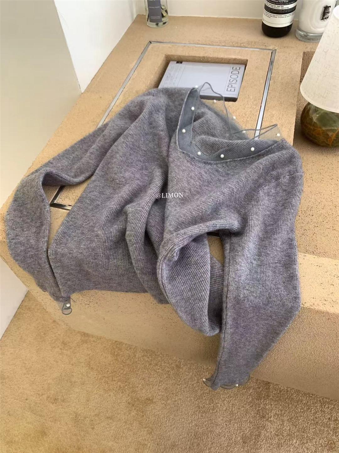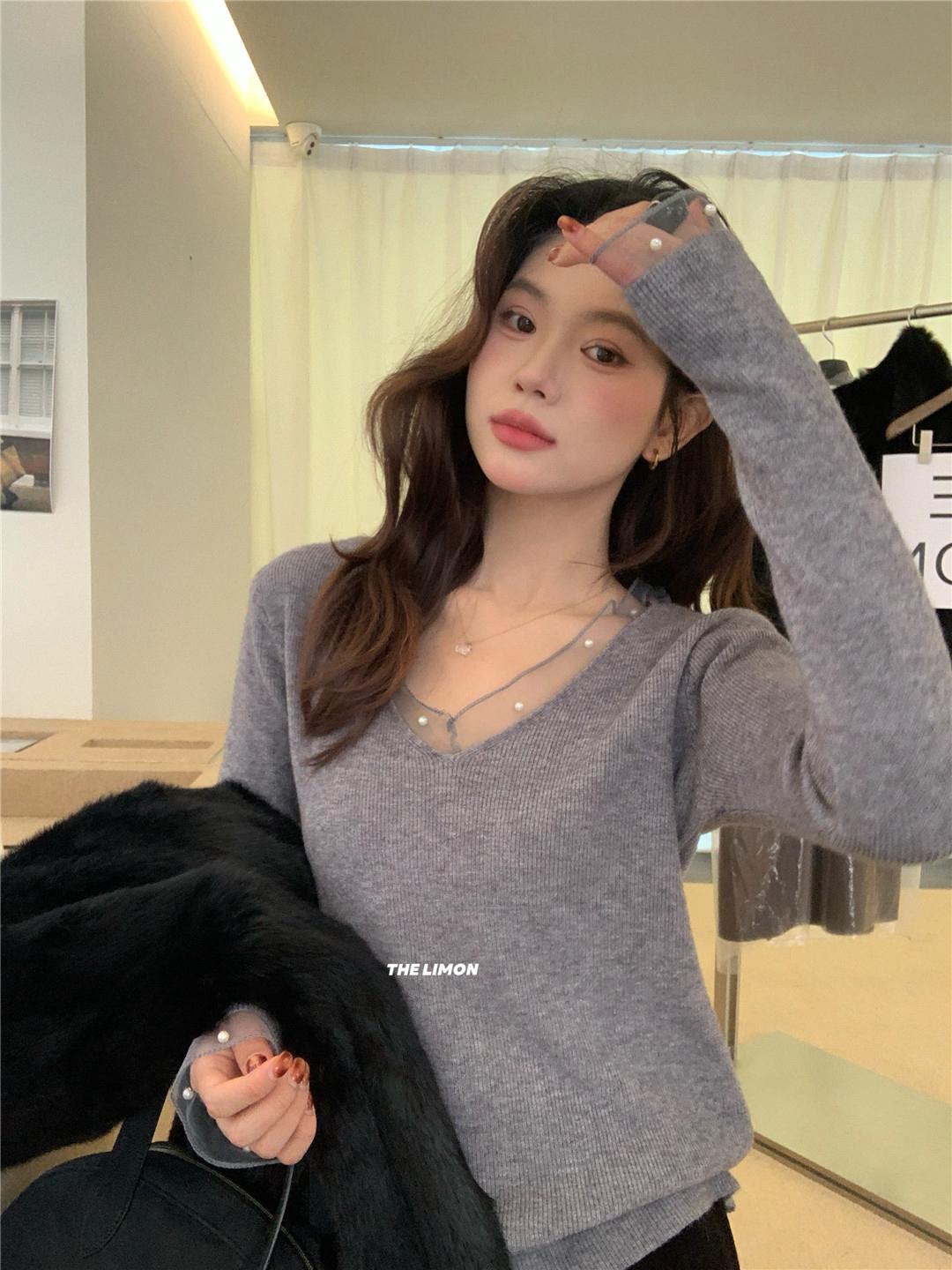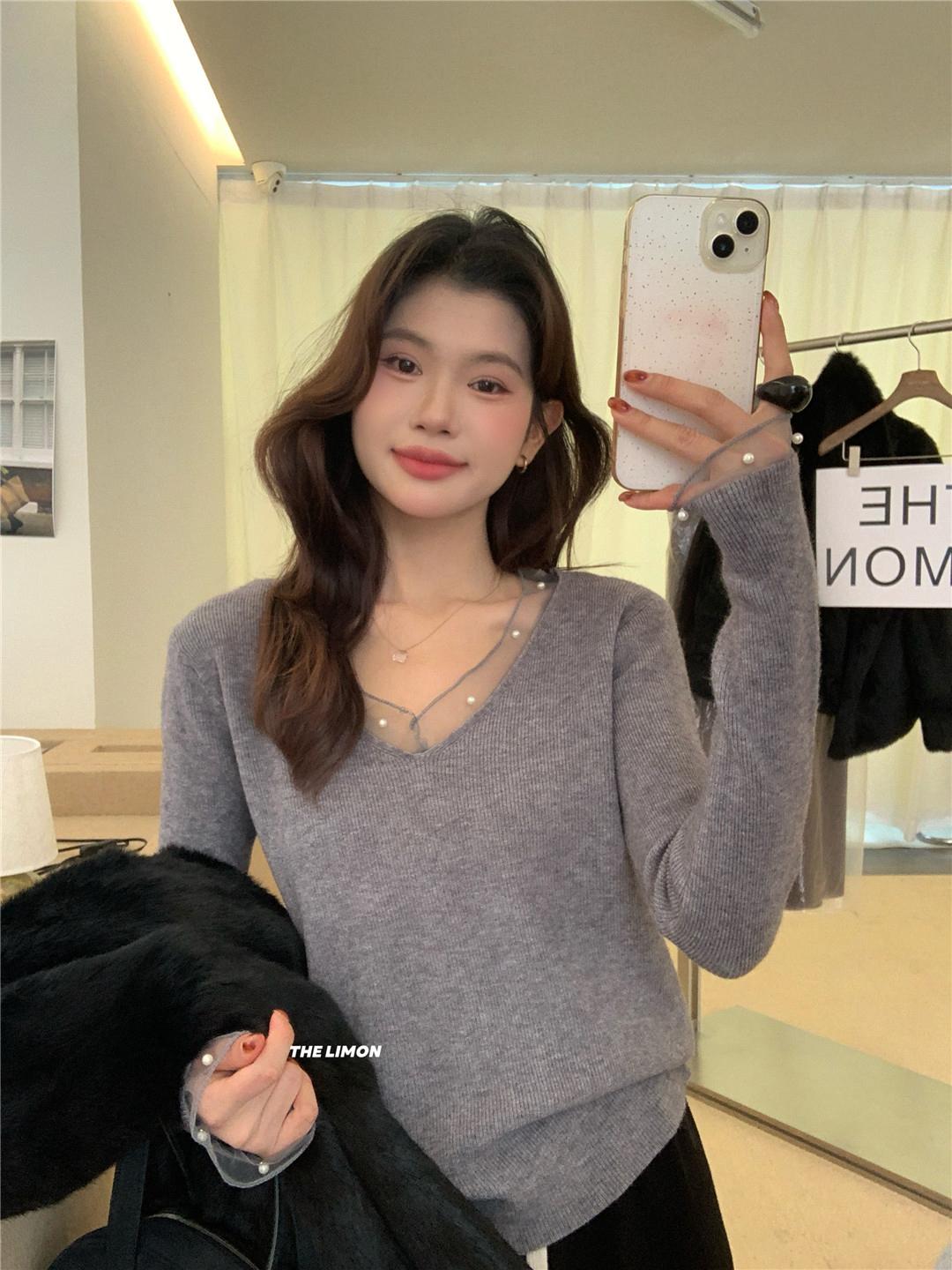 【C8414】法式復古V領長袖網紗拼接珍珠點綴針織衫