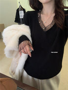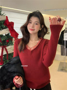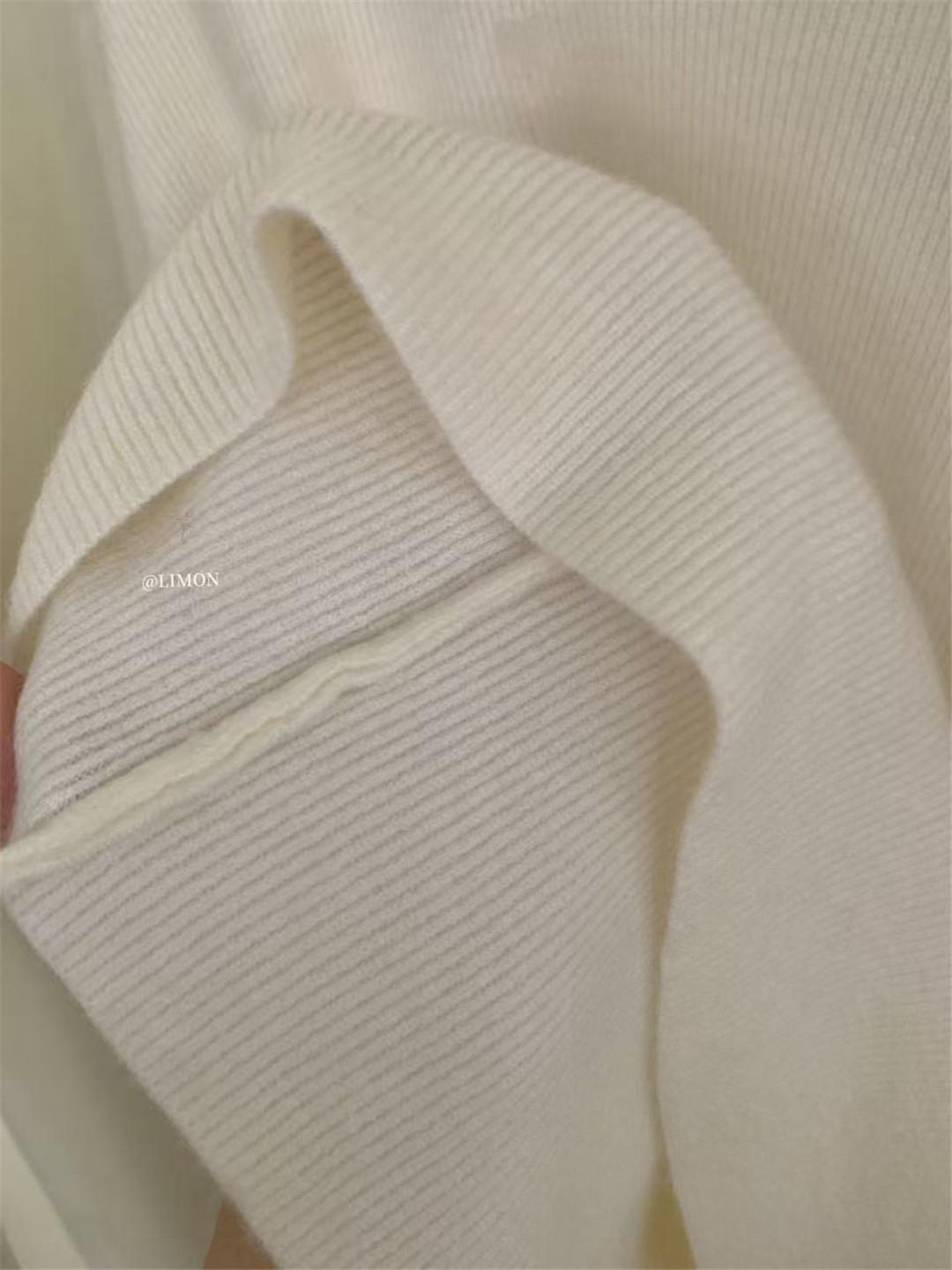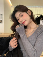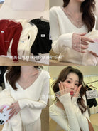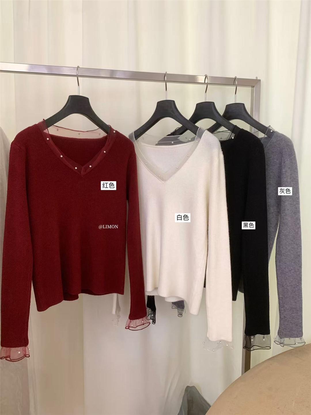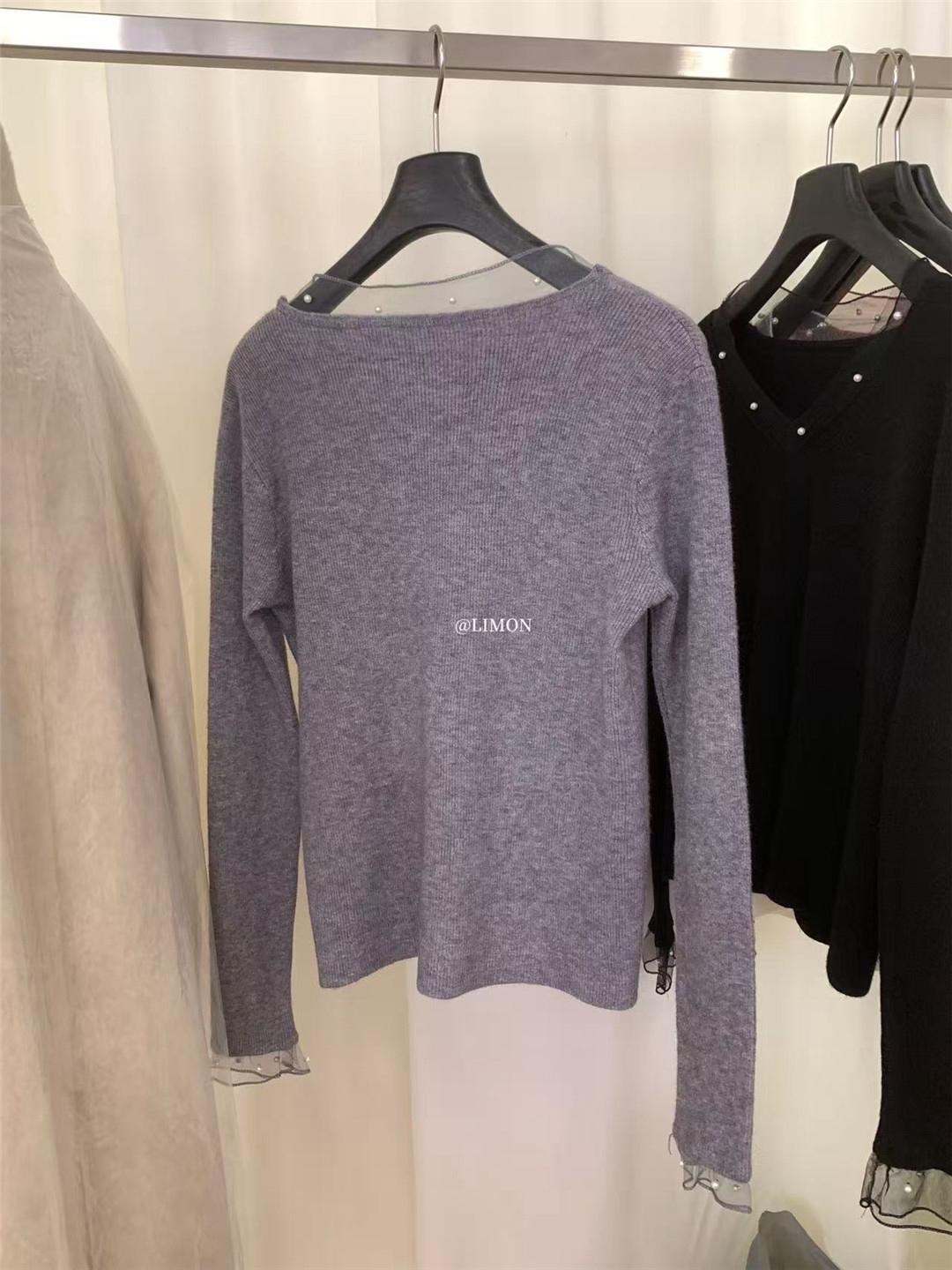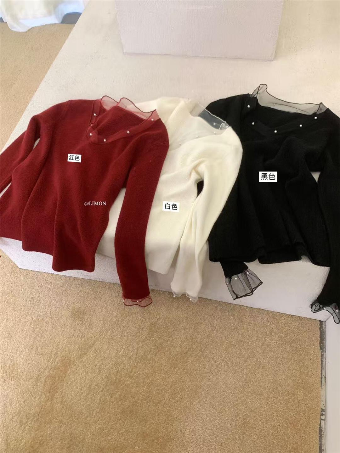 【C8414】法式復古V領長袖網紗拼接珍珠點綴針織衫