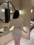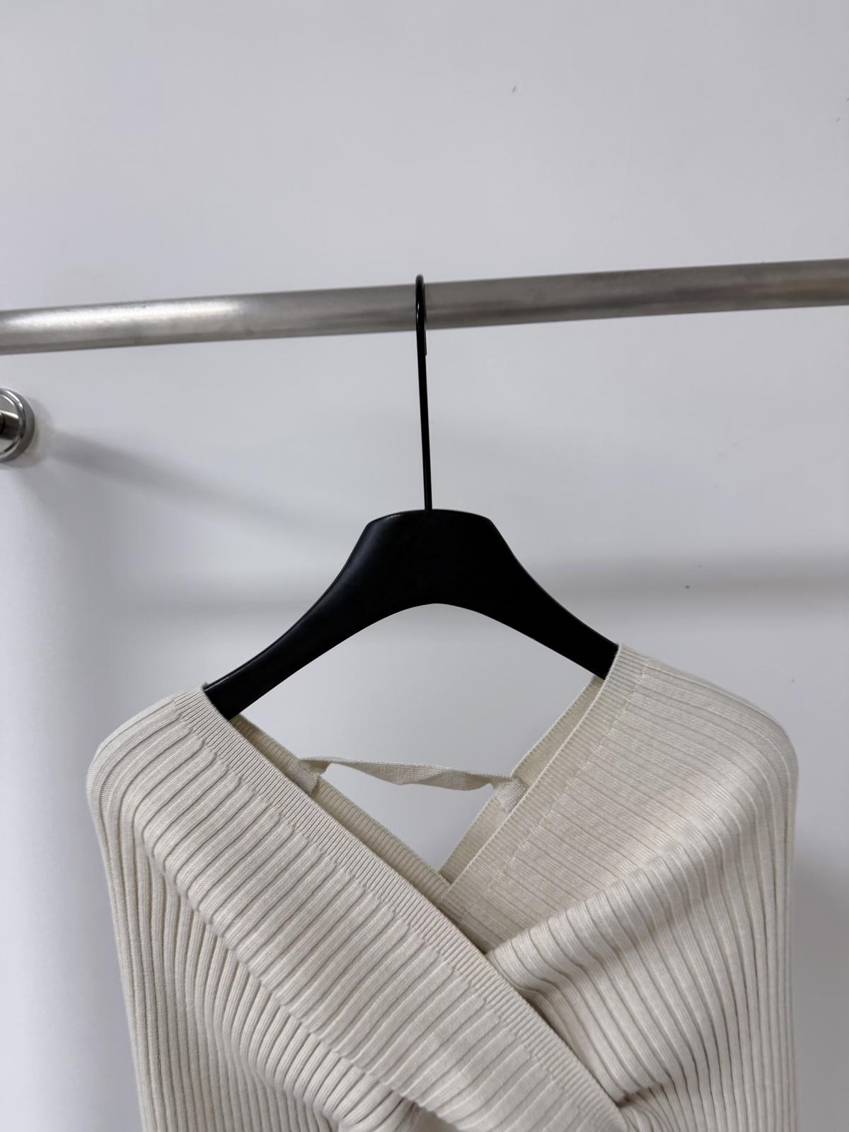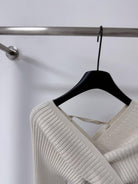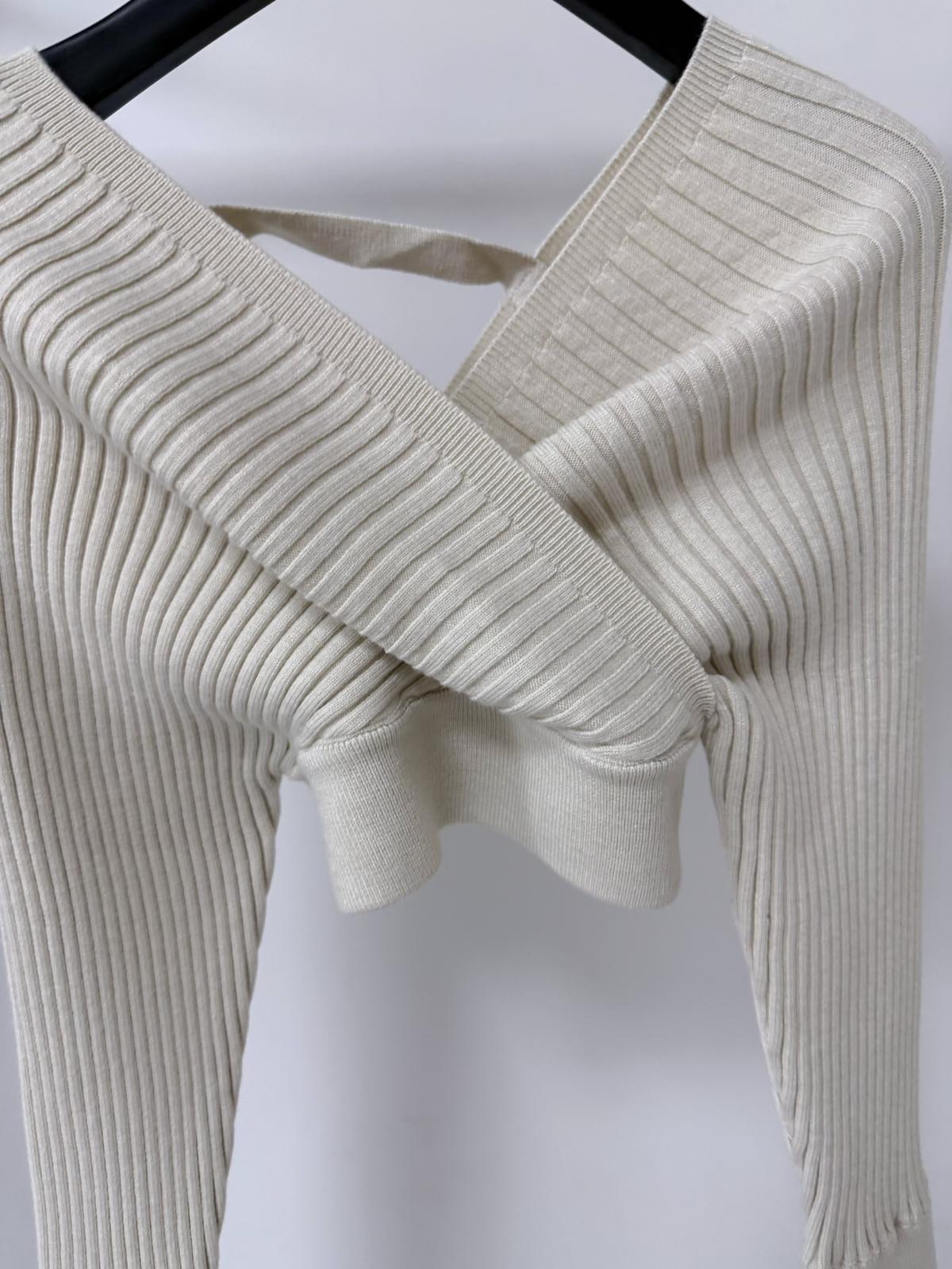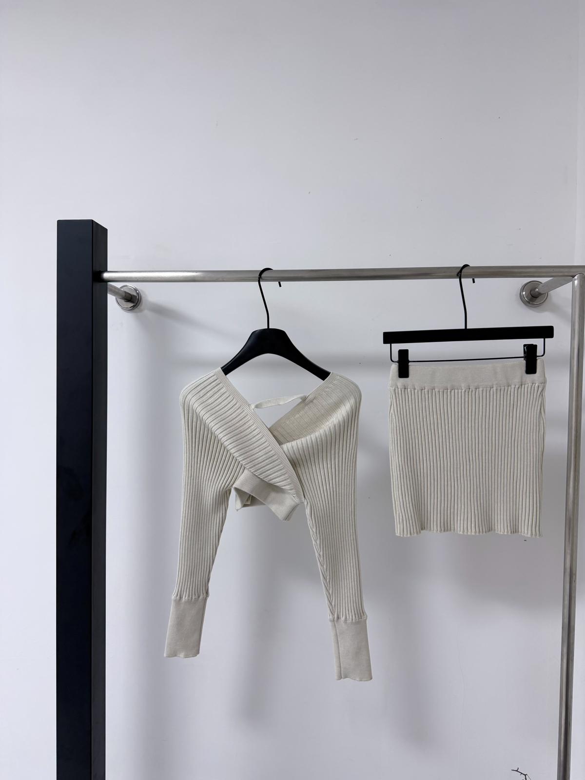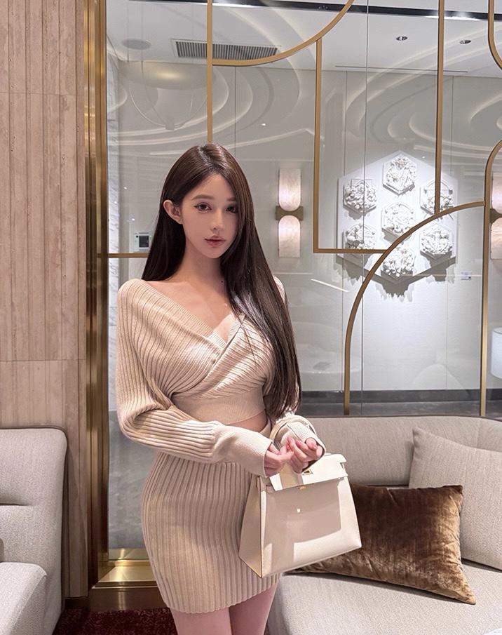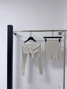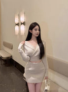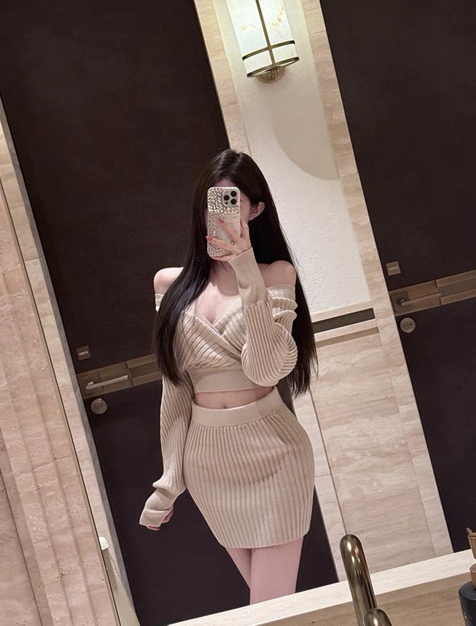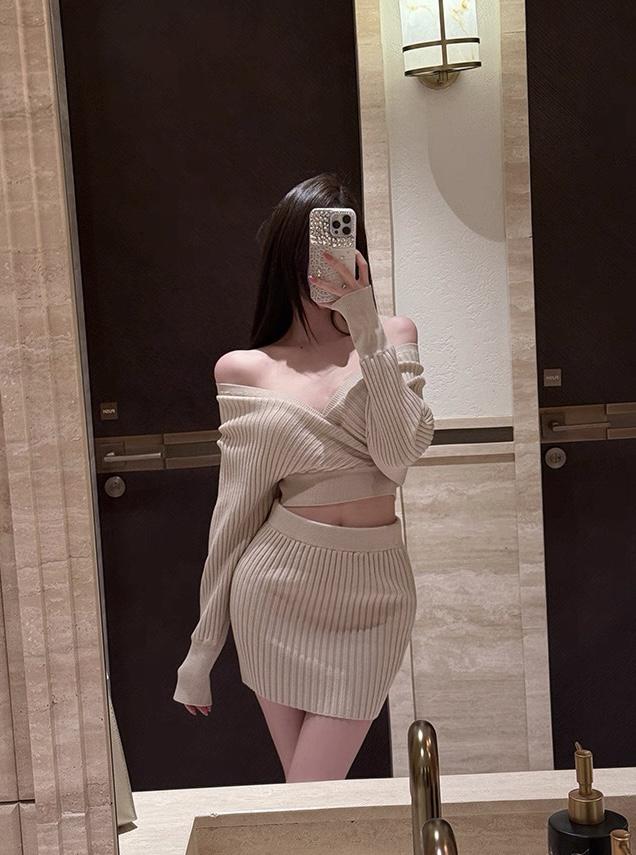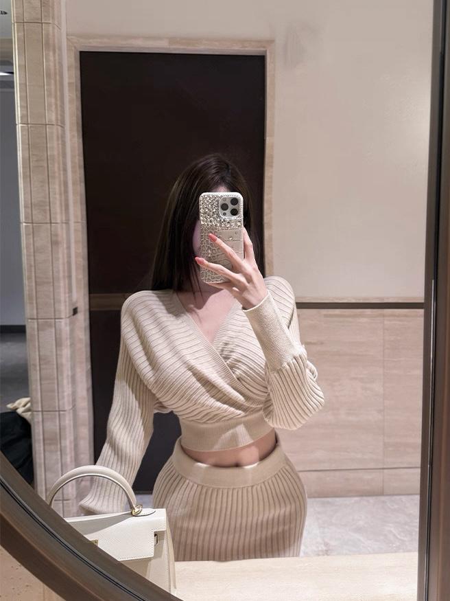 【C8415】韓女純欲小女人交叉V領坑條紋針織衫+高腰包臀針織半身裙套裝