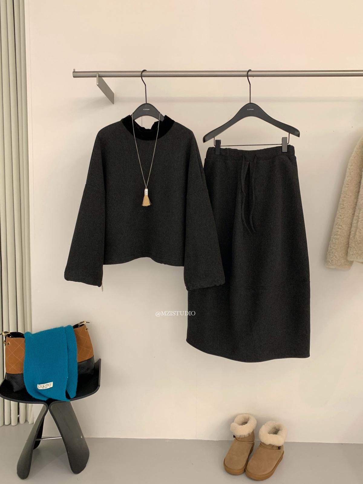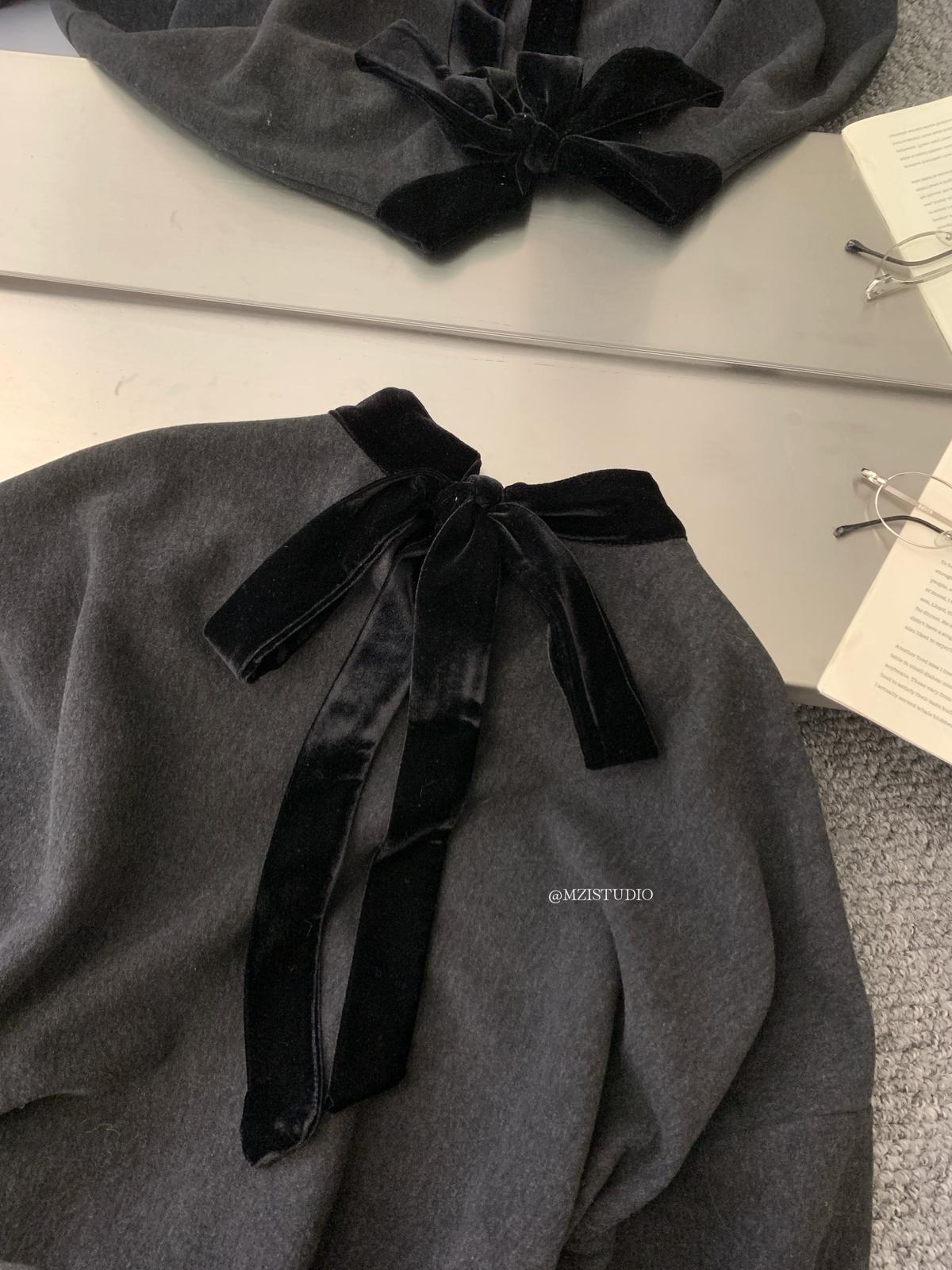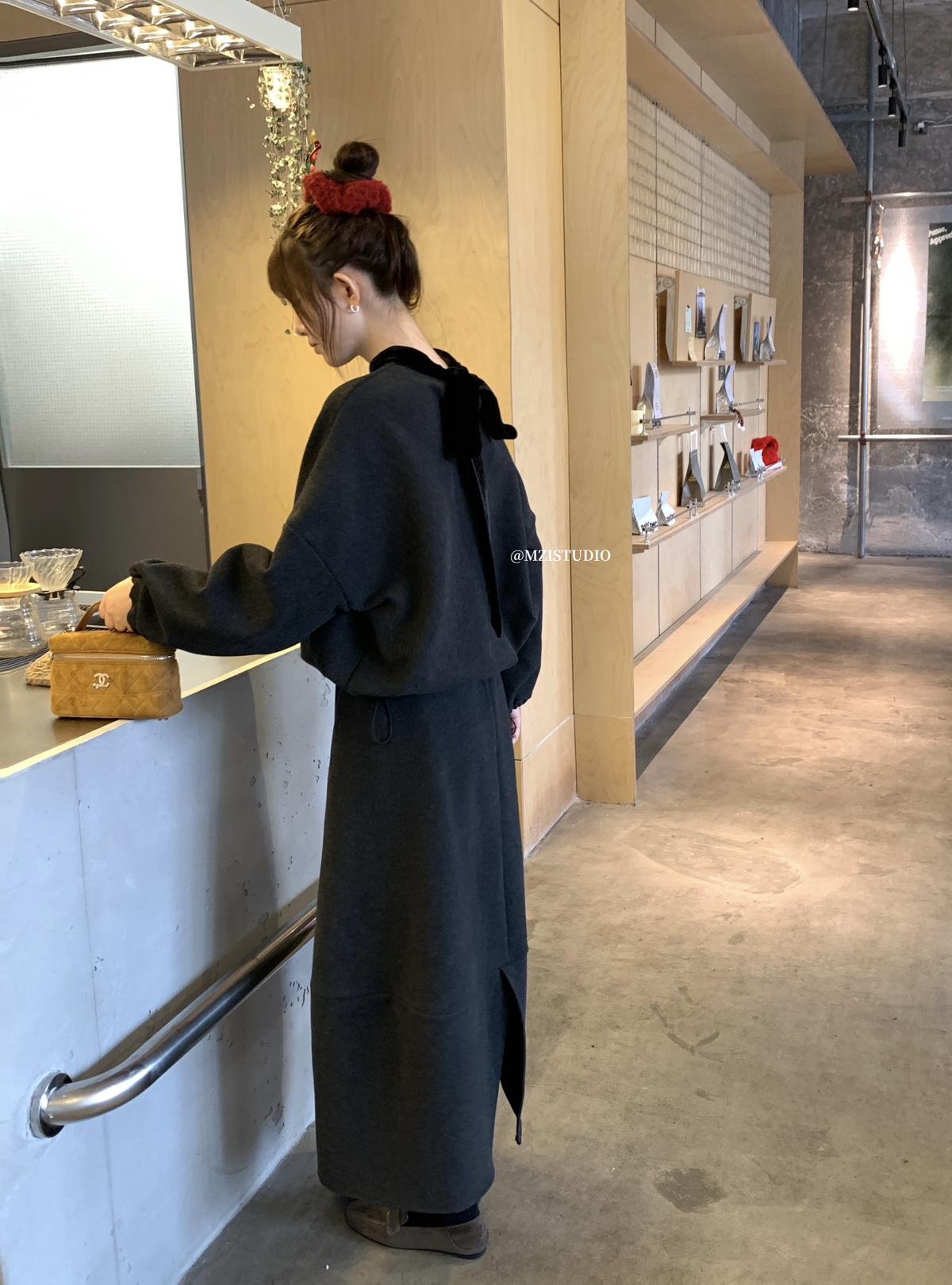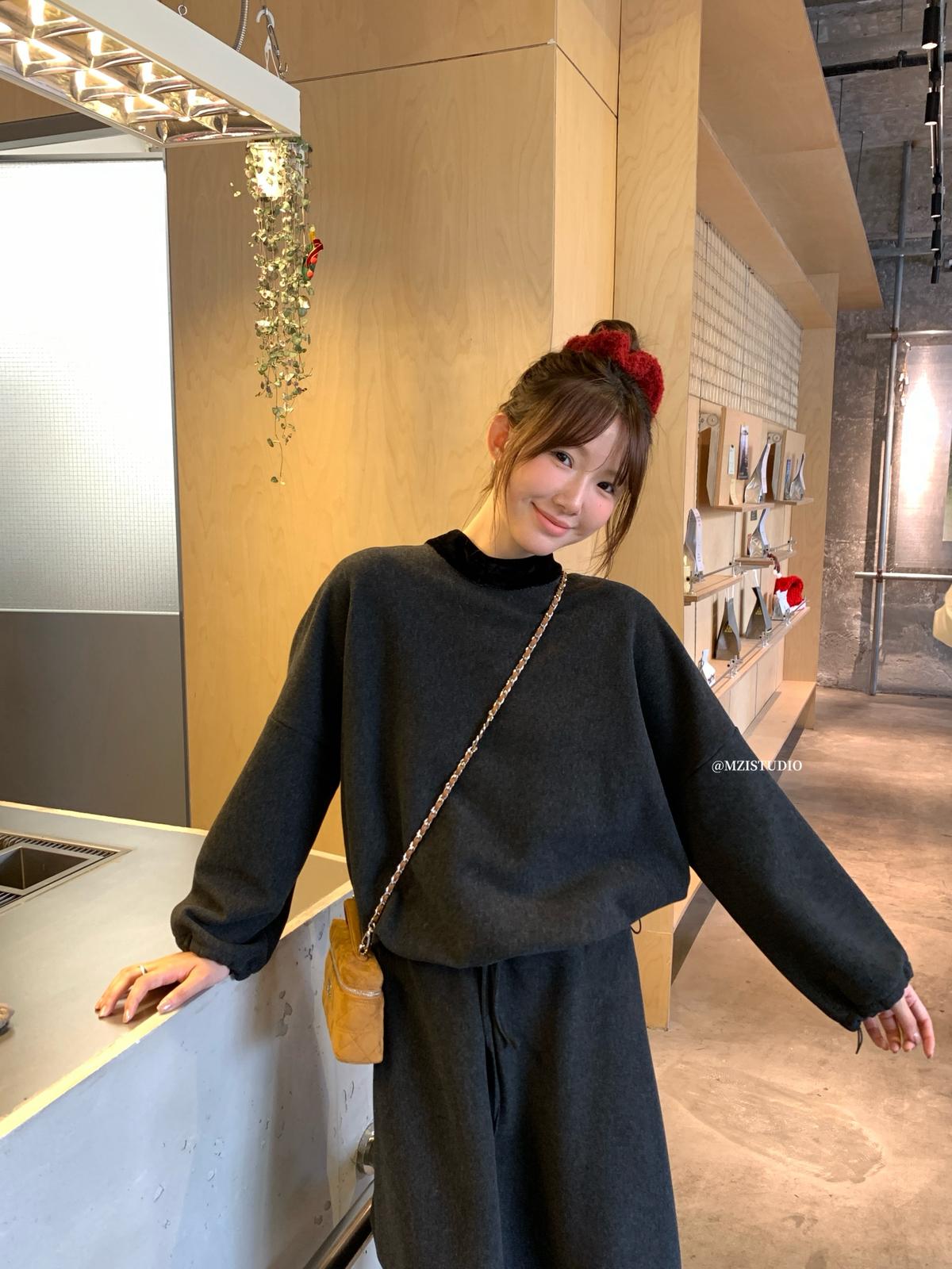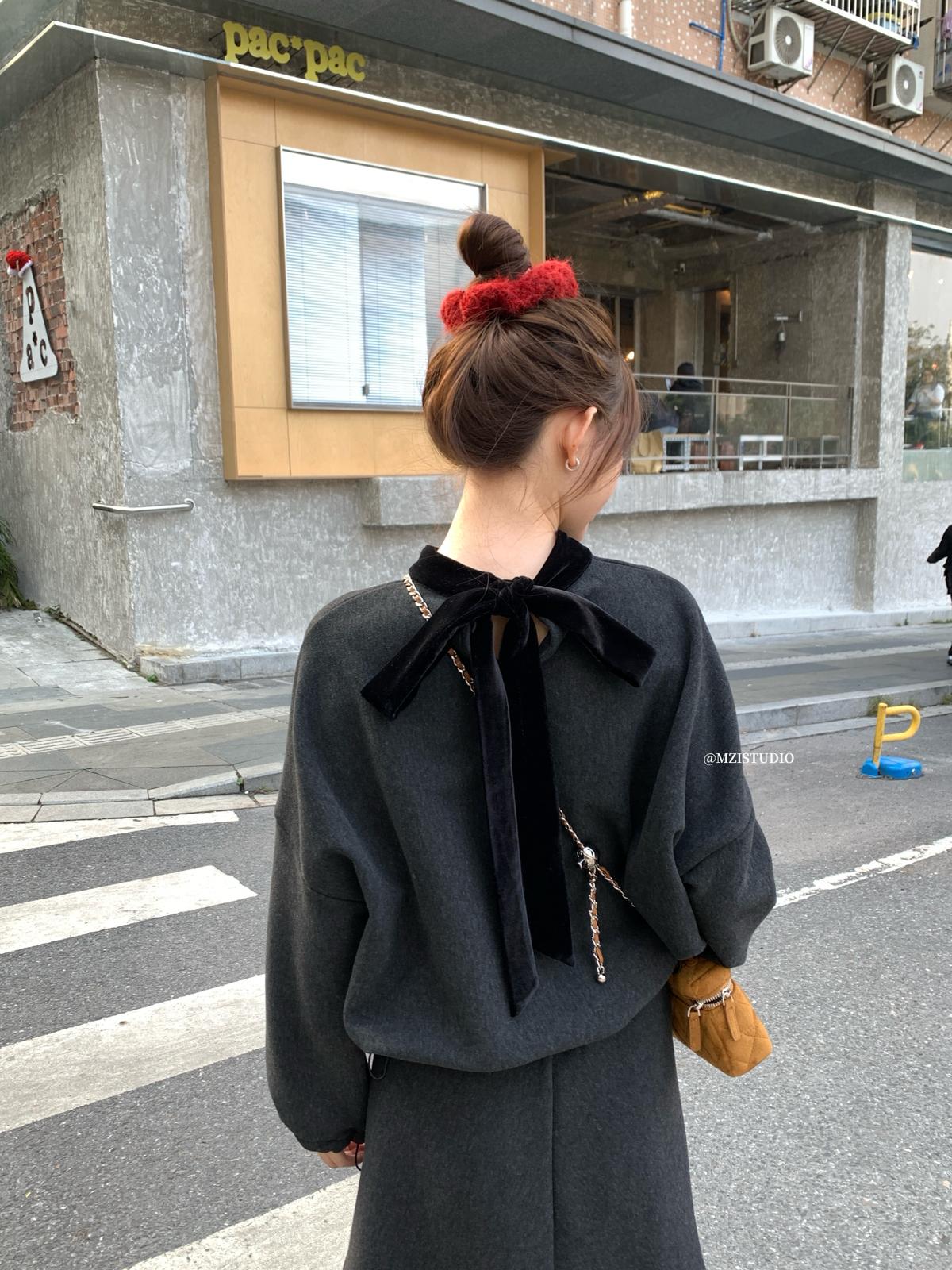 【C8417】精緻週末冬季絲絨蝴蝶結拼接寬鬆衛衣+抽繩簡約休閒半身裙套裝