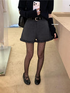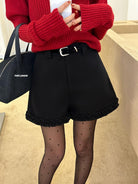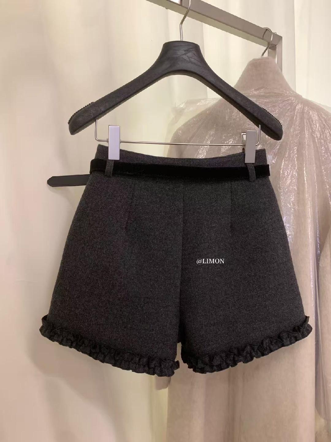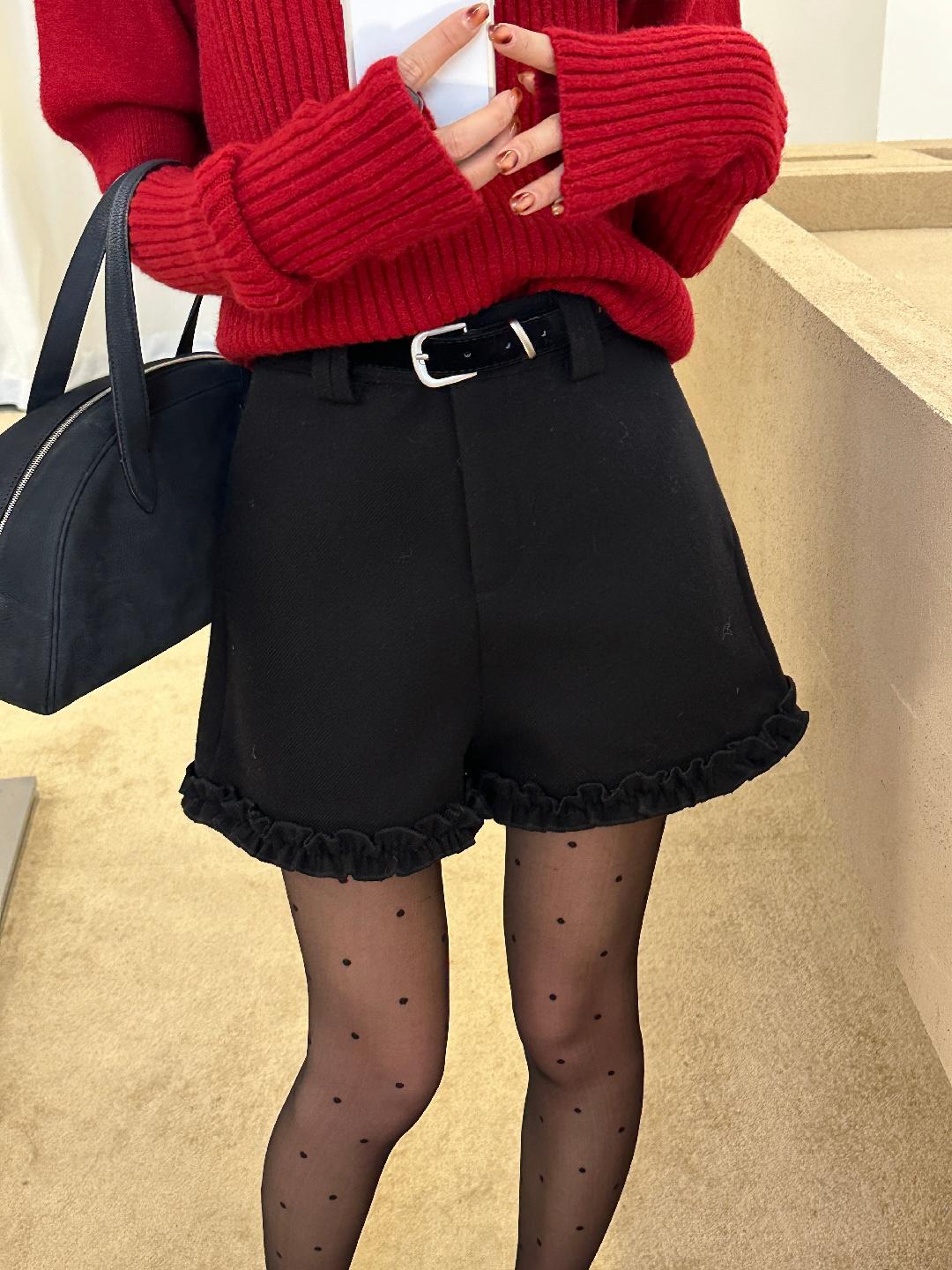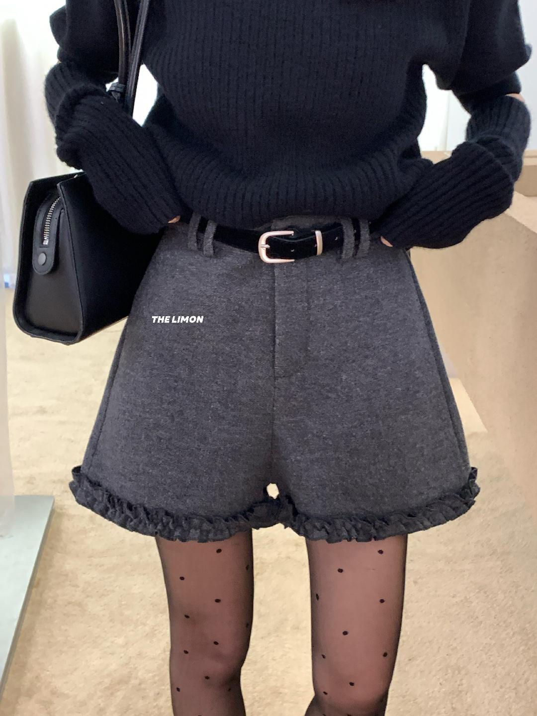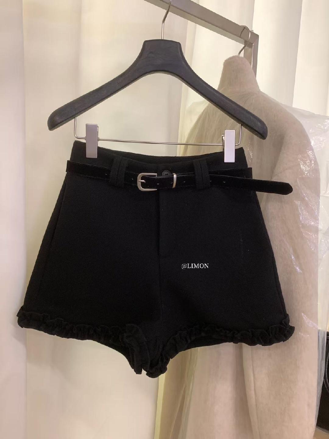 【C8423】時髦百搭毛呢木耳邊高腰顯瘦休閒短褲(配腰帶)