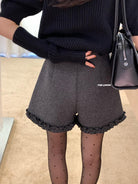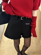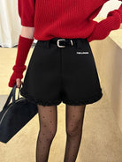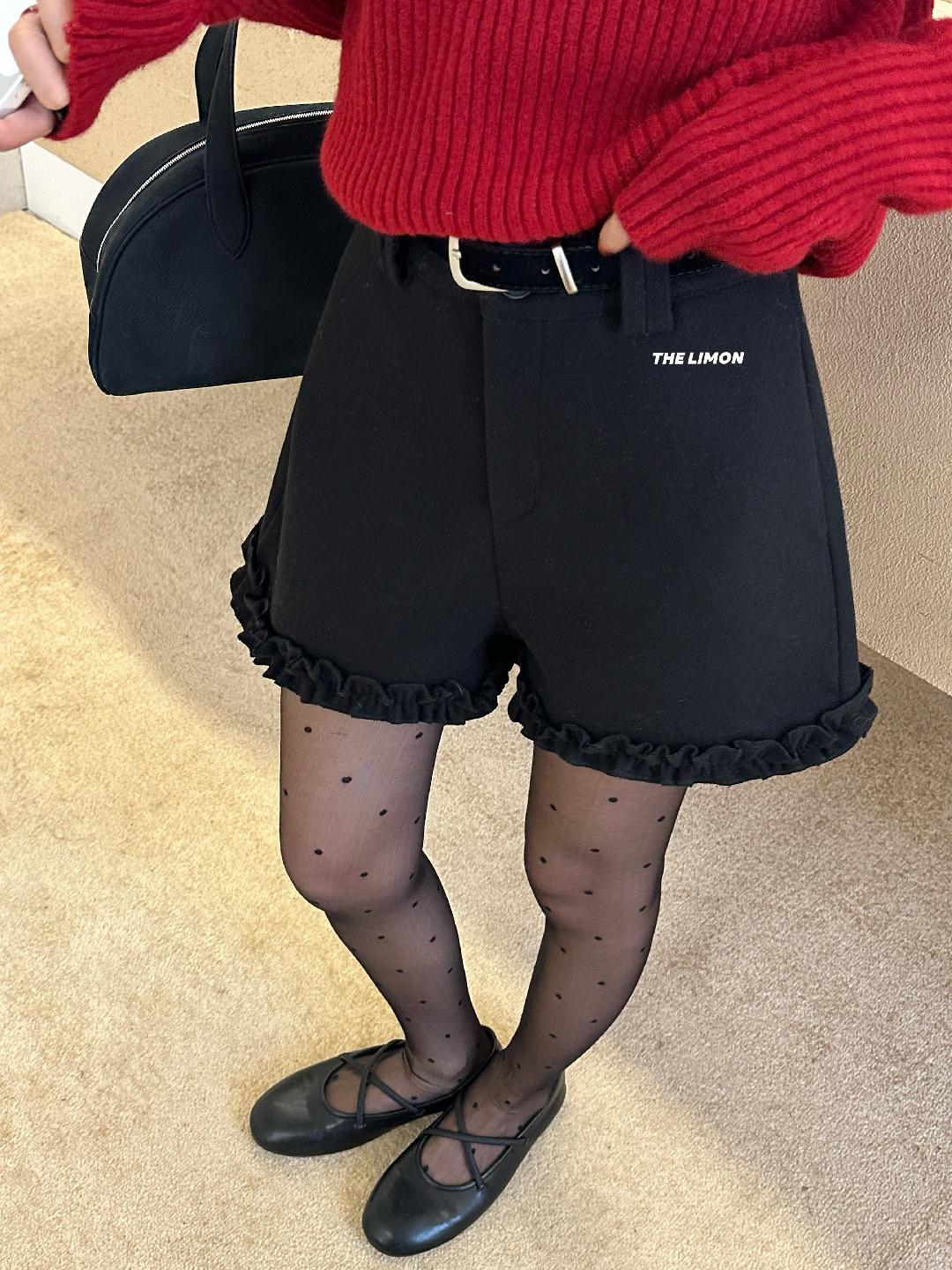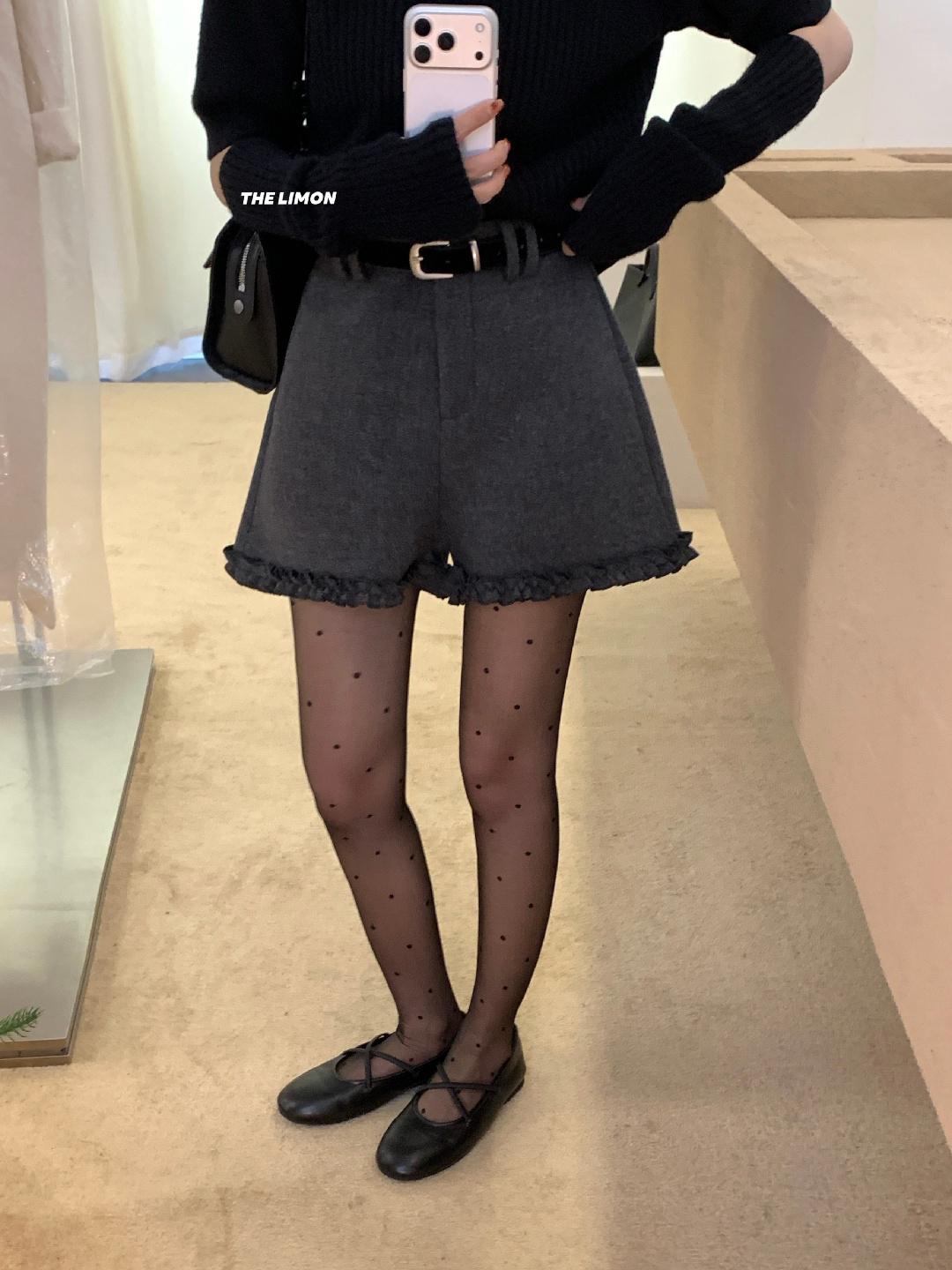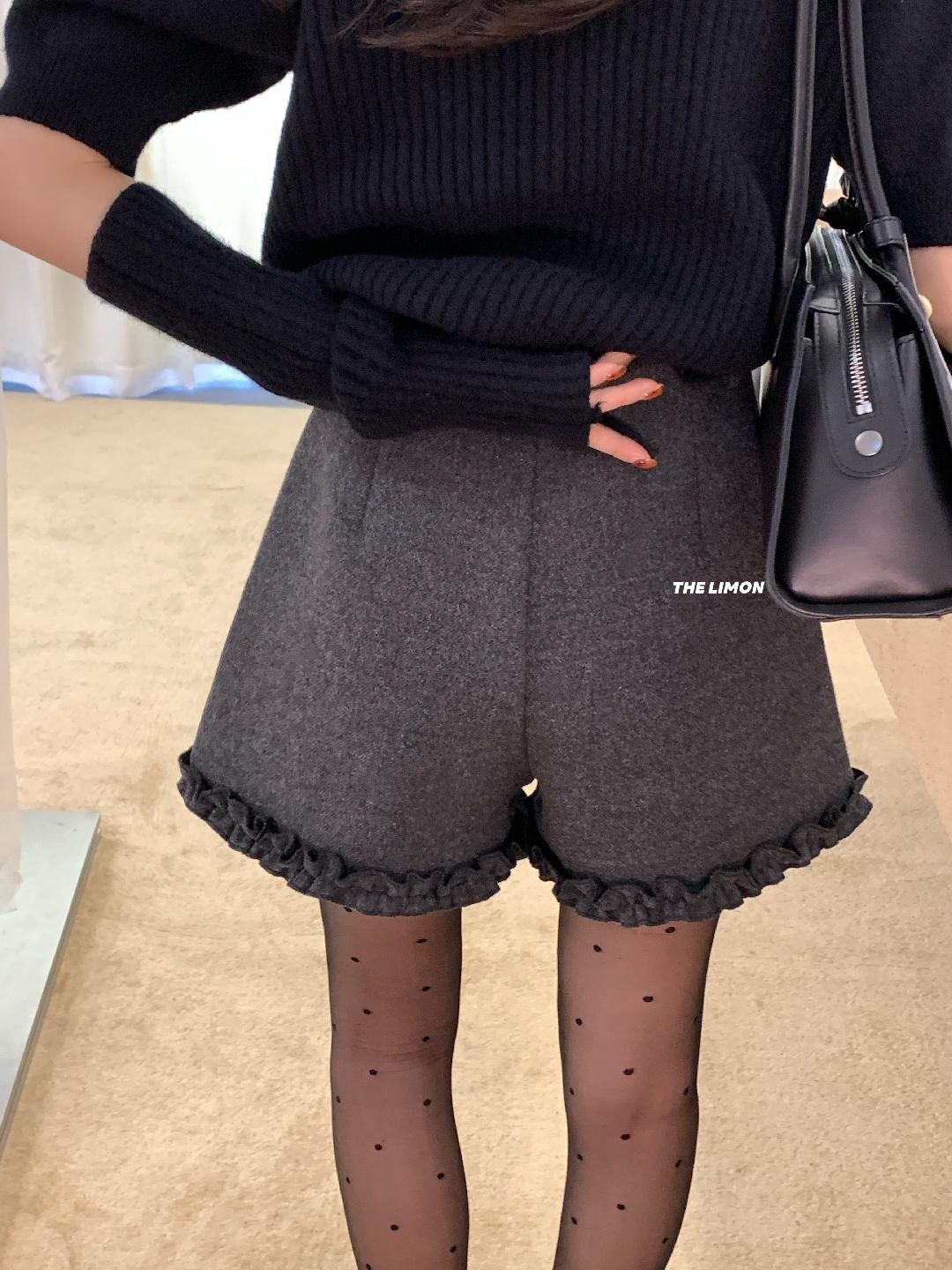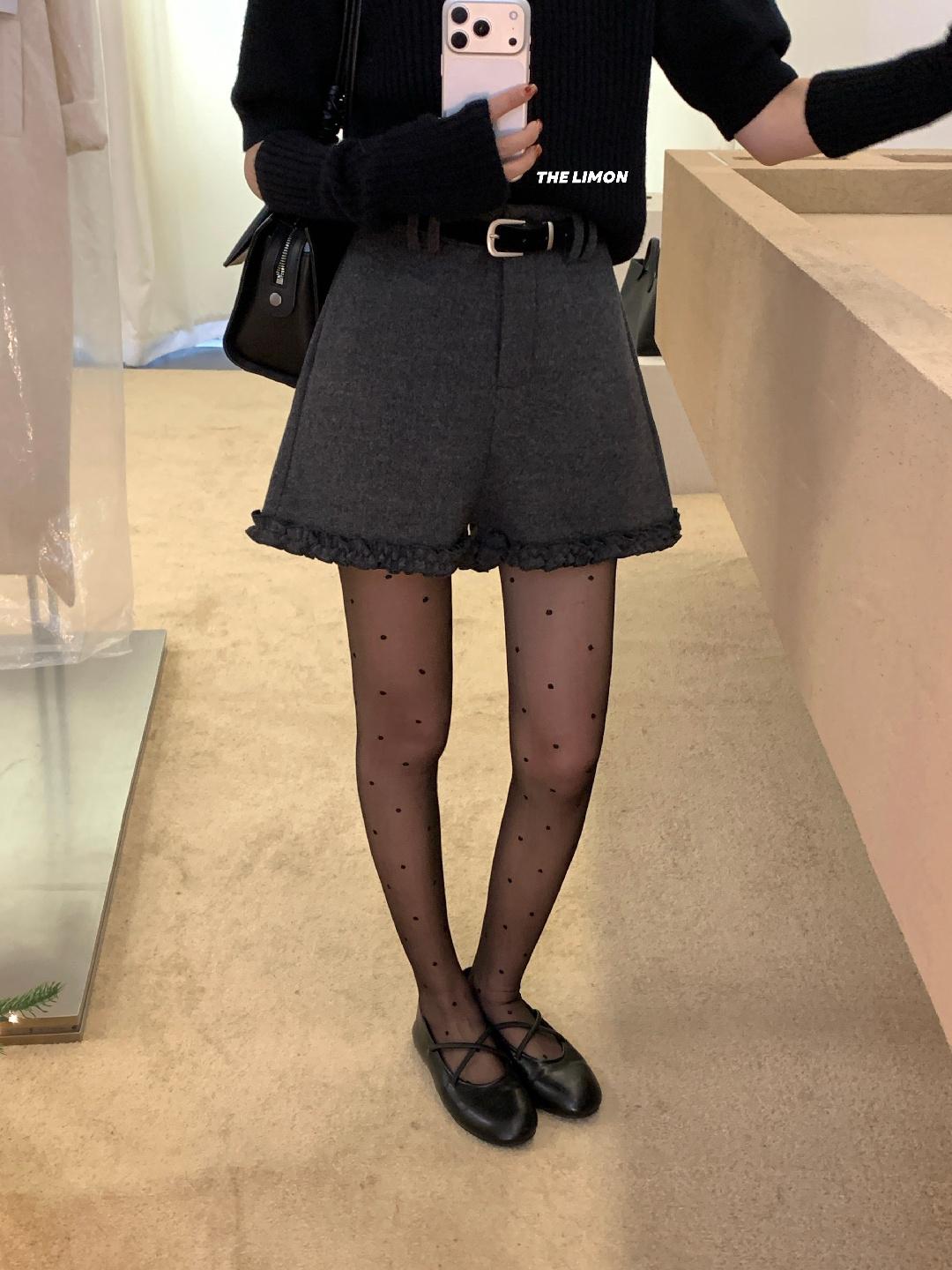 【C8423】時髦百搭毛呢木耳邊高腰顯瘦休閒短褲(配腰帶)