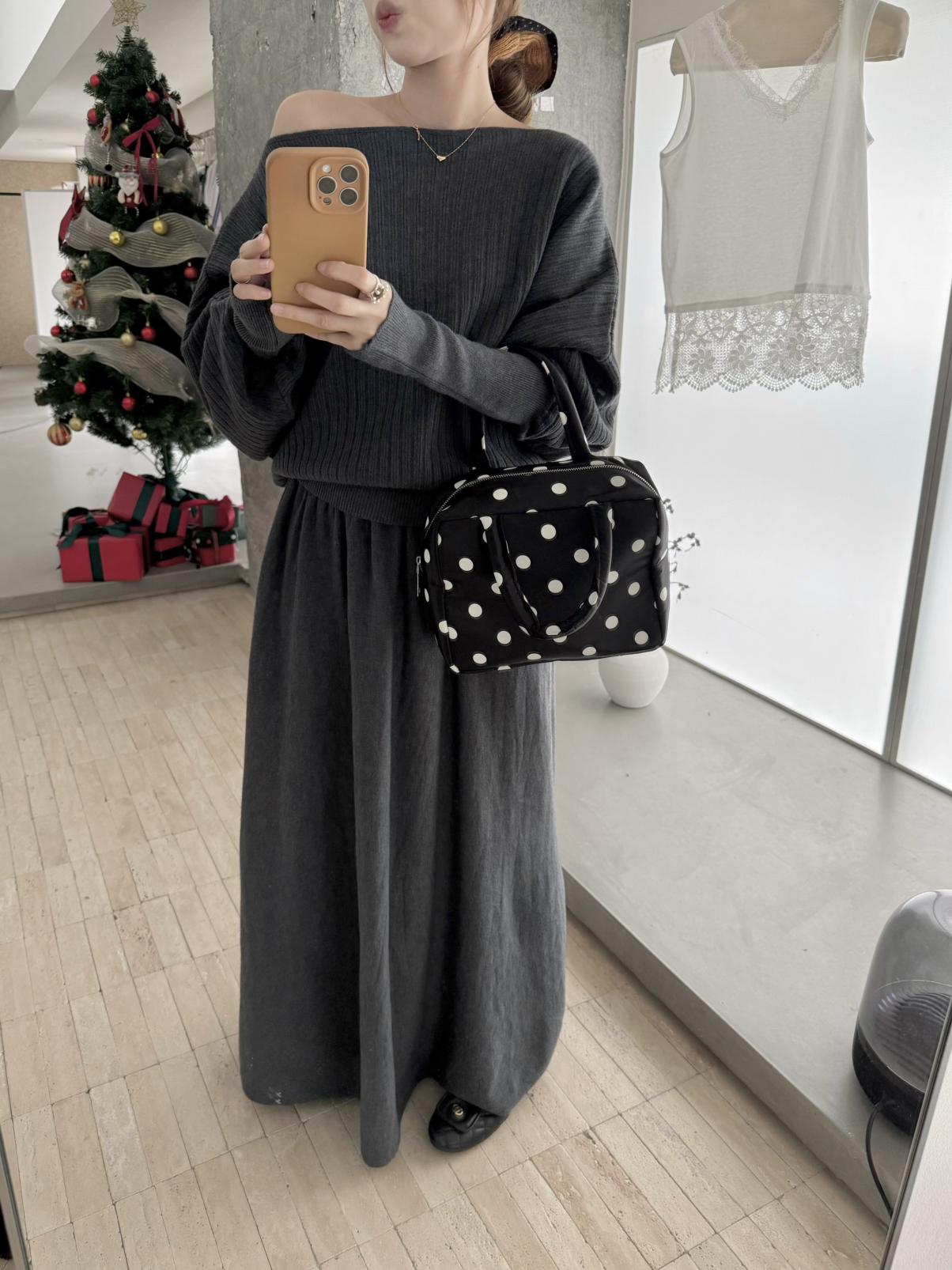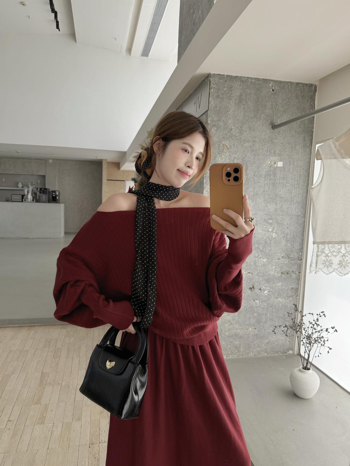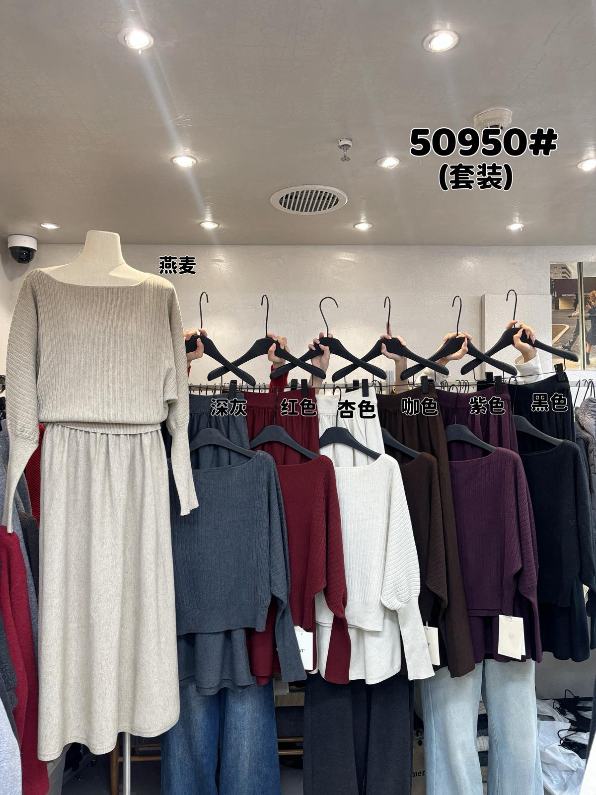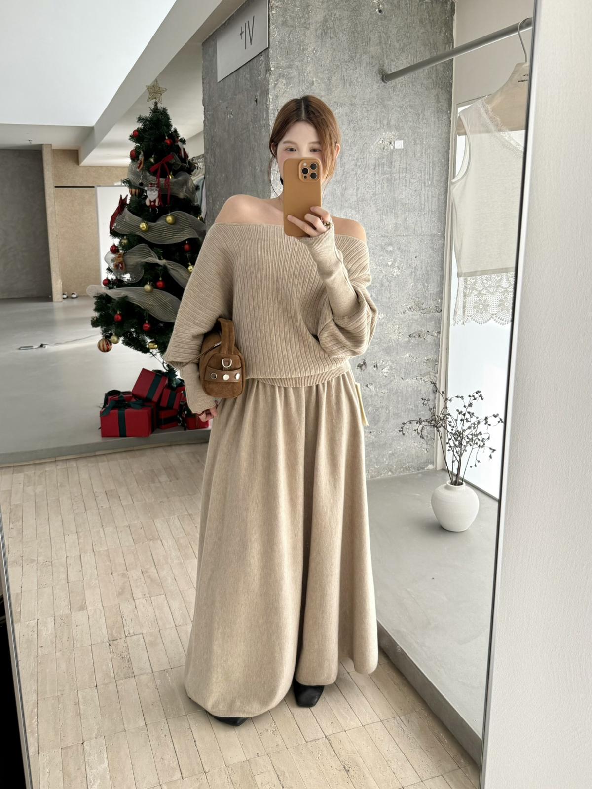 【C8432】氣質寬領針織衫+百搭顯瘦針織半身裙套裝