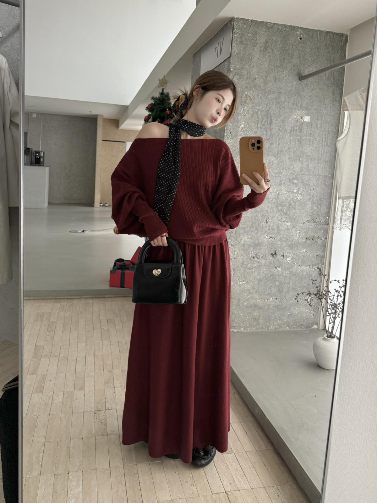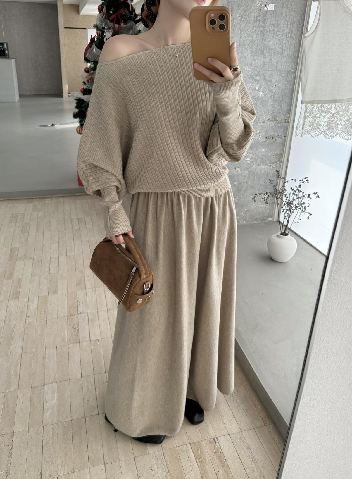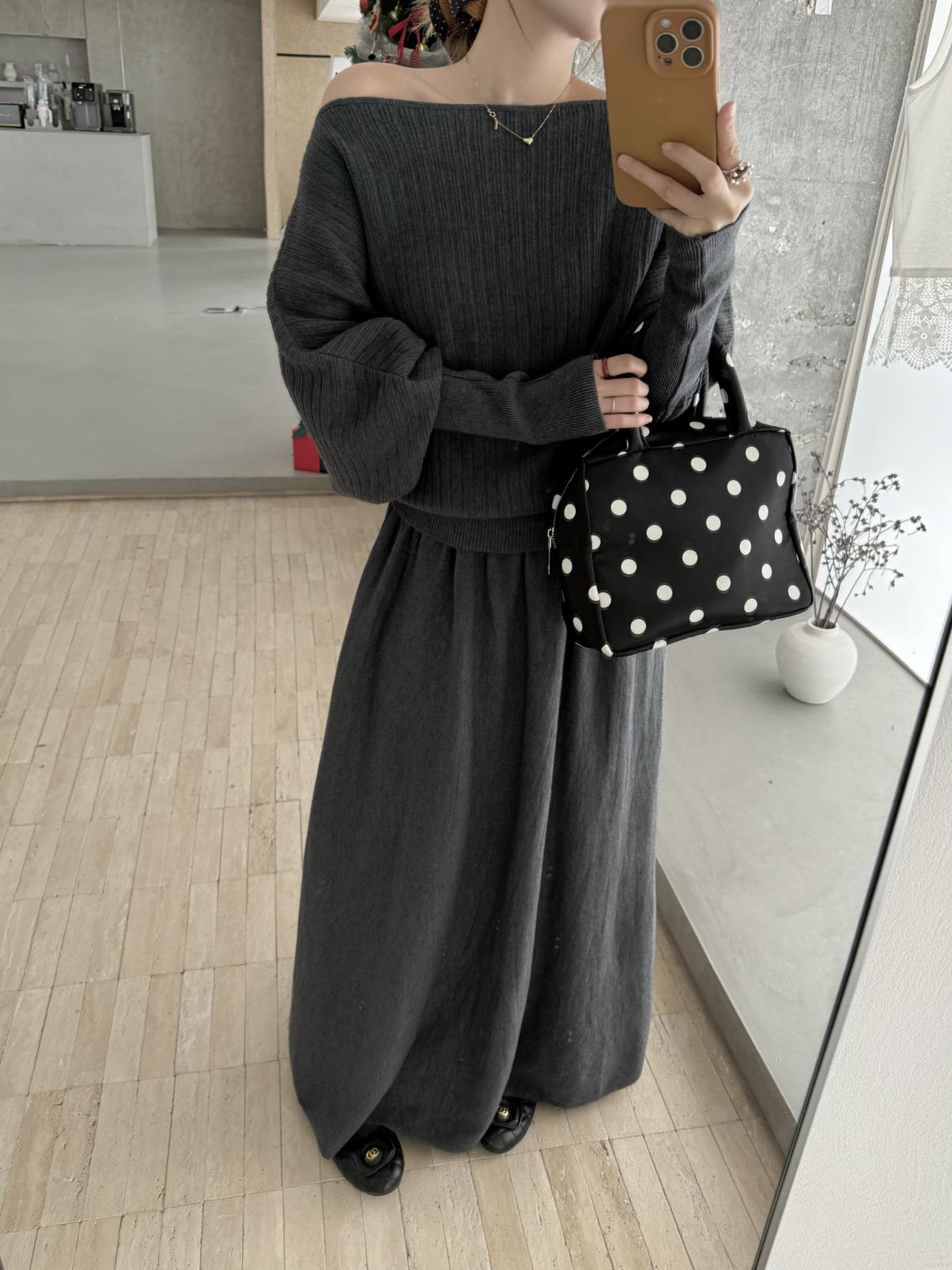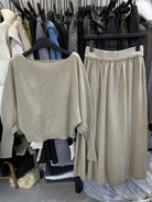 【C8432】氣質寬領針織衫+百搭顯瘦針織半身裙套裝