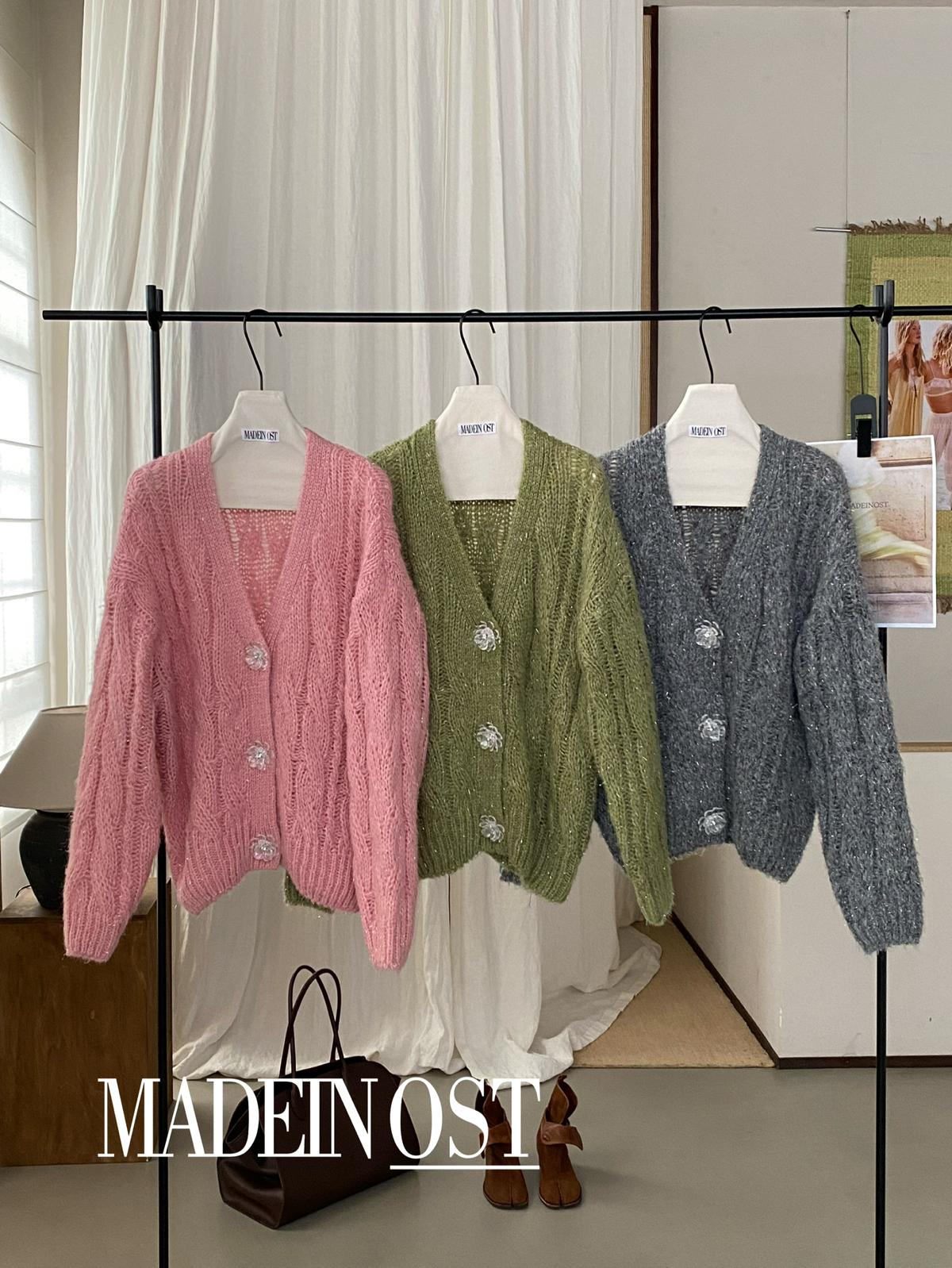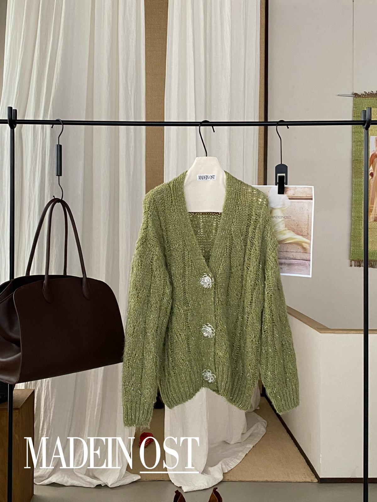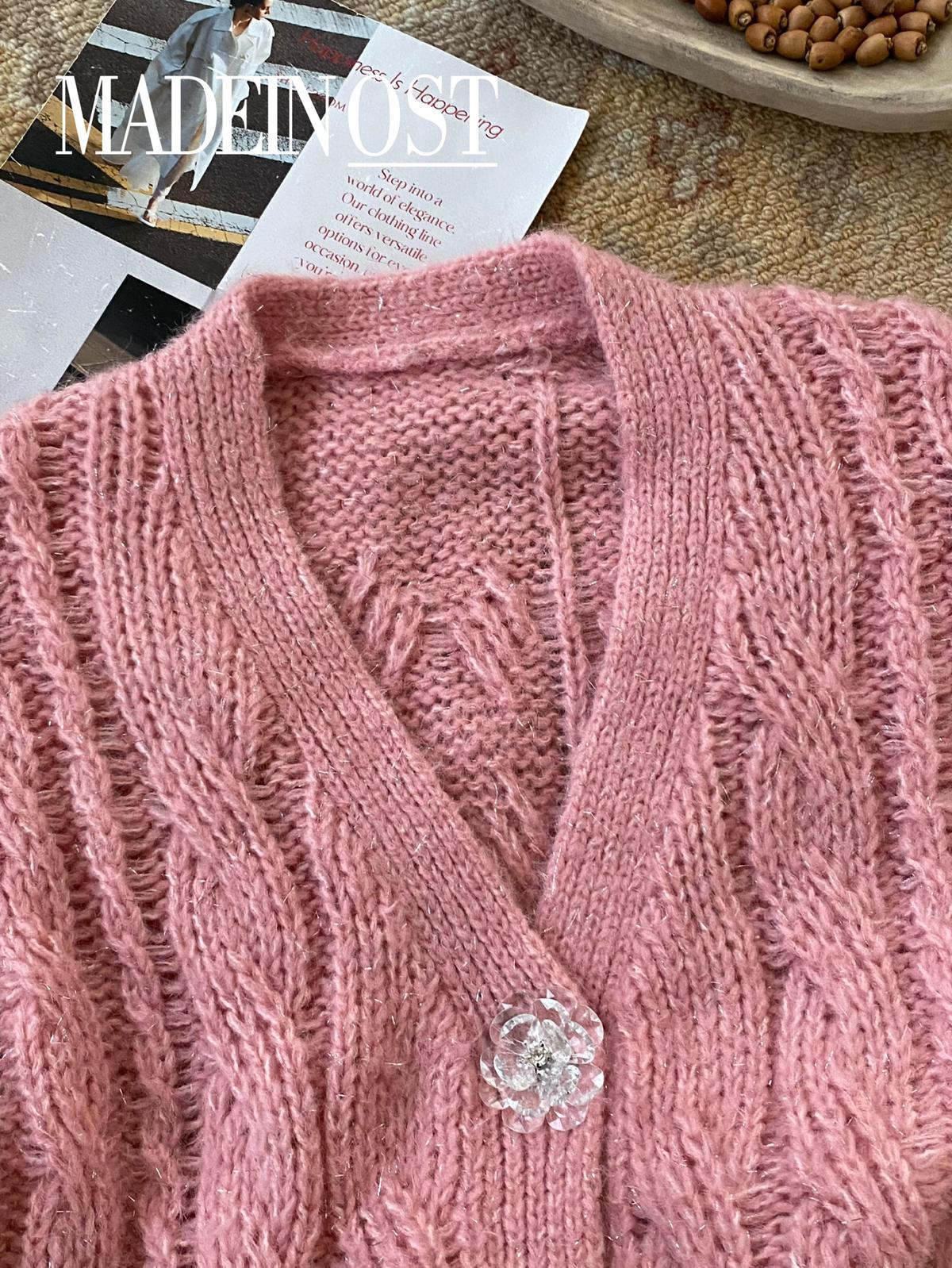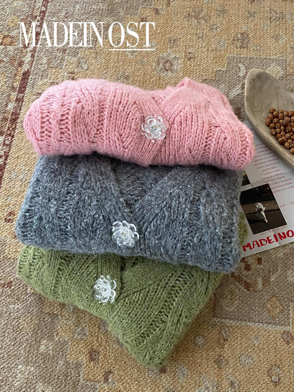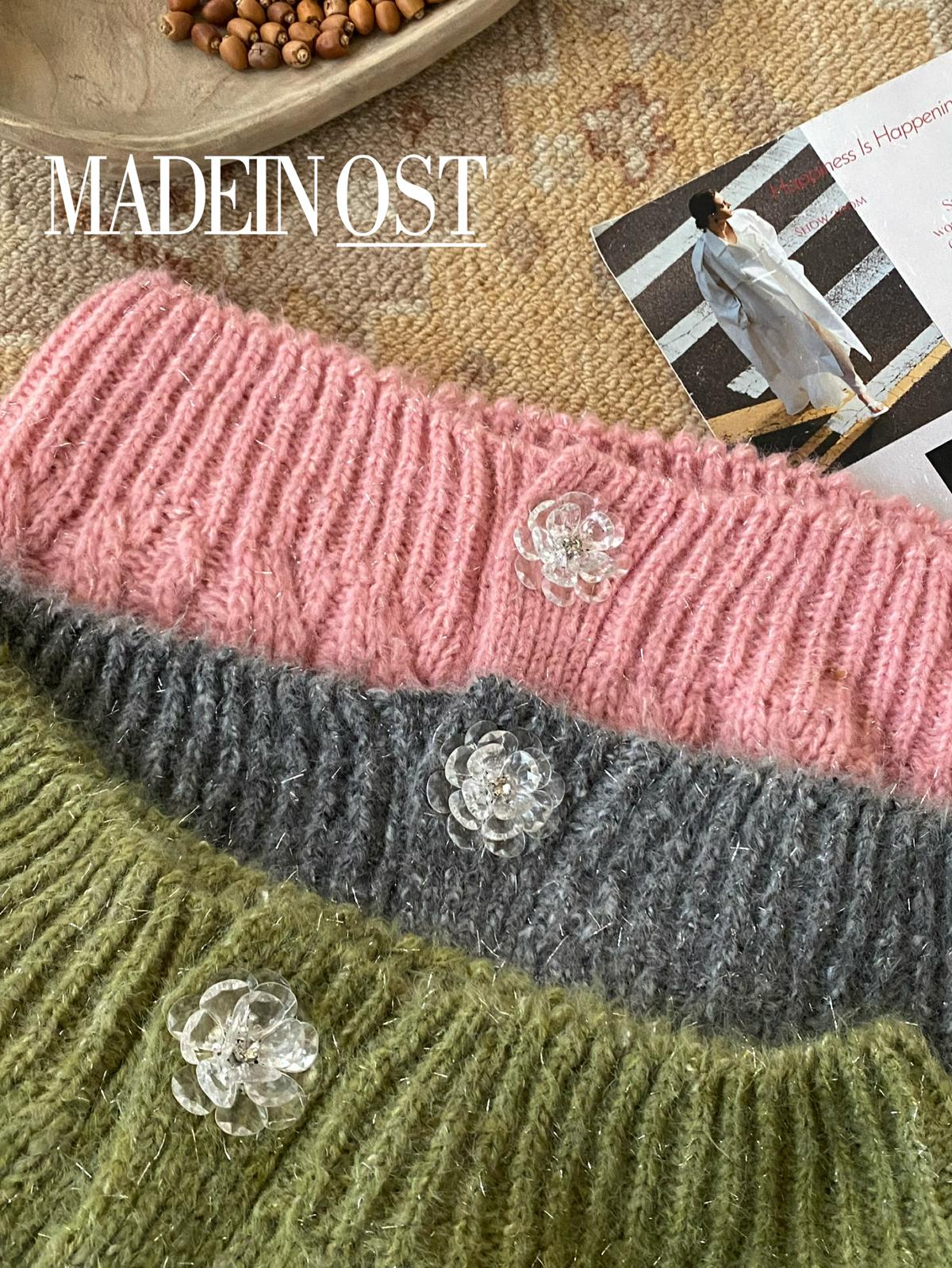 【C8434】新年慵懶感水晶花朵扭扣銀絲開衫保暖毛衣