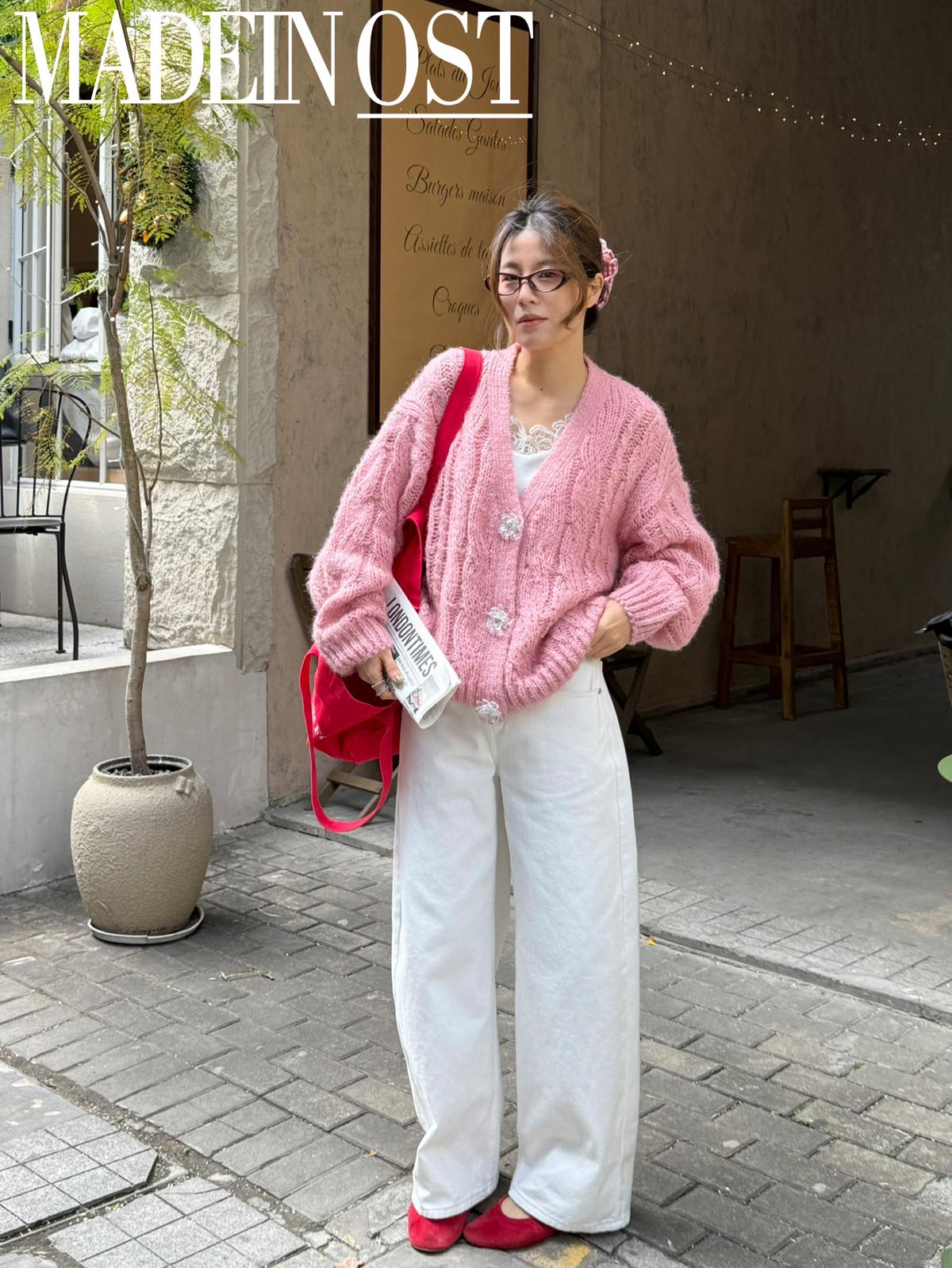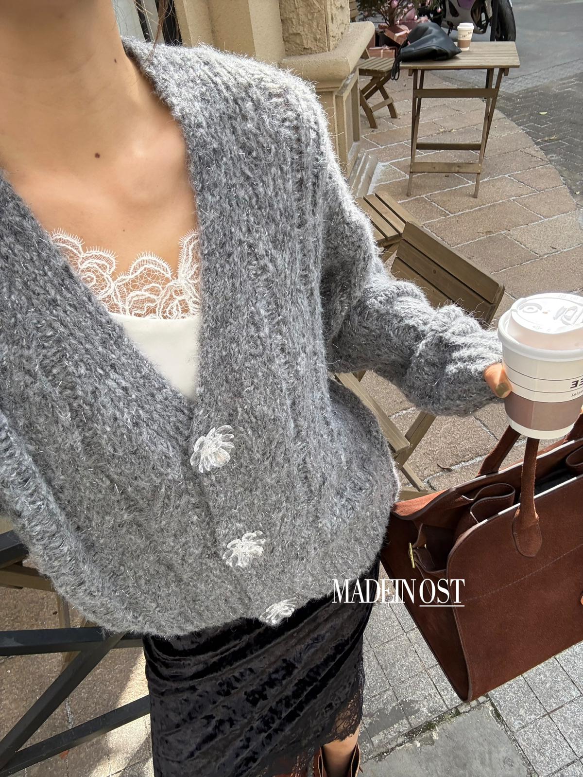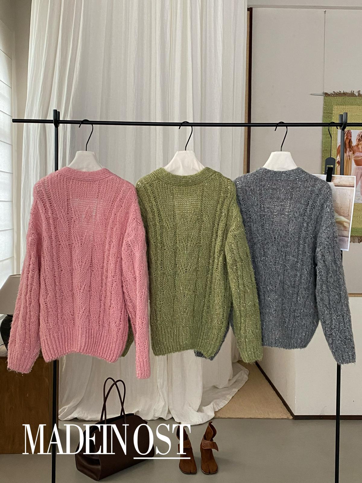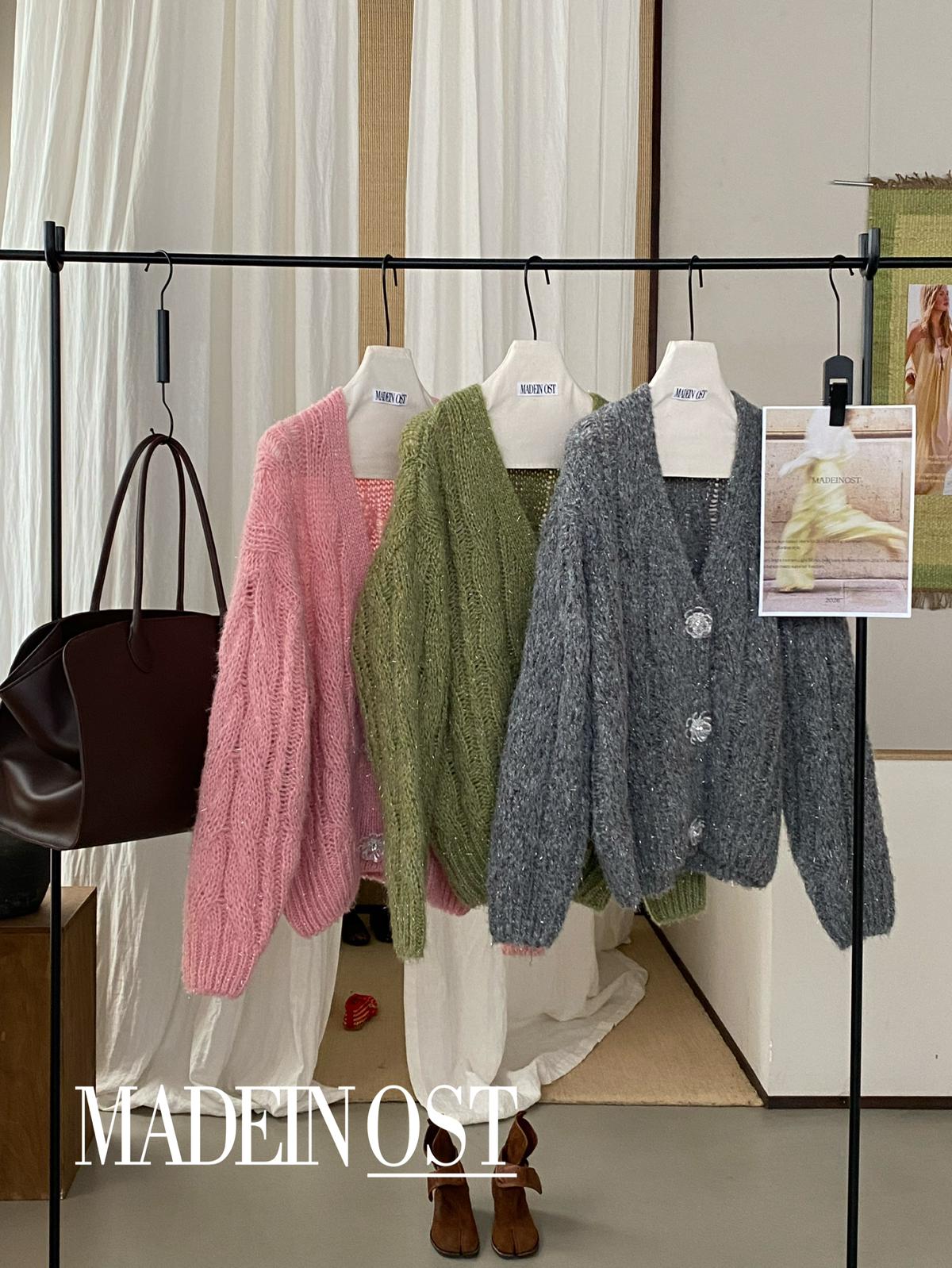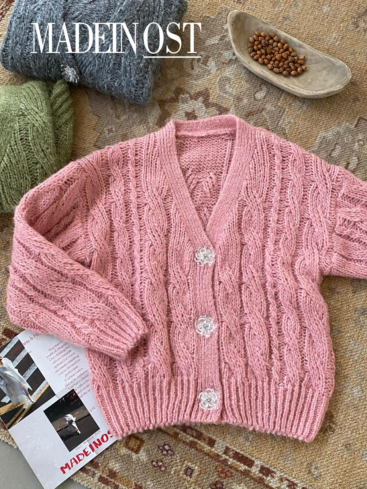 【C8434】新年慵懶感水晶花朵扭扣銀絲開衫保暖毛衣