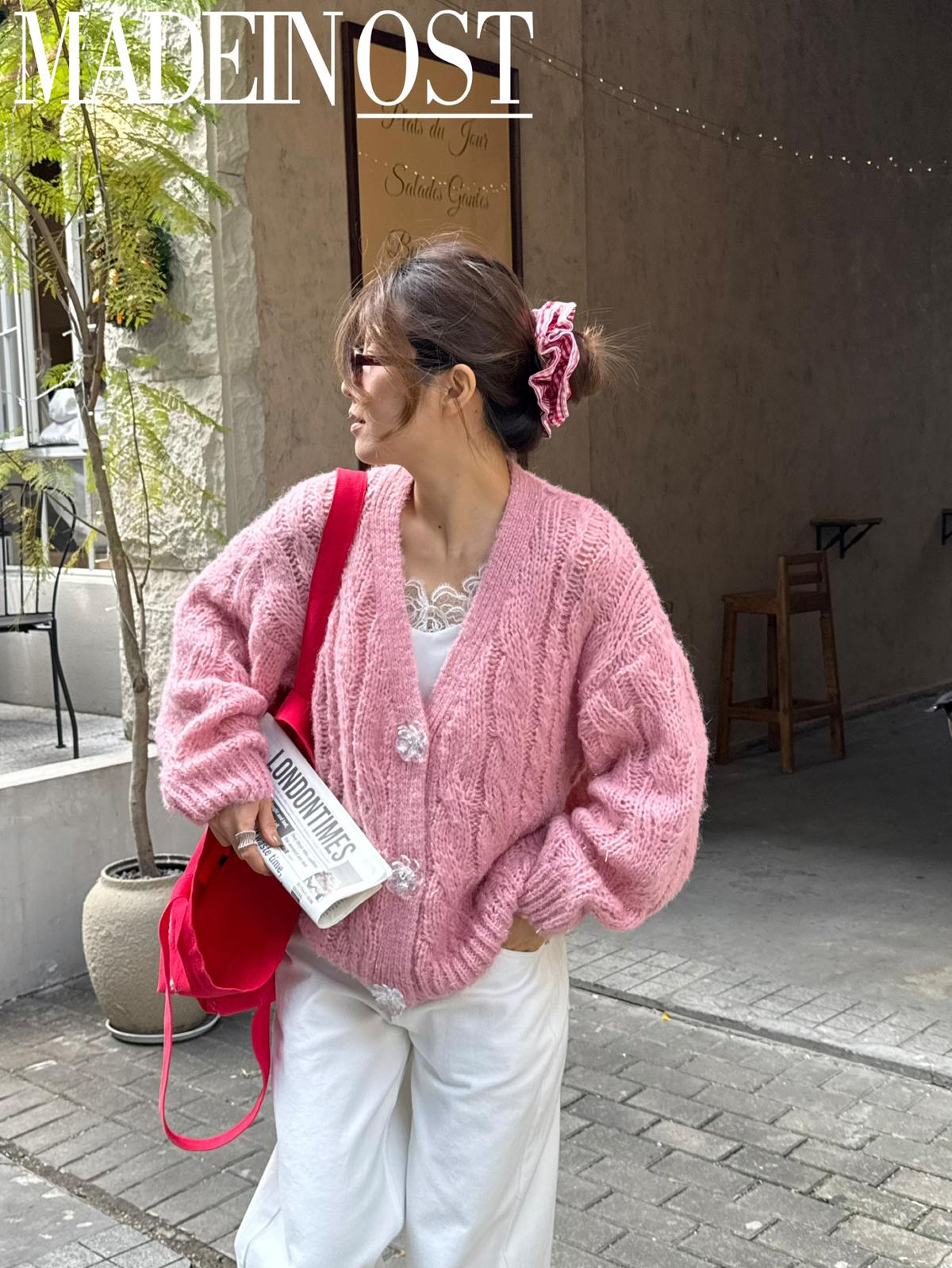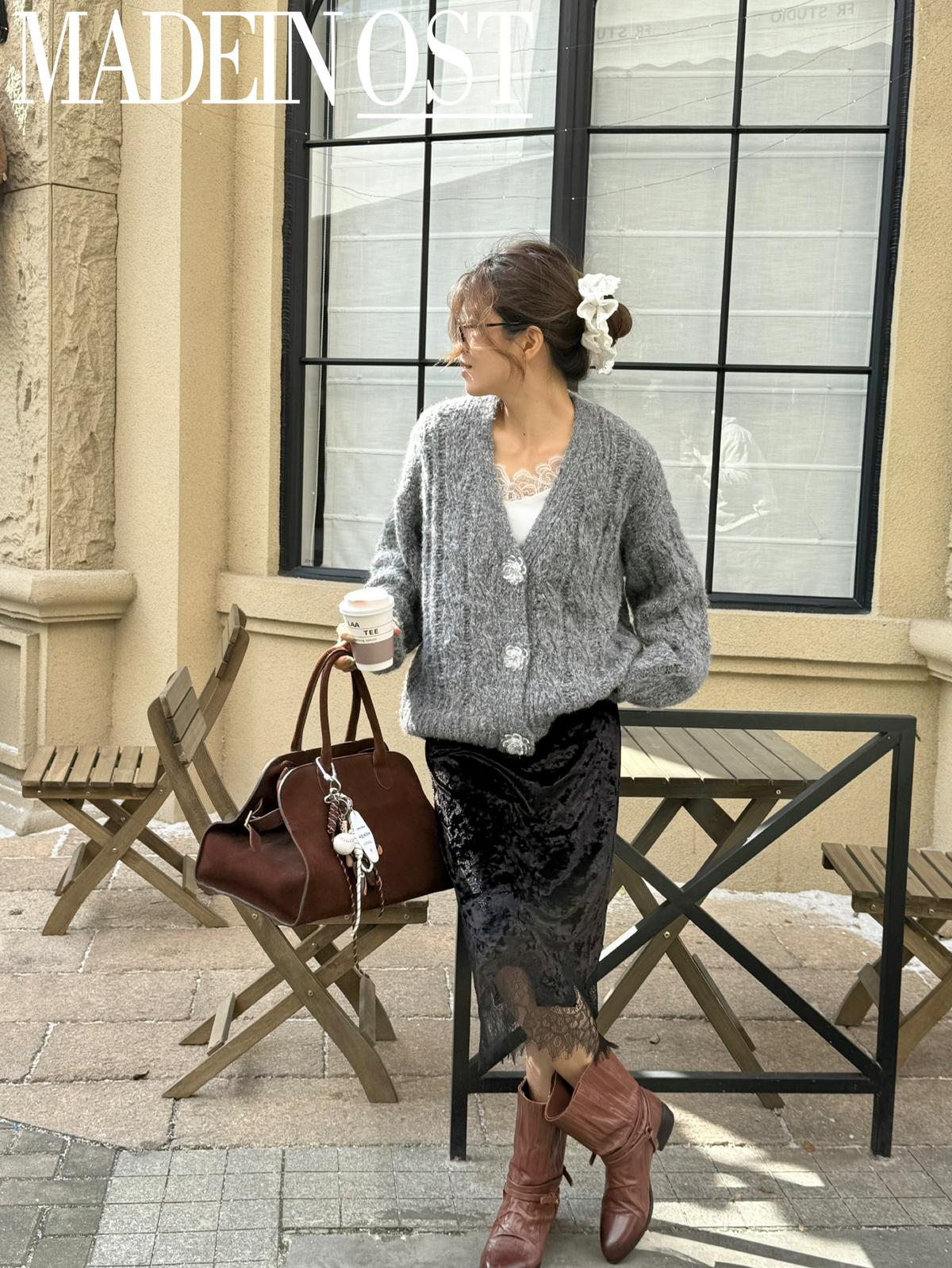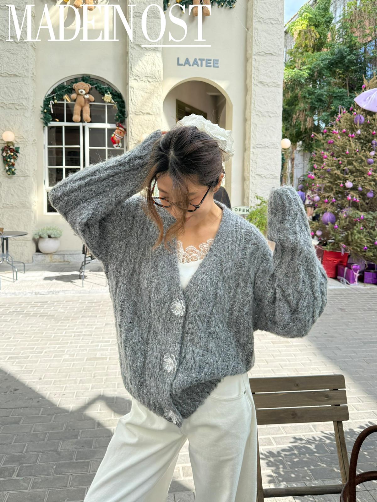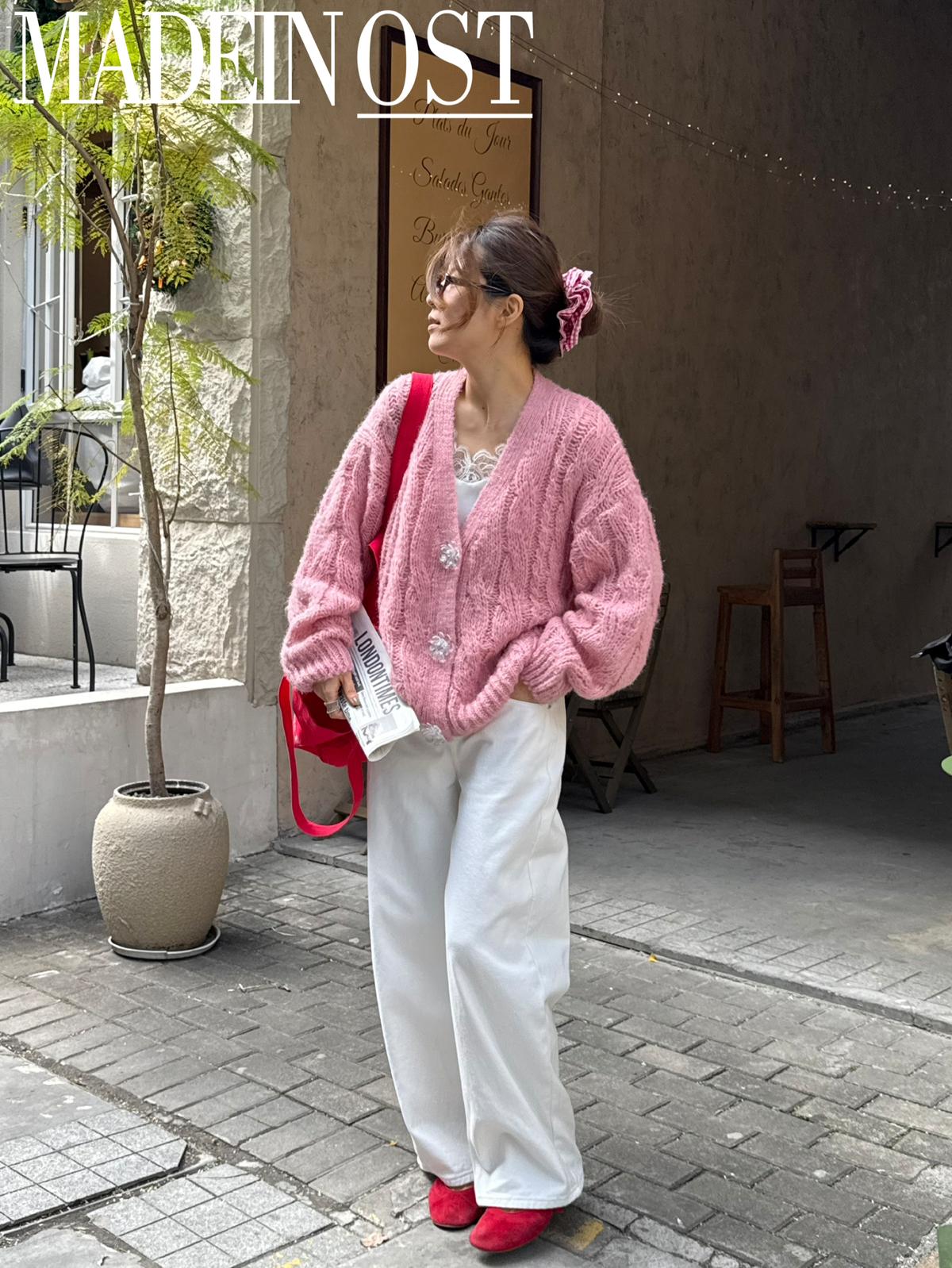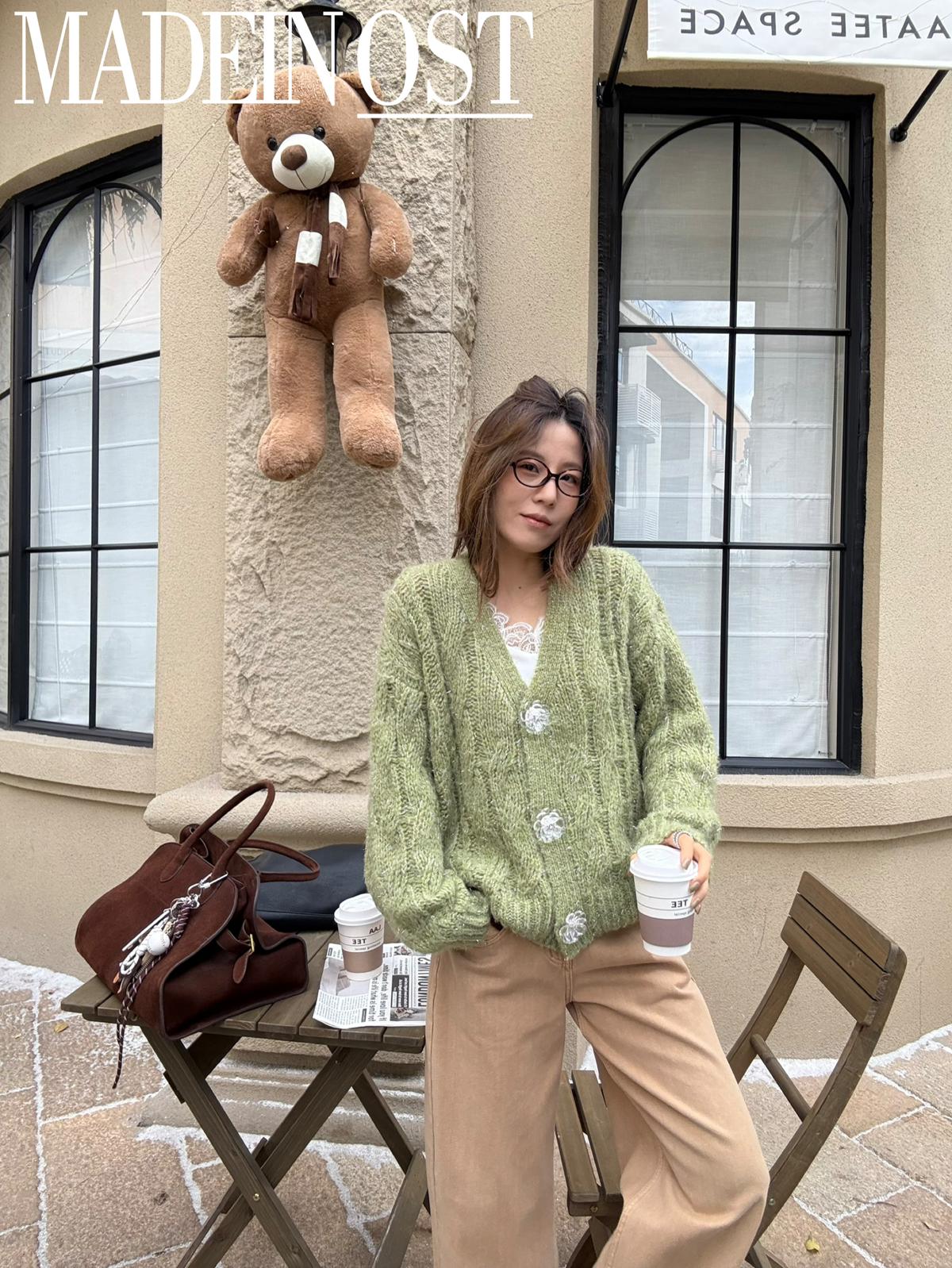 【C8434】新年慵懶感水晶花朵扭扣銀絲開衫保暖毛衣