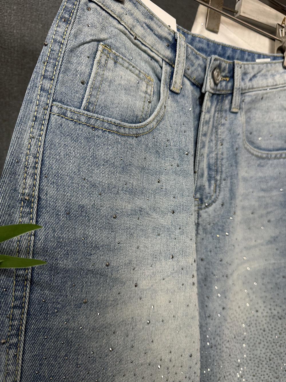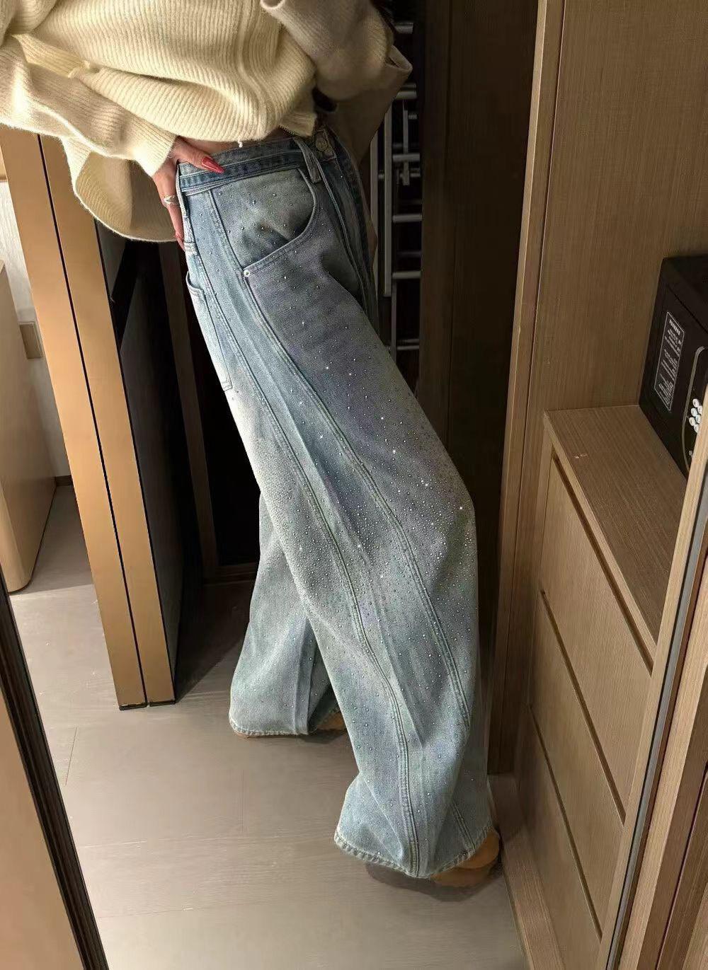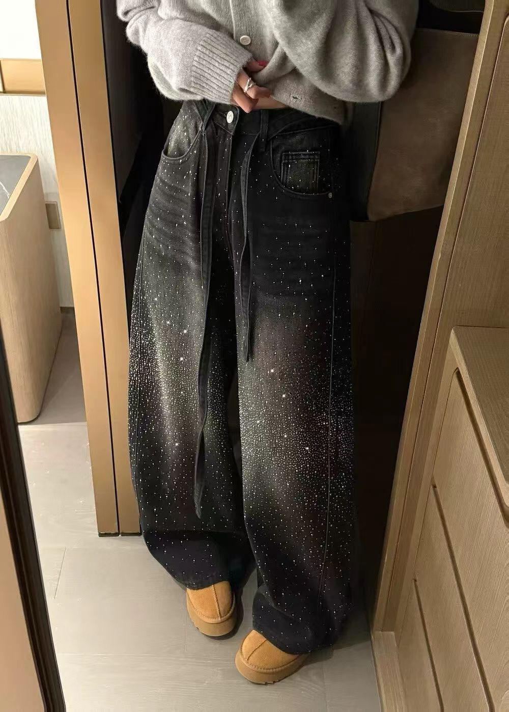 【C8440】布靈布靈滿天星燙鑽高腰闊腿寬鬆顯瘦休閒彎刀拖地褲牛仔褲(配腰繩)