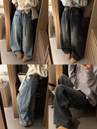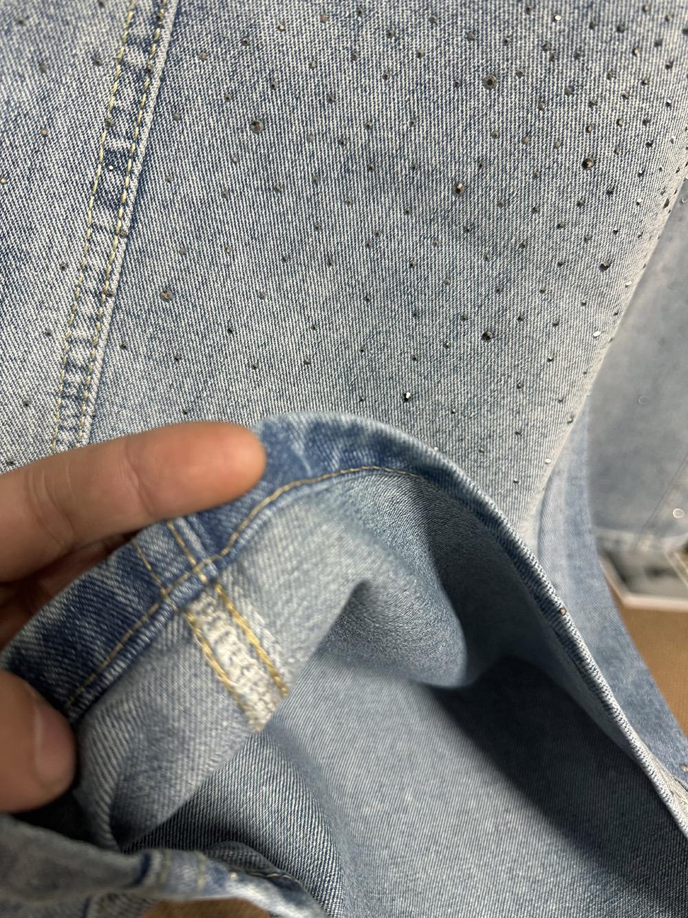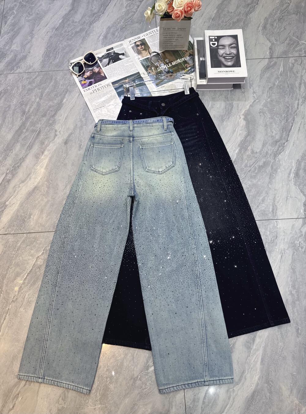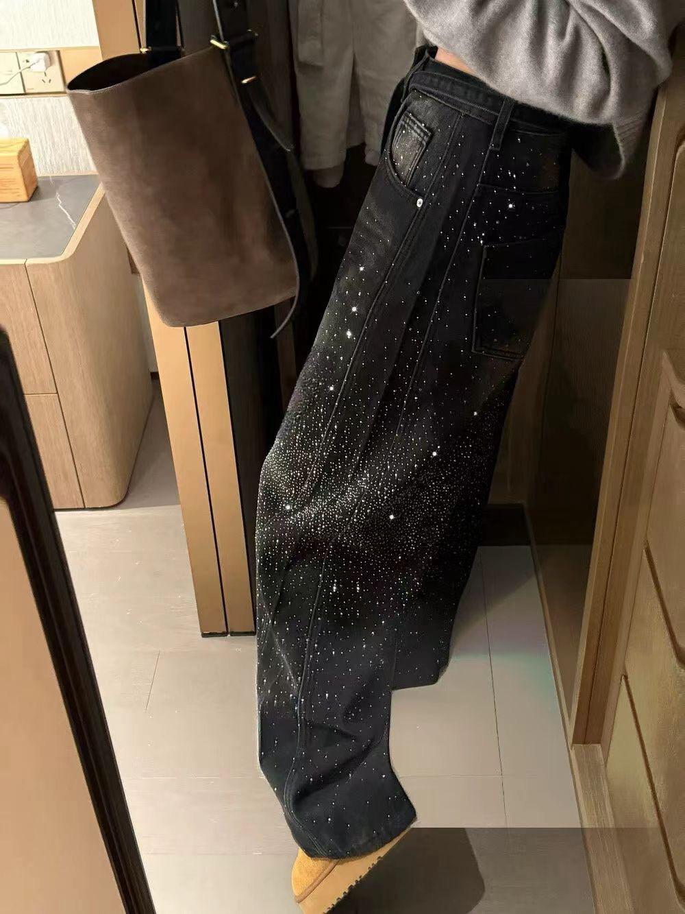 【C8440】布靈布靈滿天星燙鑽高腰闊腿寬鬆顯瘦休閒彎刀拖地褲牛仔褲(配腰繩)