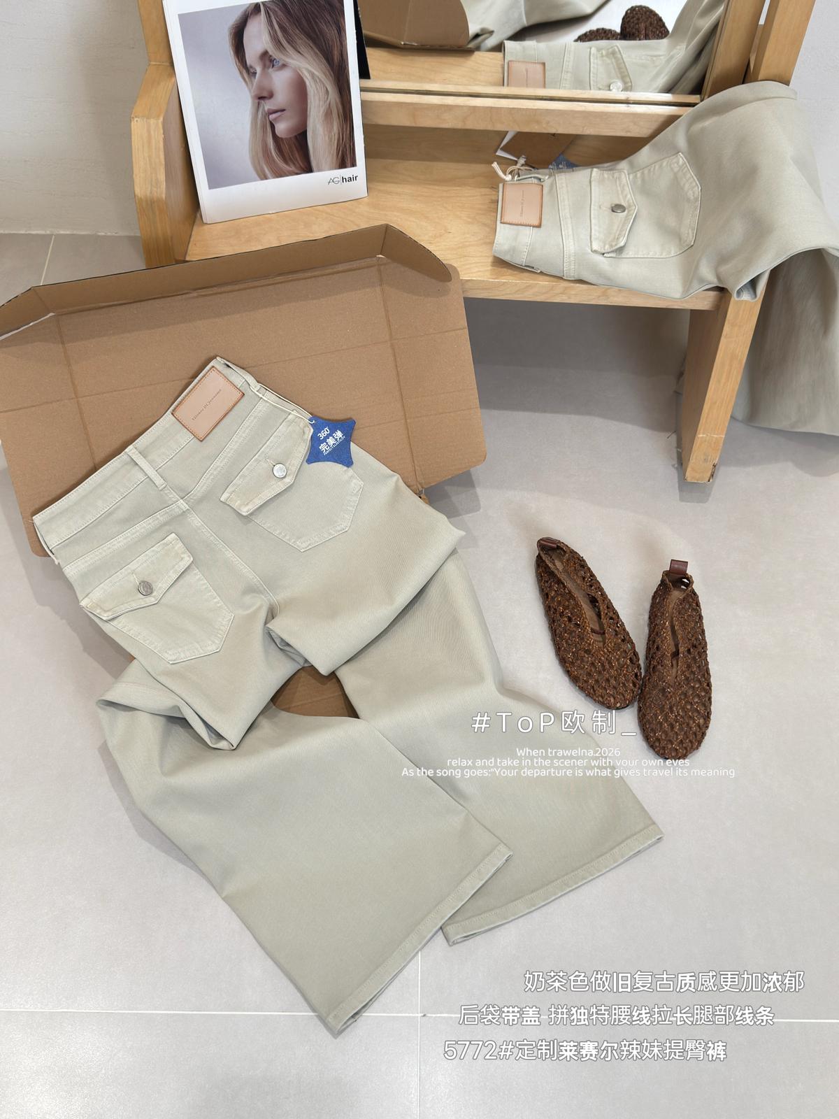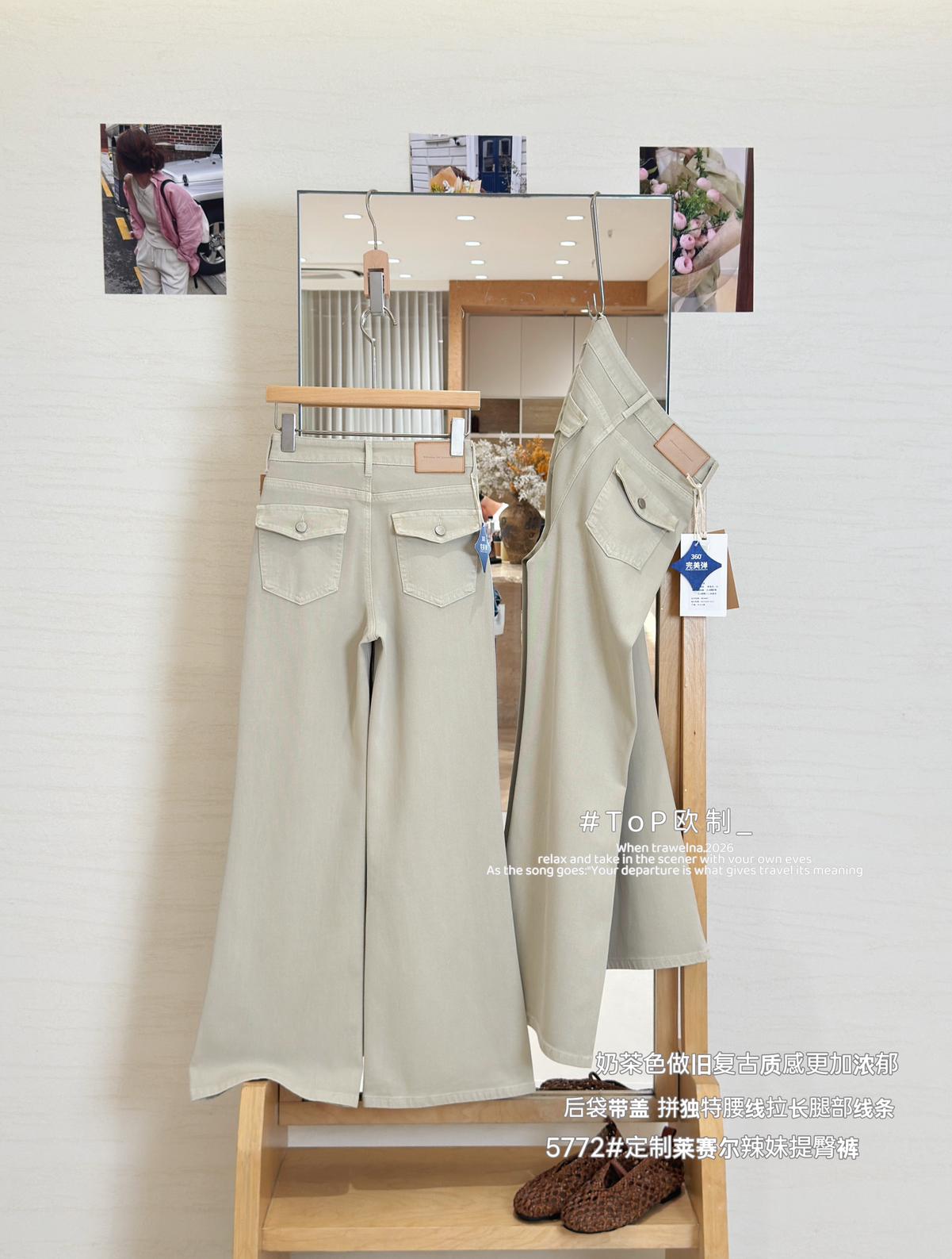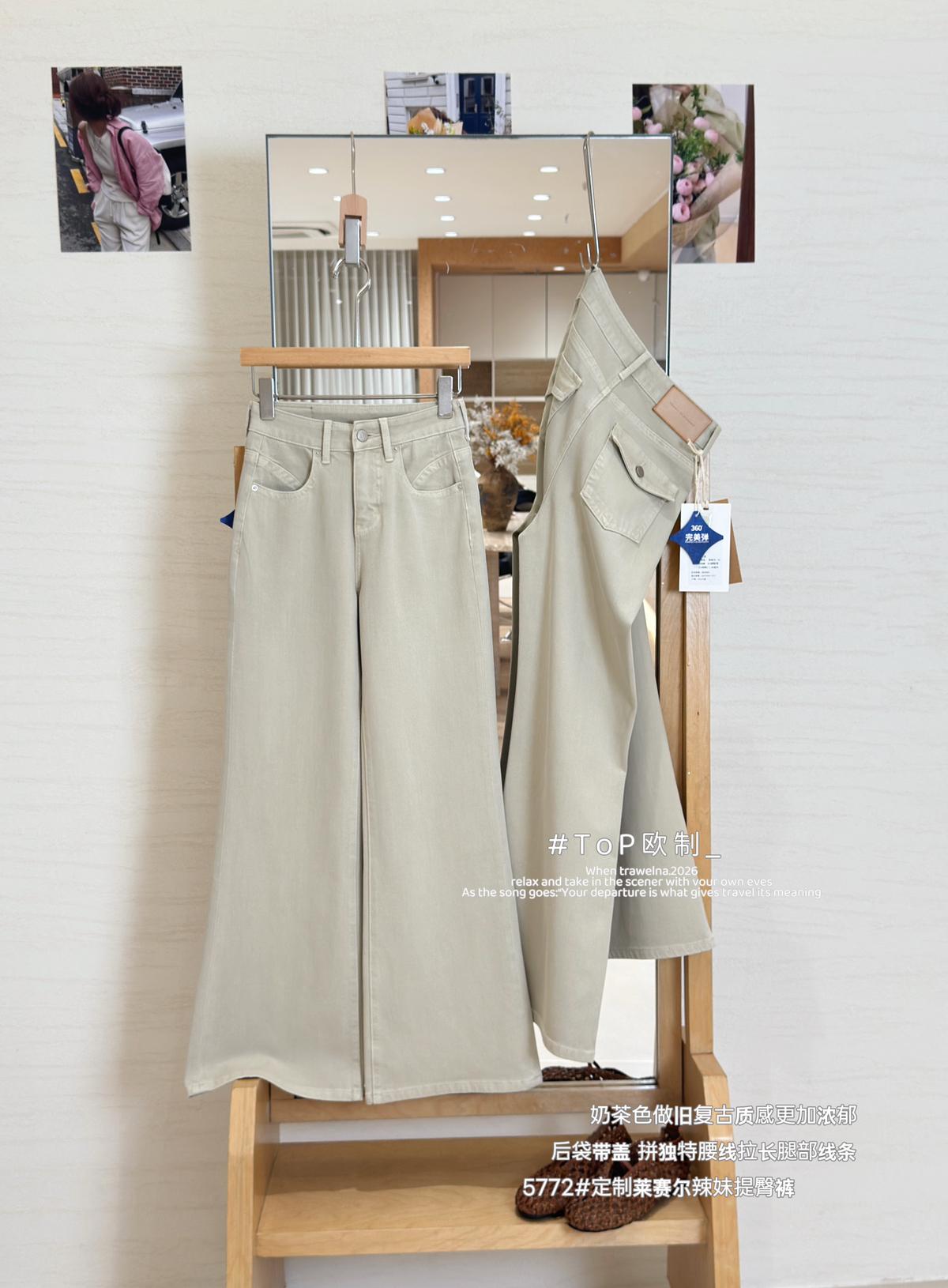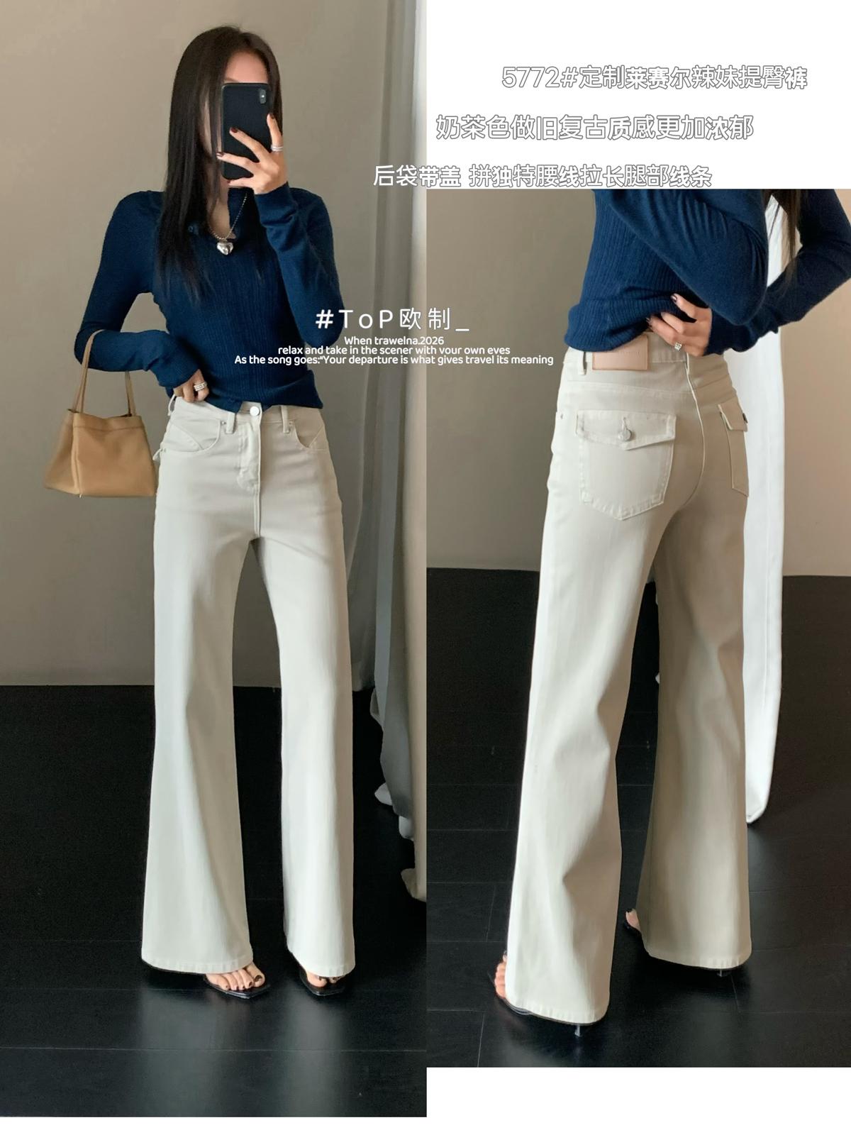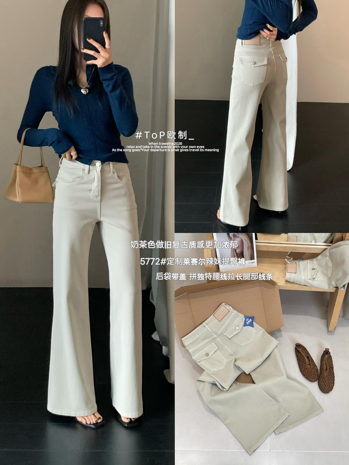 【C8442】做舊復古質感更加濃郁後袋帶蓋拼獨特腰線拉長腿部線條萊賽爾喇叭牛仔褲