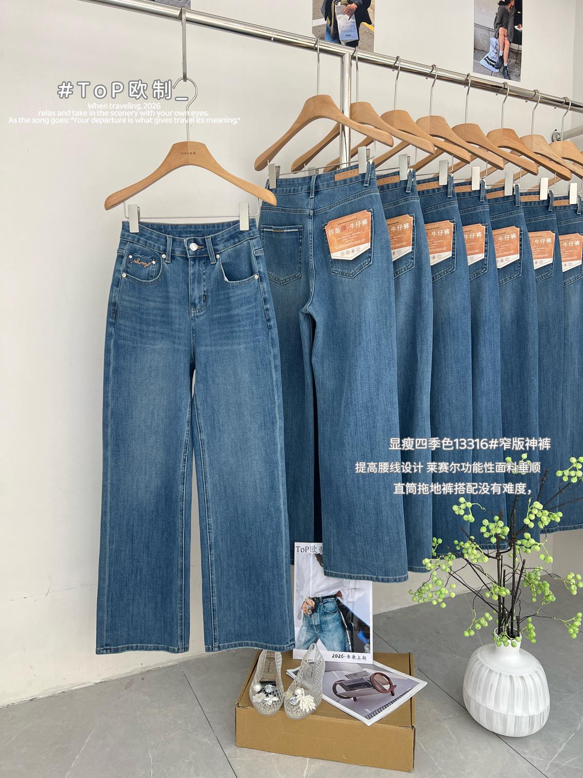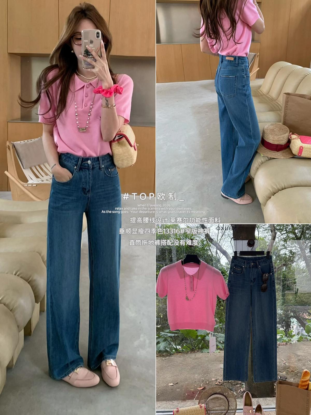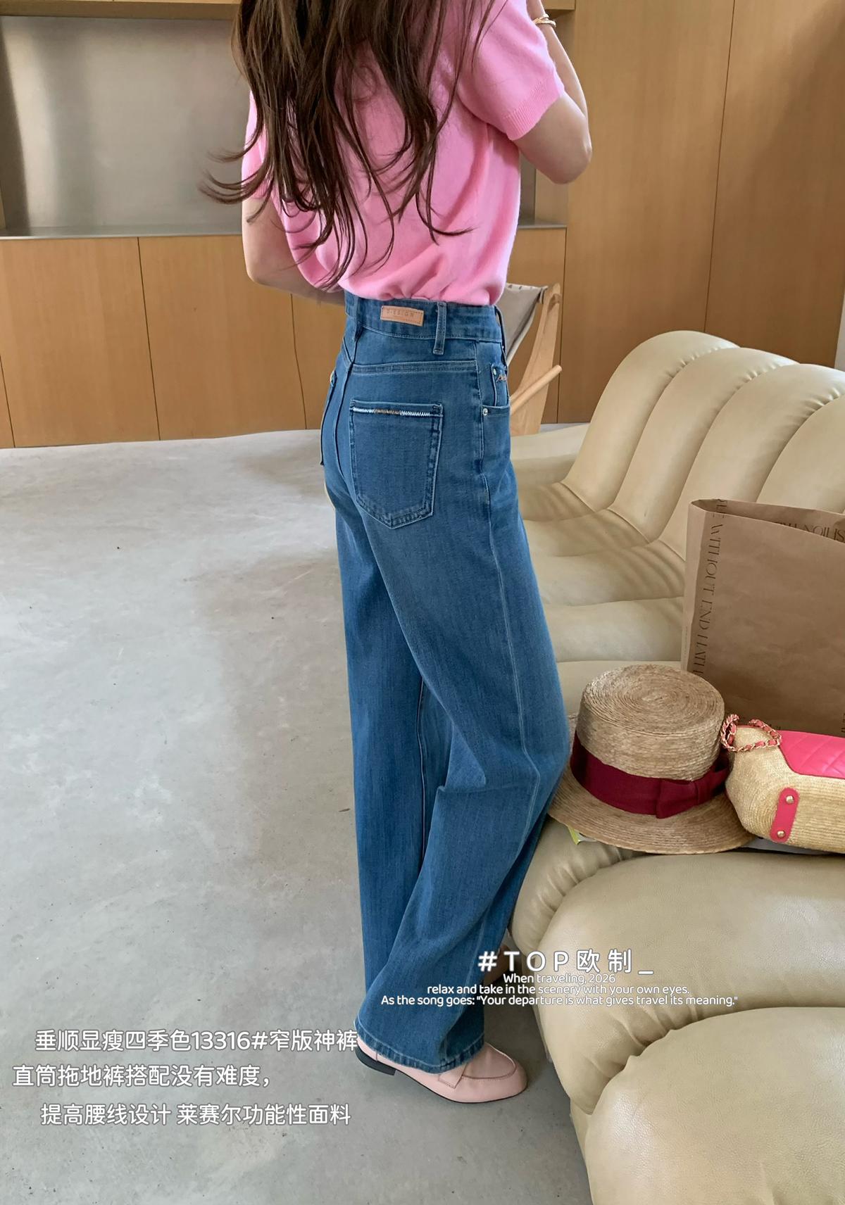 【C8444】顯瘦四季色韓版窄版提高腰線設計萊賽爾功能性面料垂順直筒拖地牛仔褲