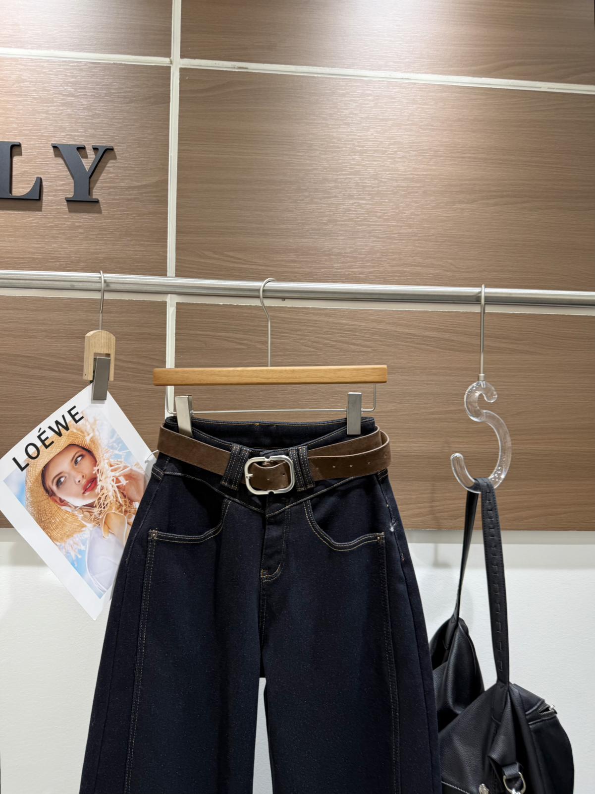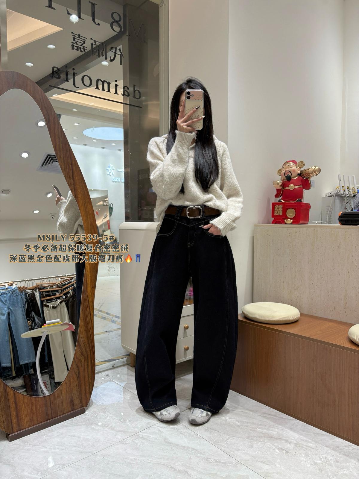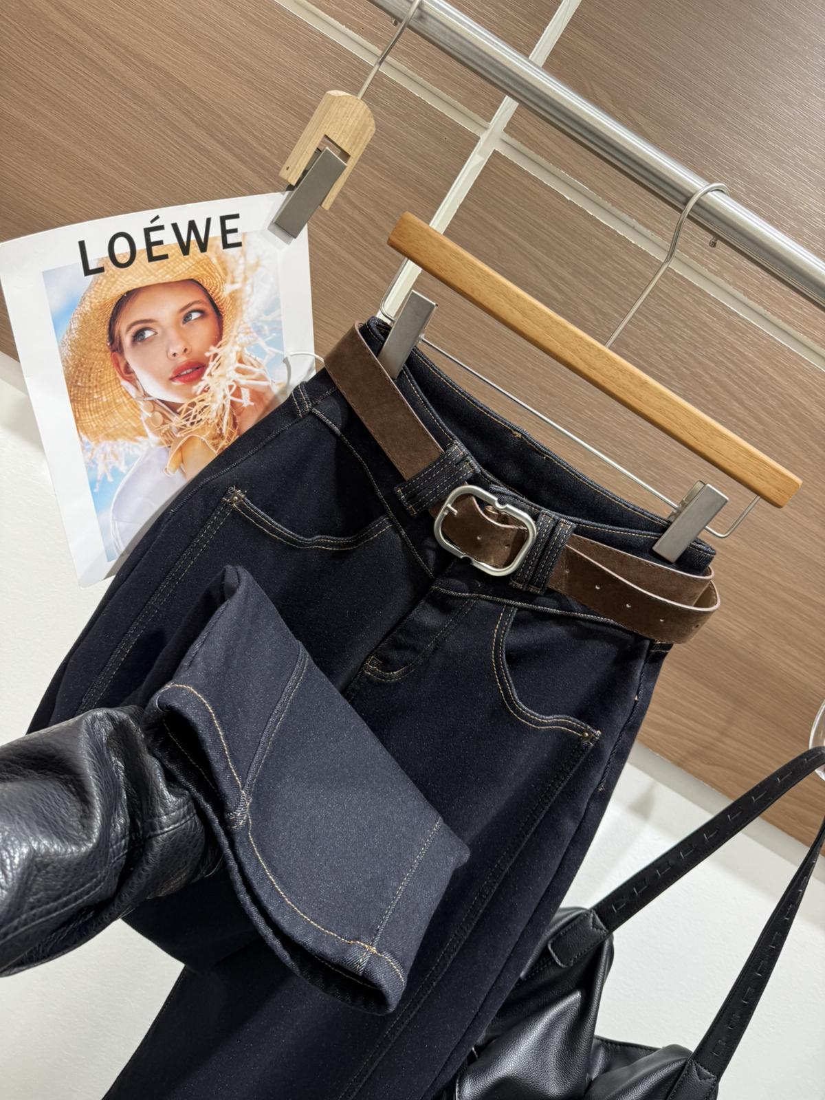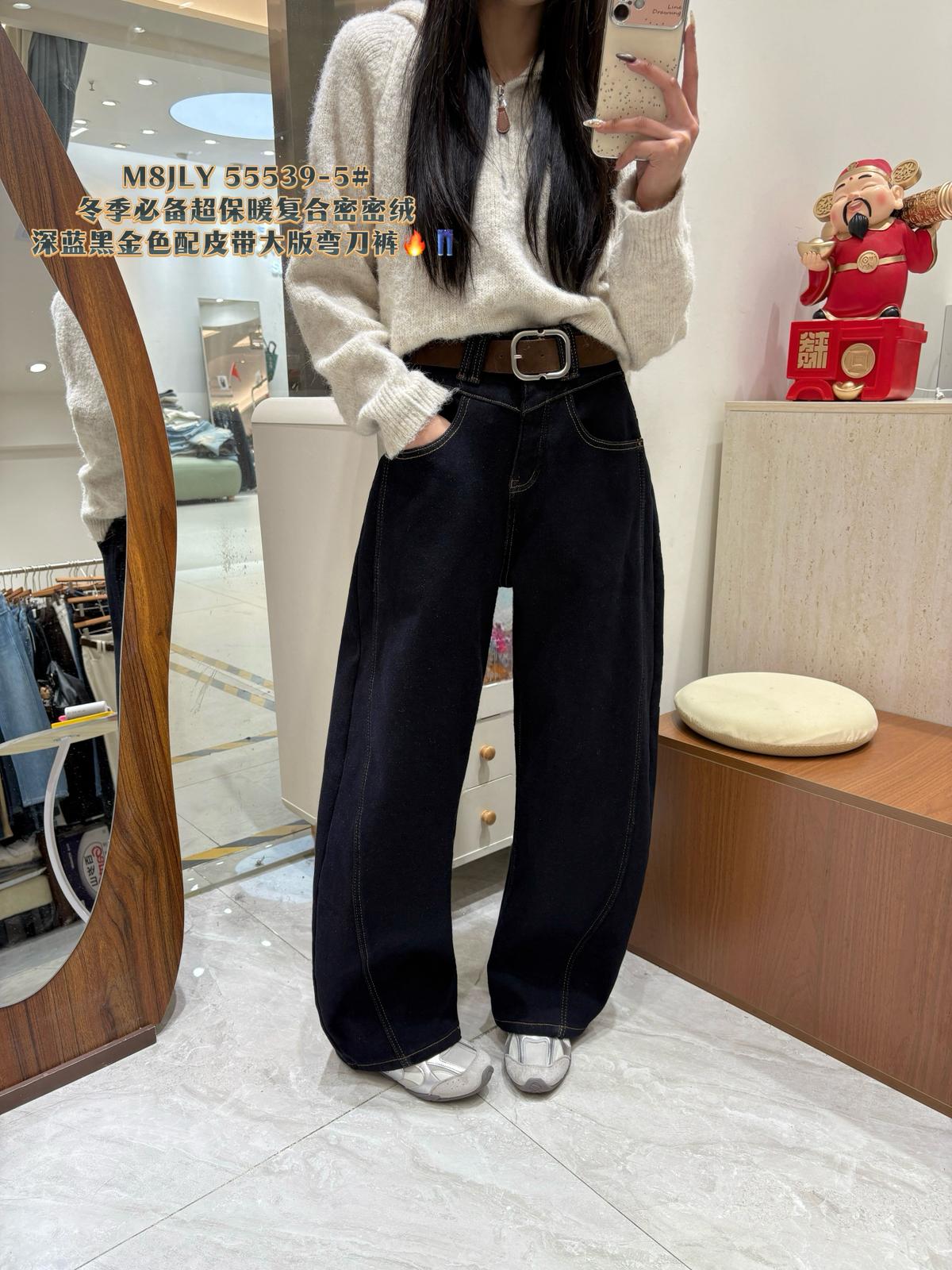 【C8456】冬季加厚超保暖複合絨深藍黑金色大版寬鬆彎刀褲牛仔褲(配腰帶)(配皮帶)
