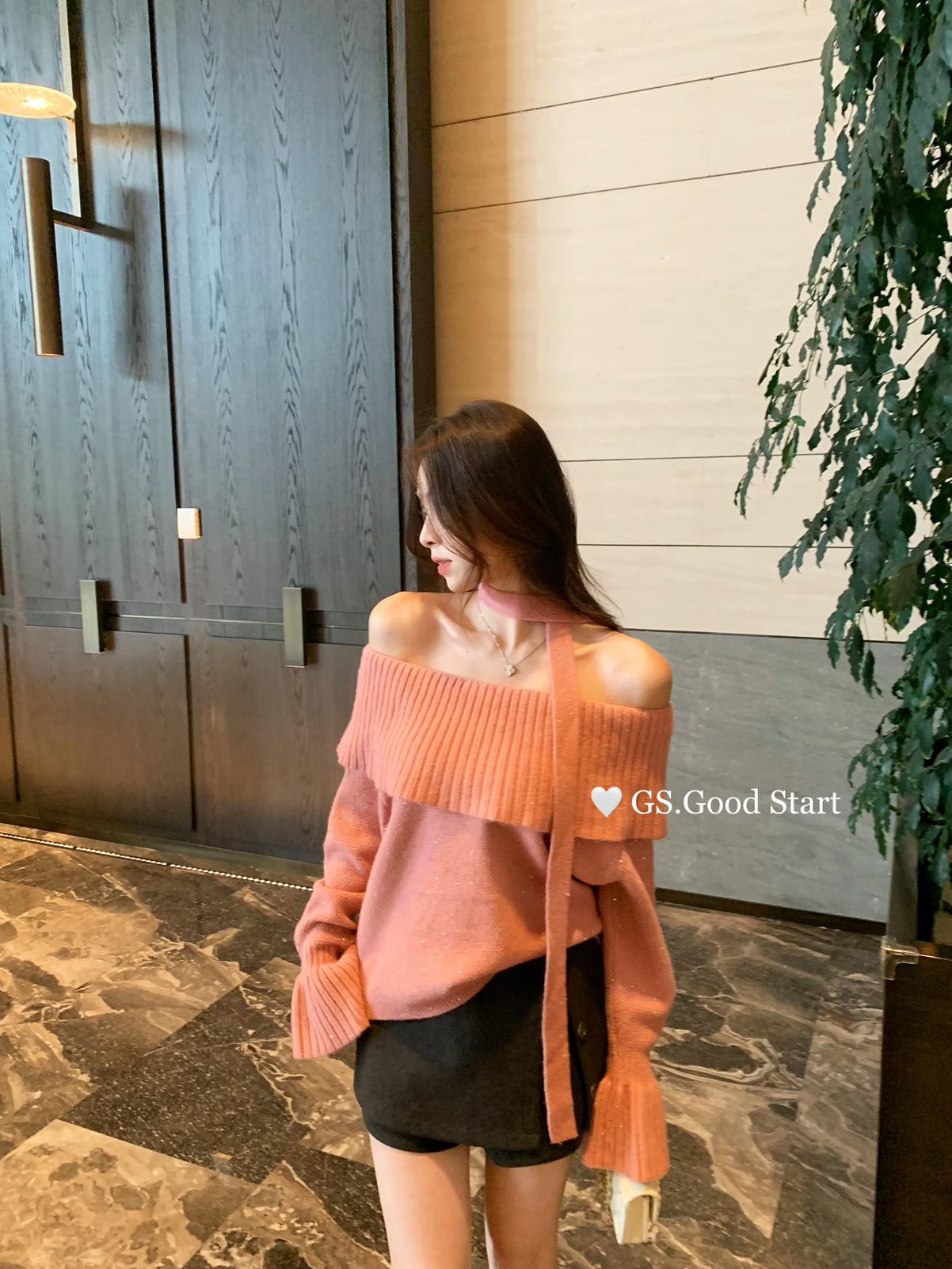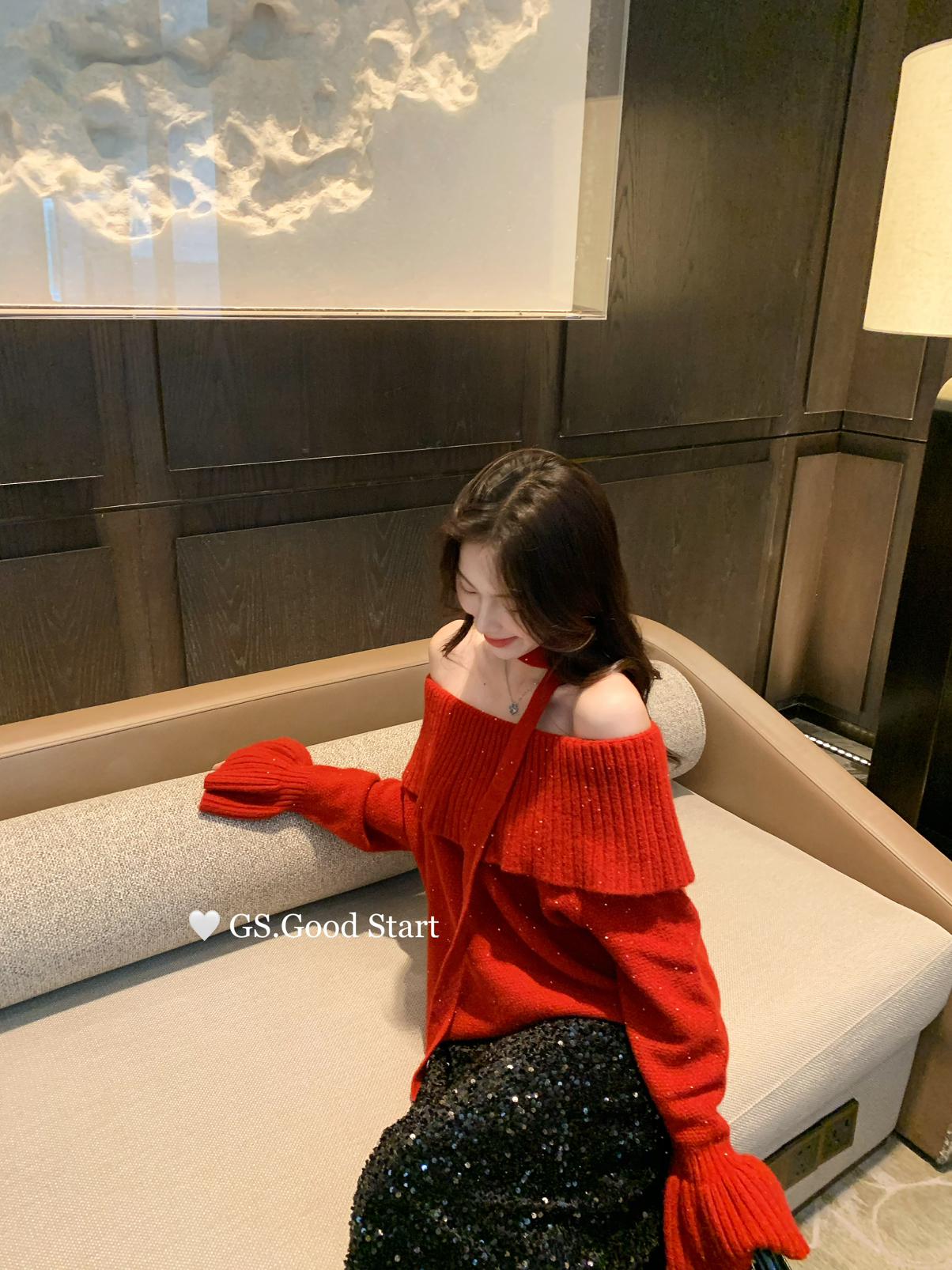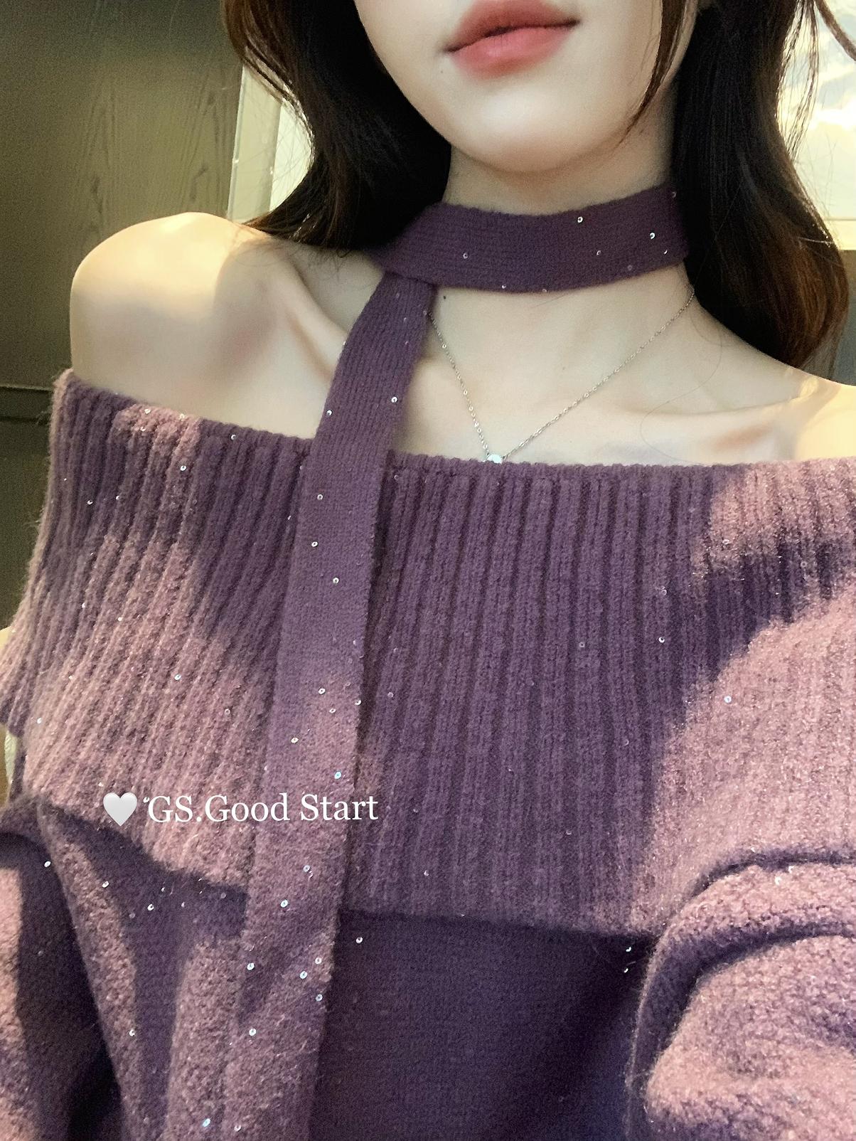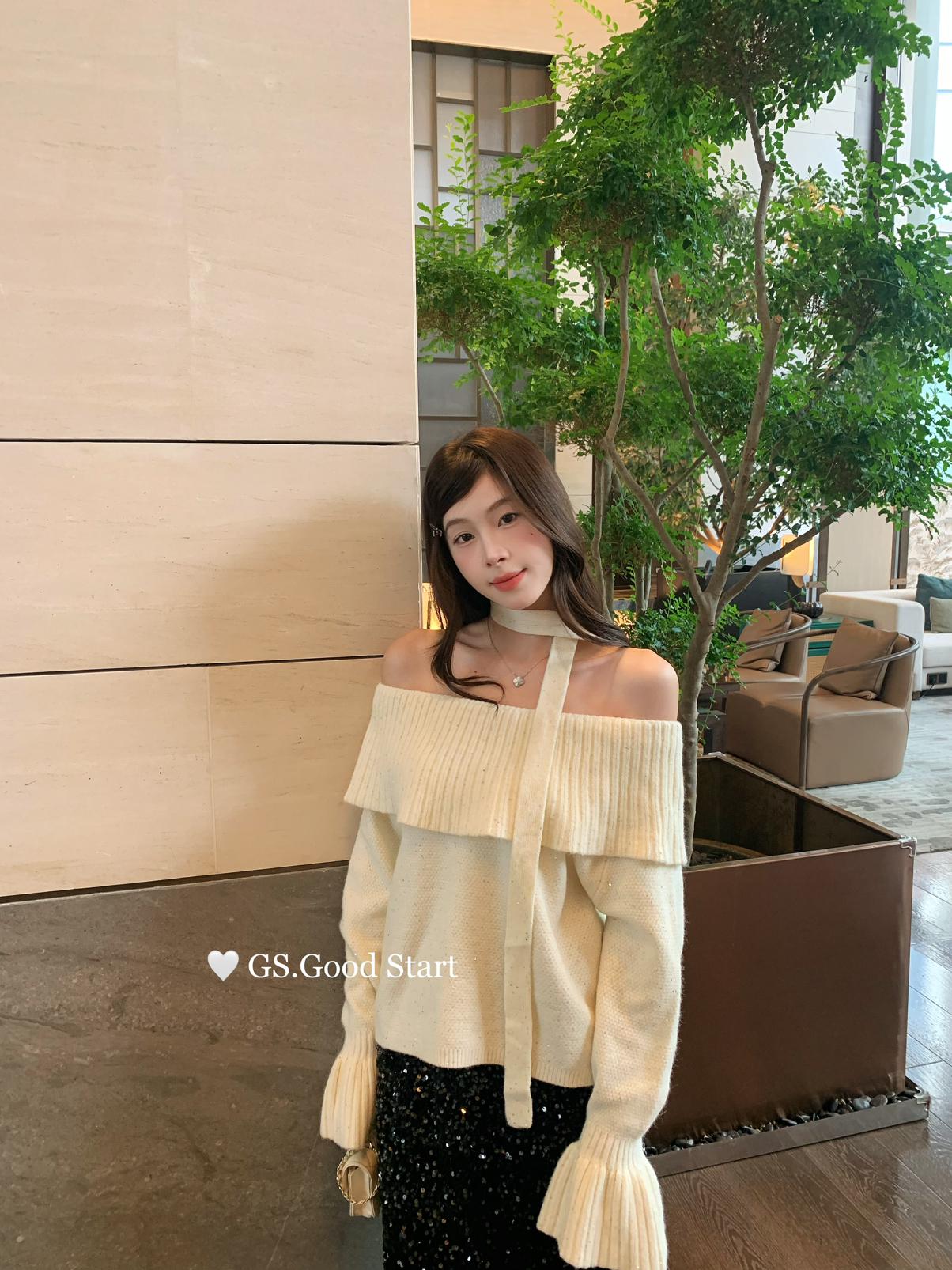 【C8471】強推!細閃太美了~完全出片高手!冬季氣質純欲氛圍感一字肩針織衫(配可拆卸飄帶)