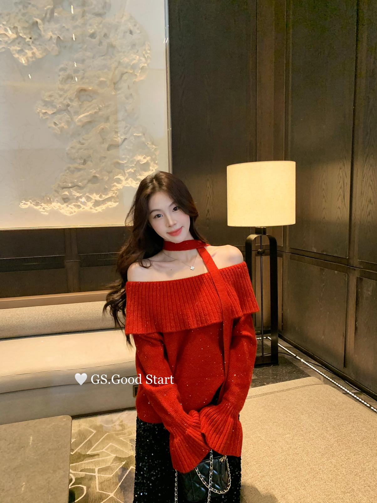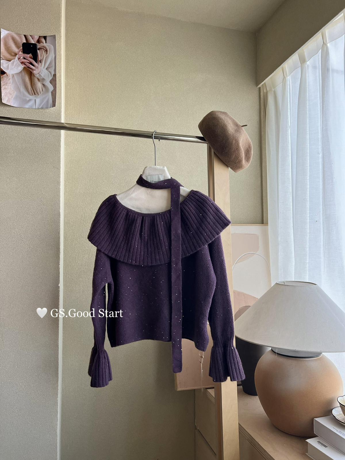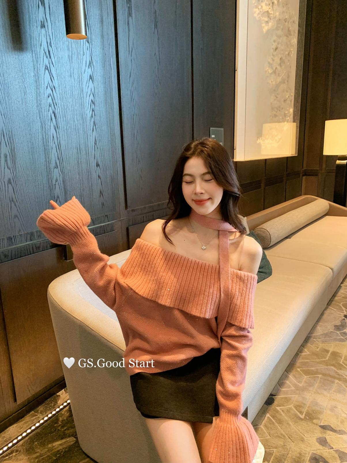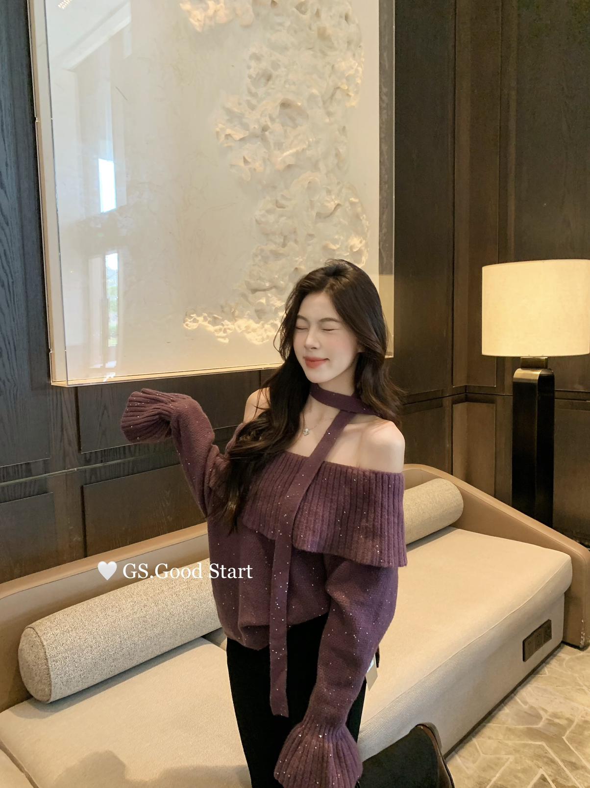 【C8471】強推!細閃太美了~完全出片高手!冬季氣質純欲氛圍感一字肩針織衫(配可拆卸飄帶)