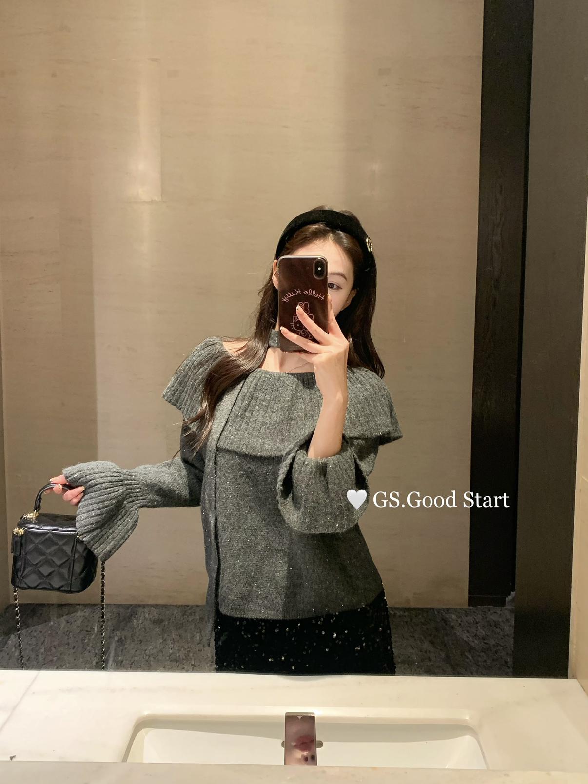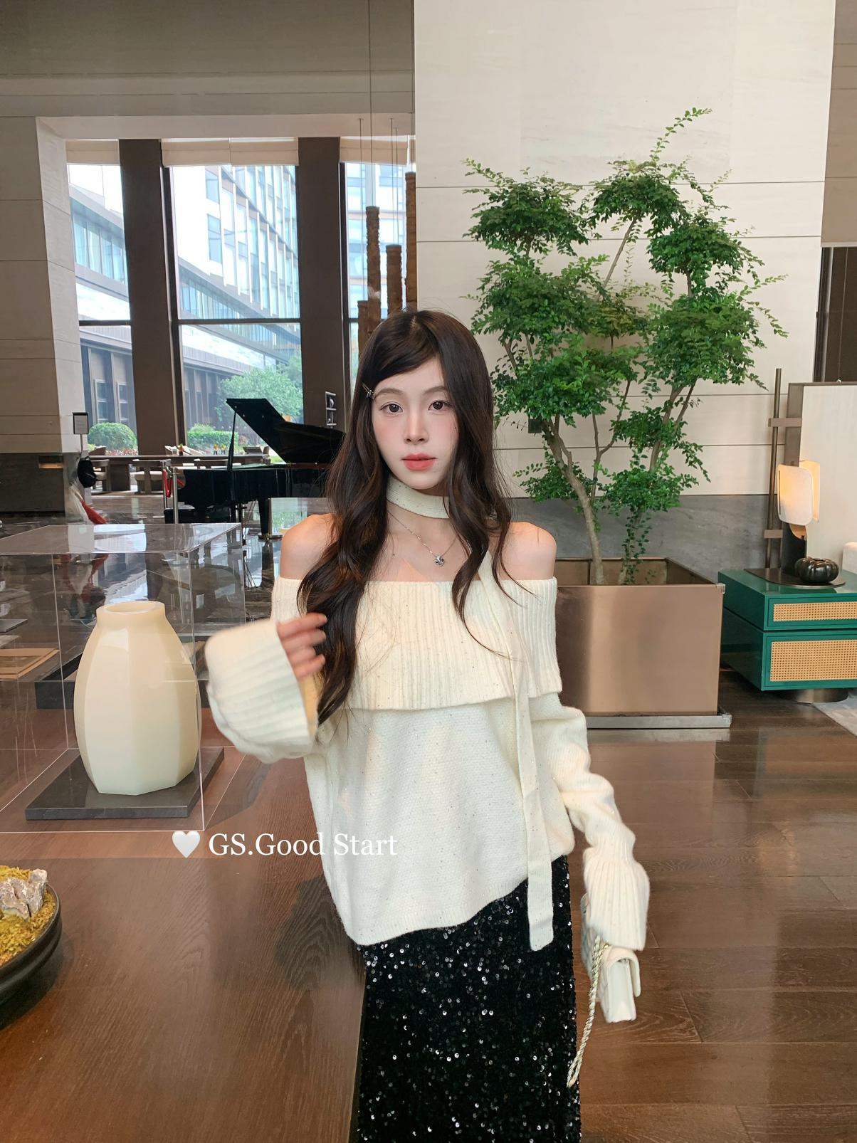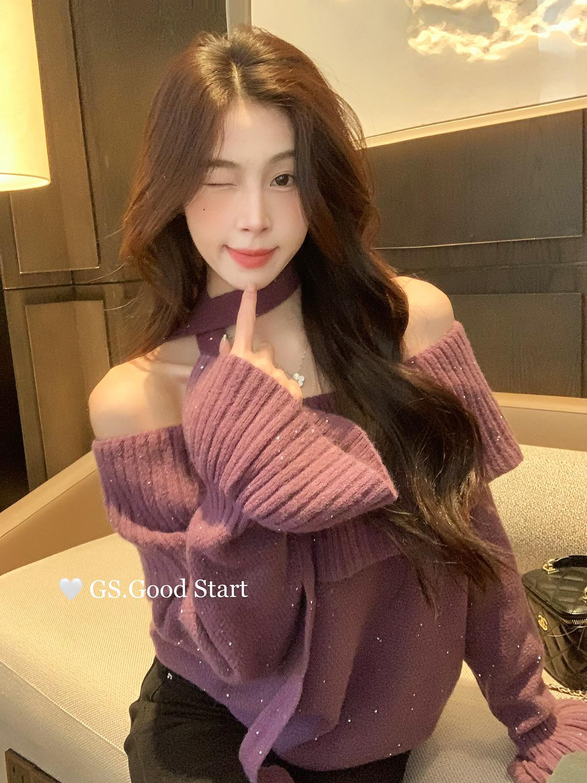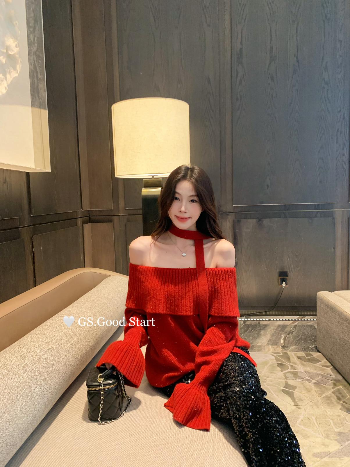 【C8471】強推!細閃太美了~完全出片高手!冬季氣質純欲氛圍感一字肩針織衫(配可拆卸飄帶)
