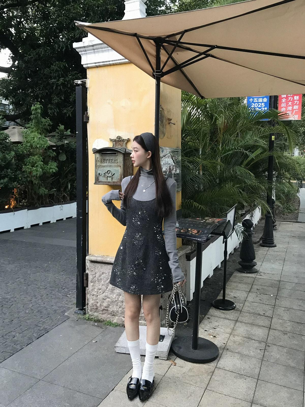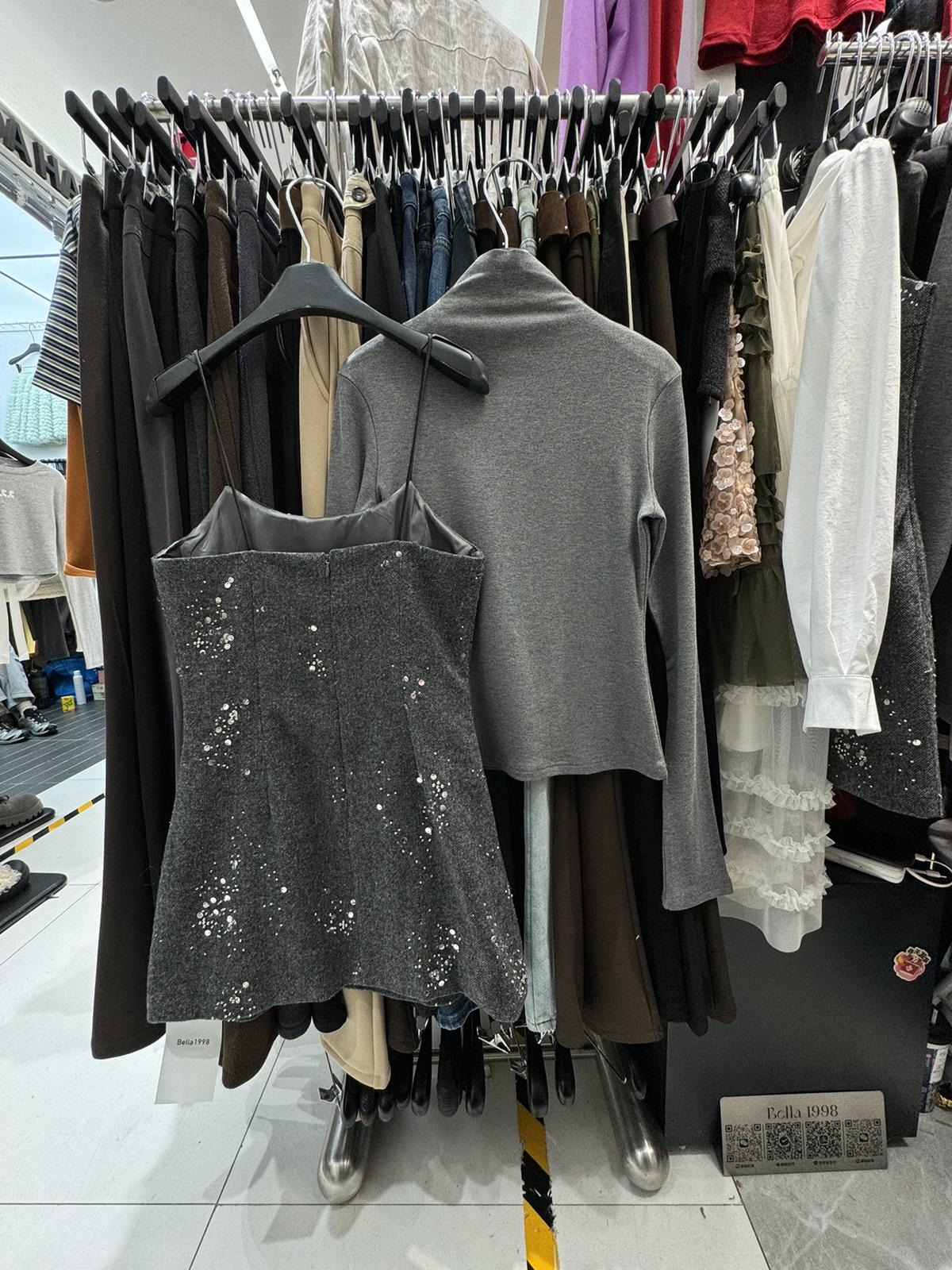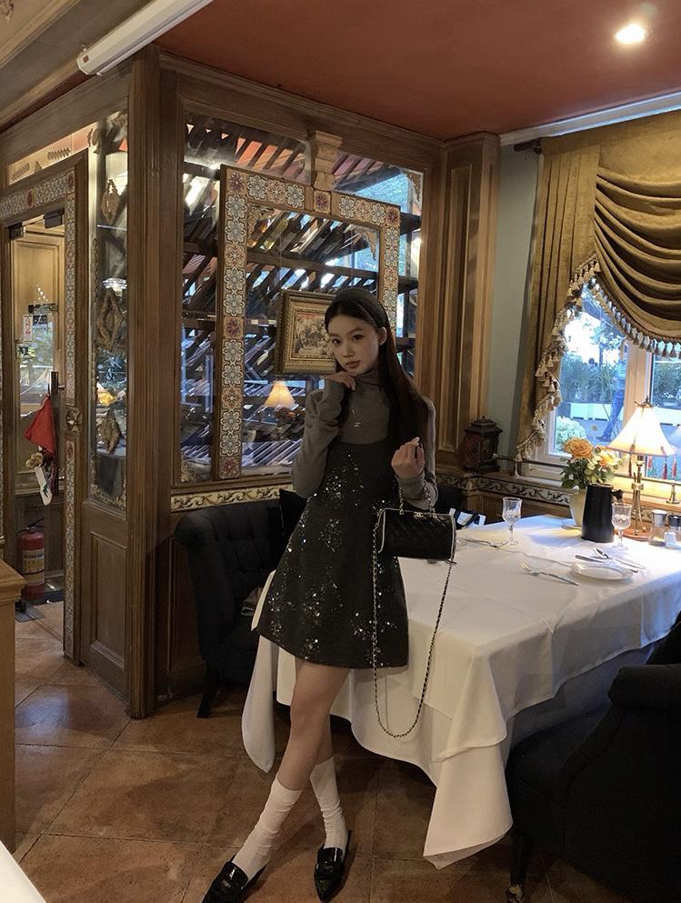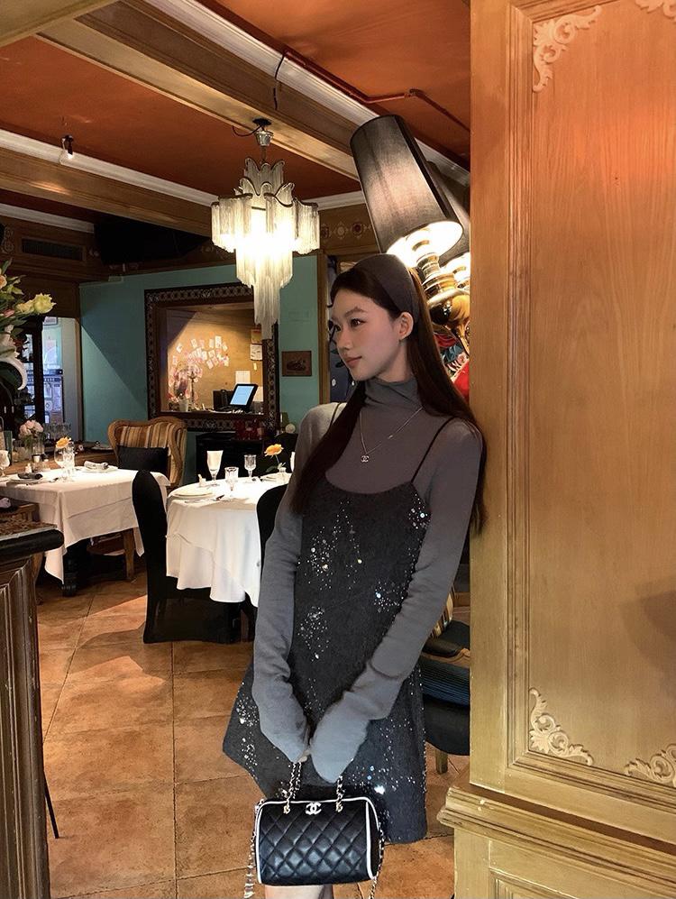 【C8490】氛圍感穿搭半高領長袖上衣+收腰顯瘦疊穿亮片吊帶連衣裙套裝