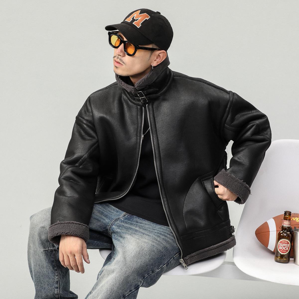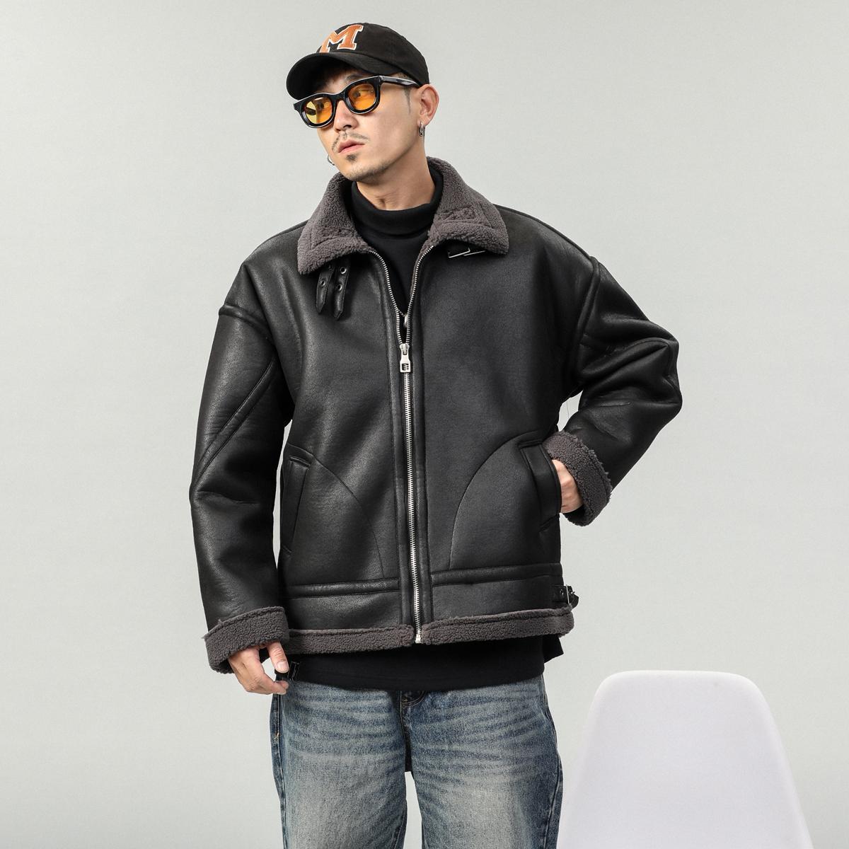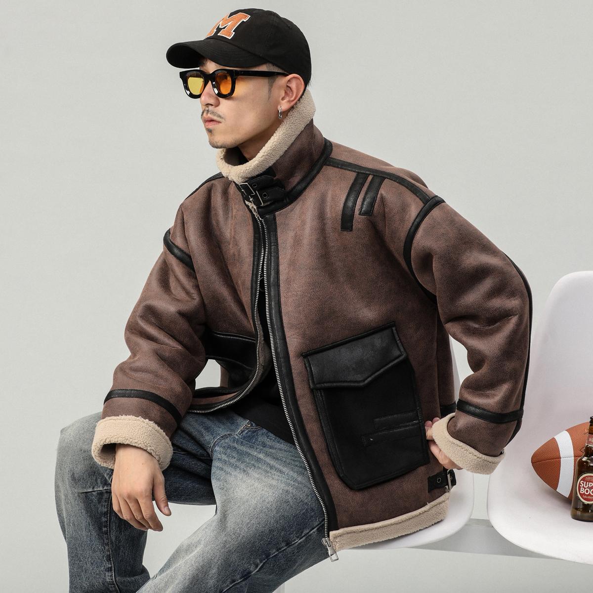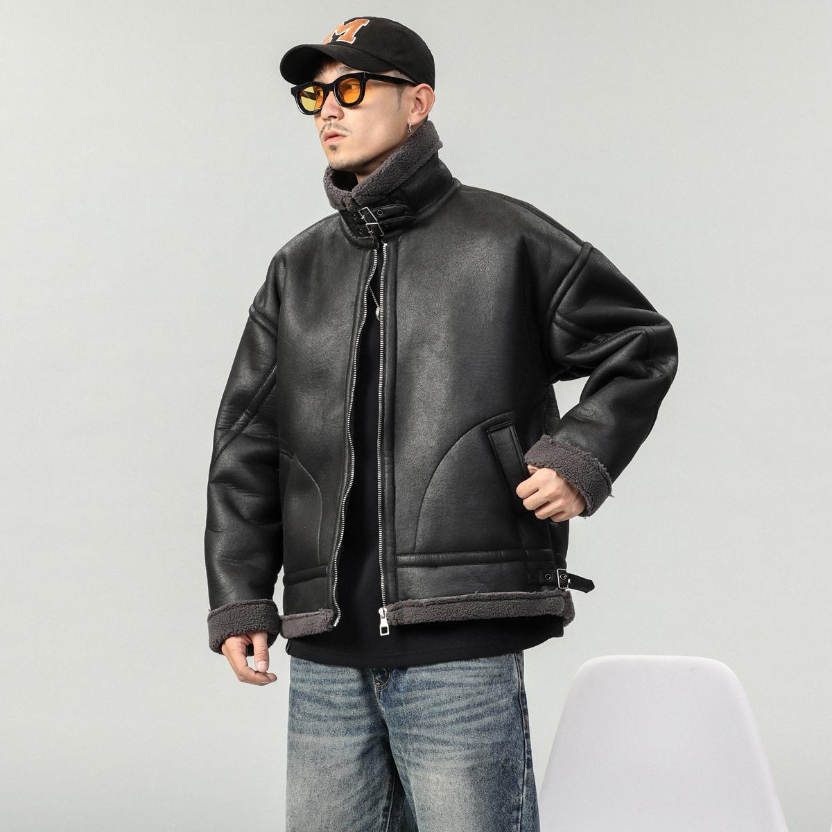 【YS2748】高街工装宽松立领羊羔绒机车外套夹克