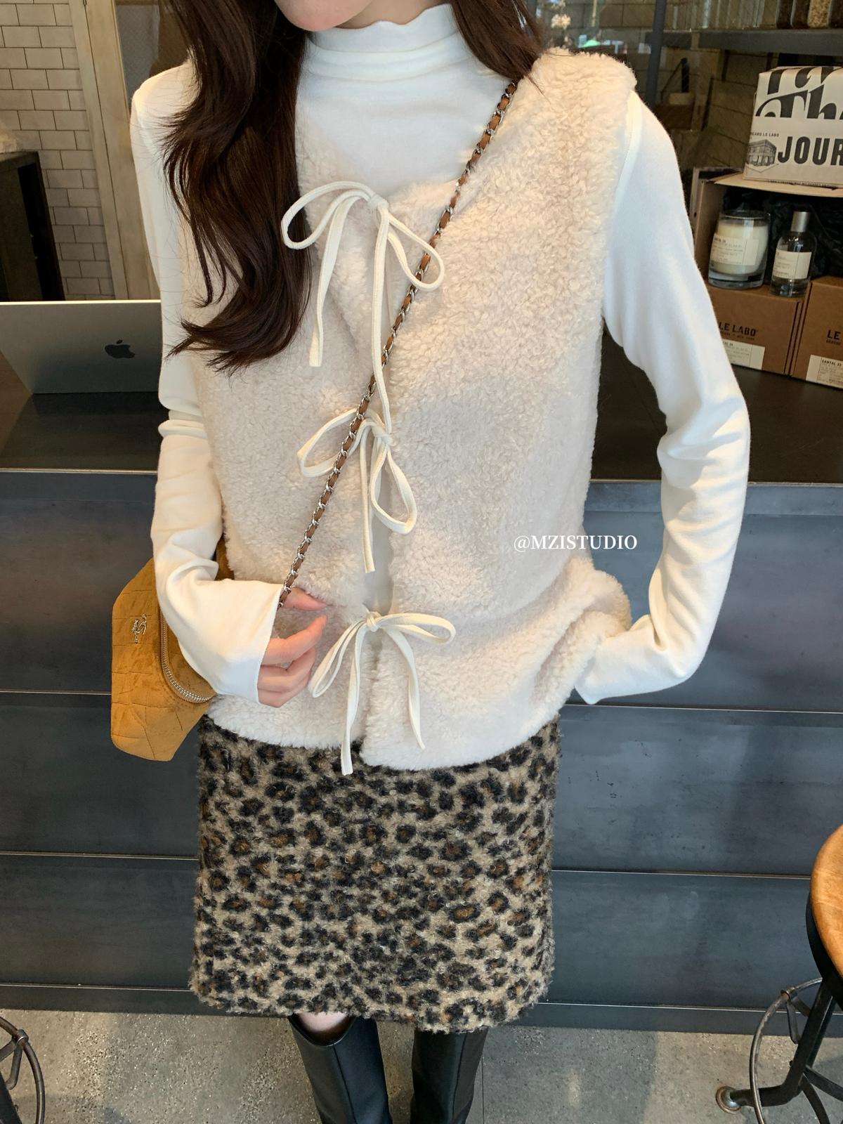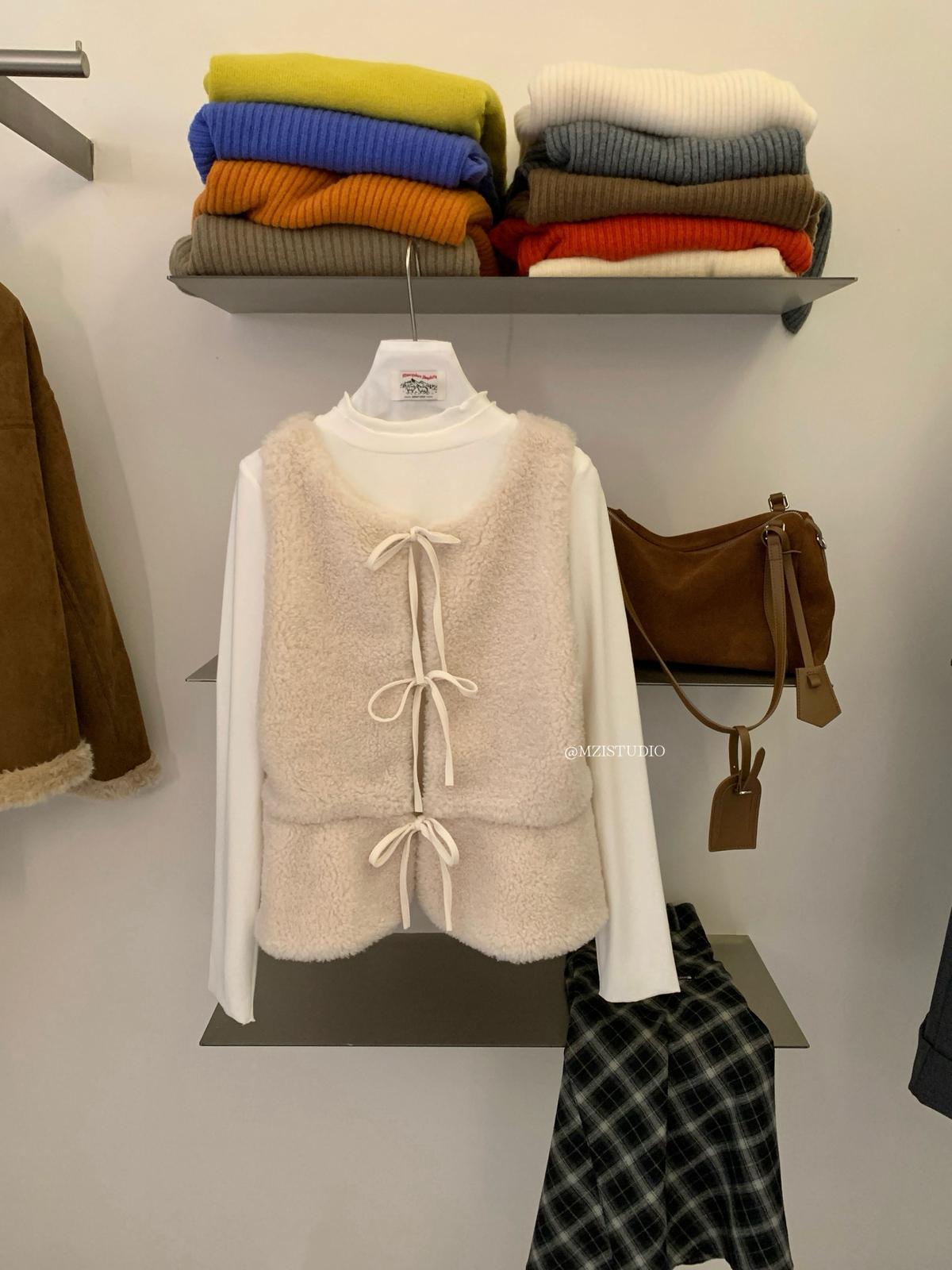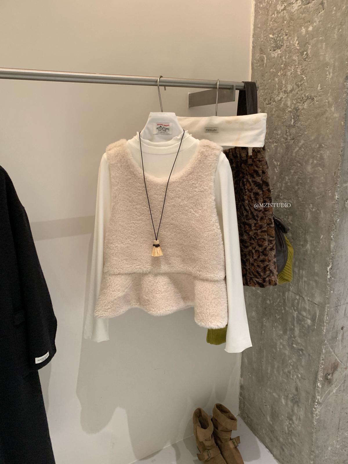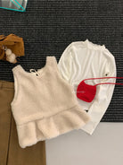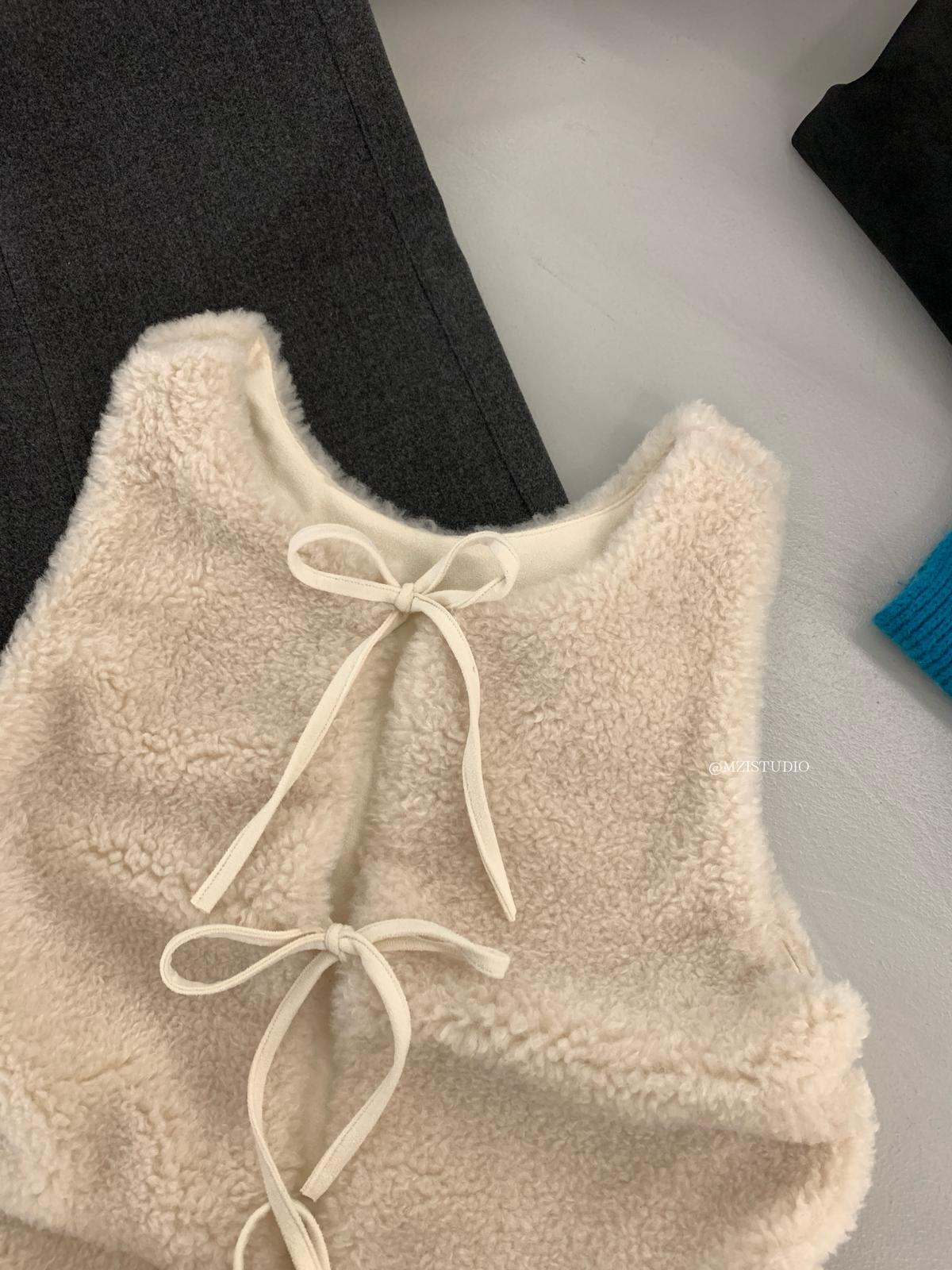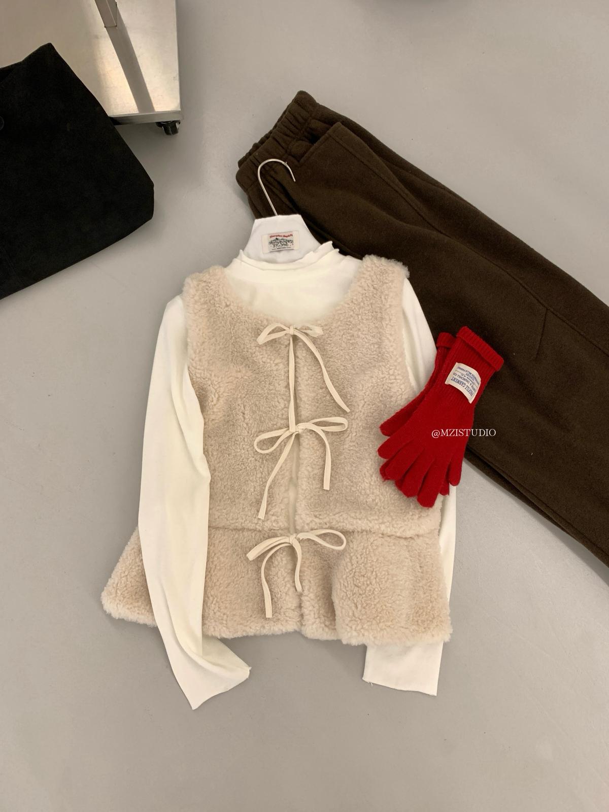【C8495】高甜疊穿搭配韓系歐尼冬季仿羊羔毛繫帶背心+木耳邊柔軟打底衫套裝