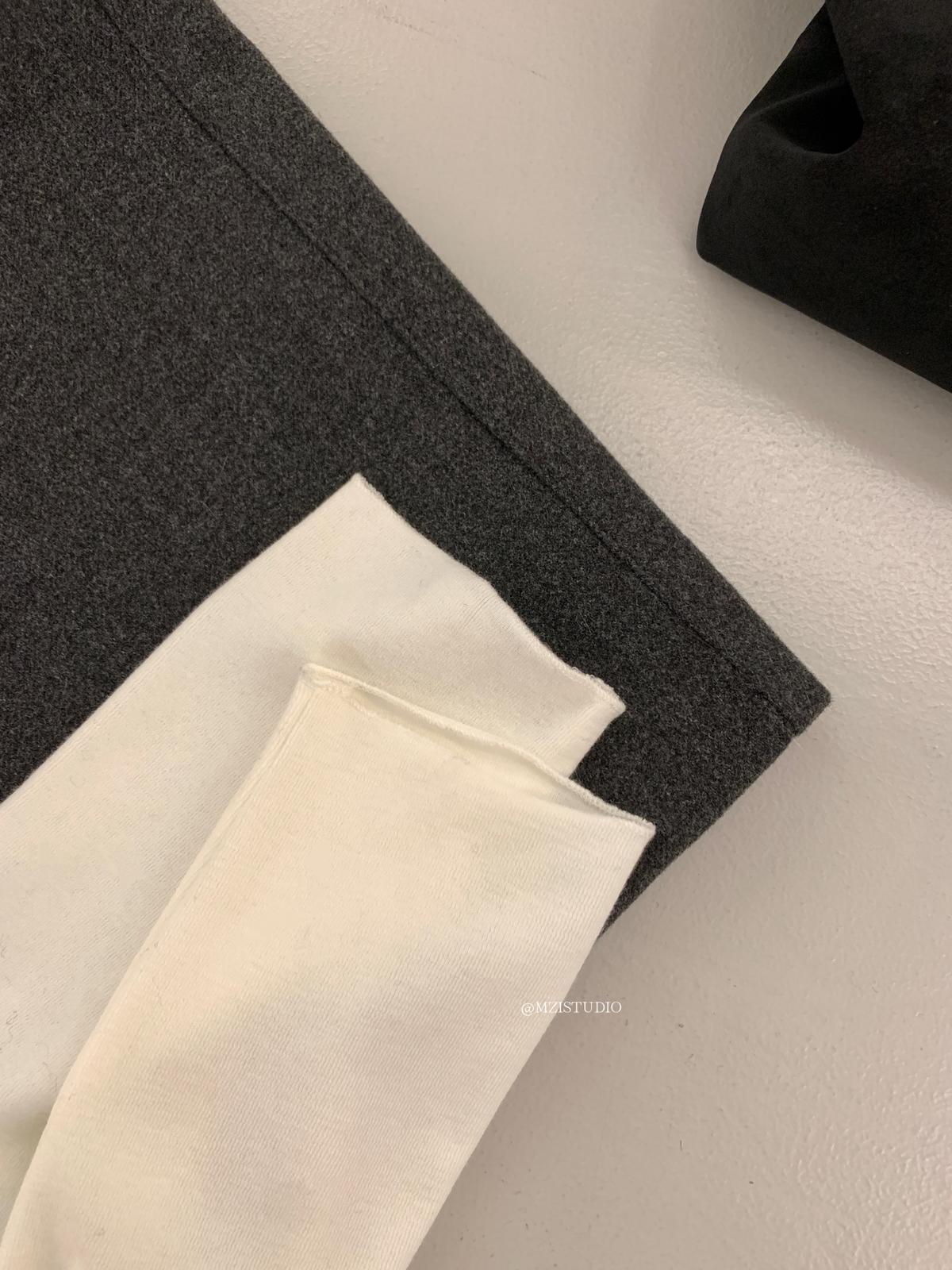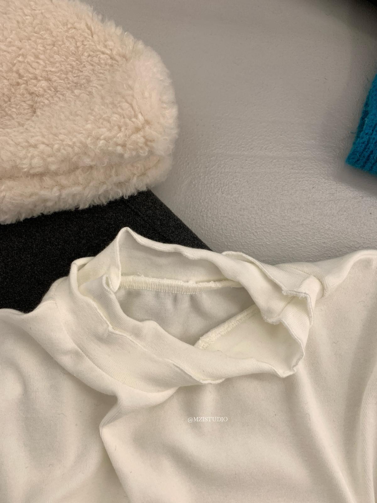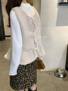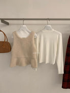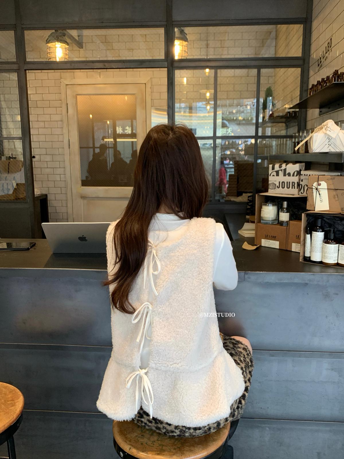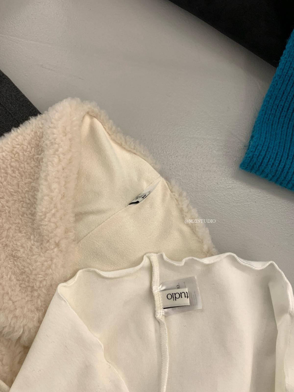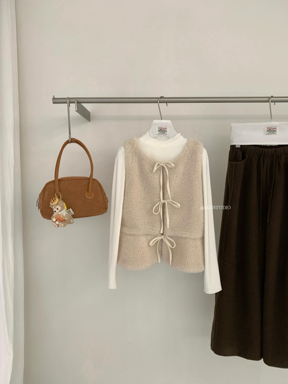【C8495】高甜疊穿搭配韓系歐尼冬季仿羊羔毛繫帶背心+木耳邊柔軟打底衫套裝