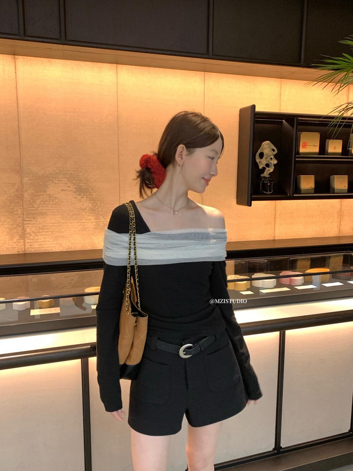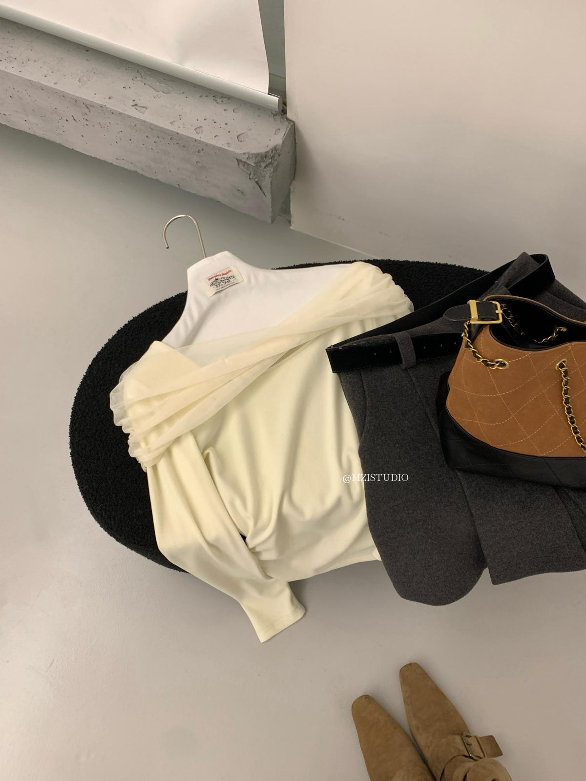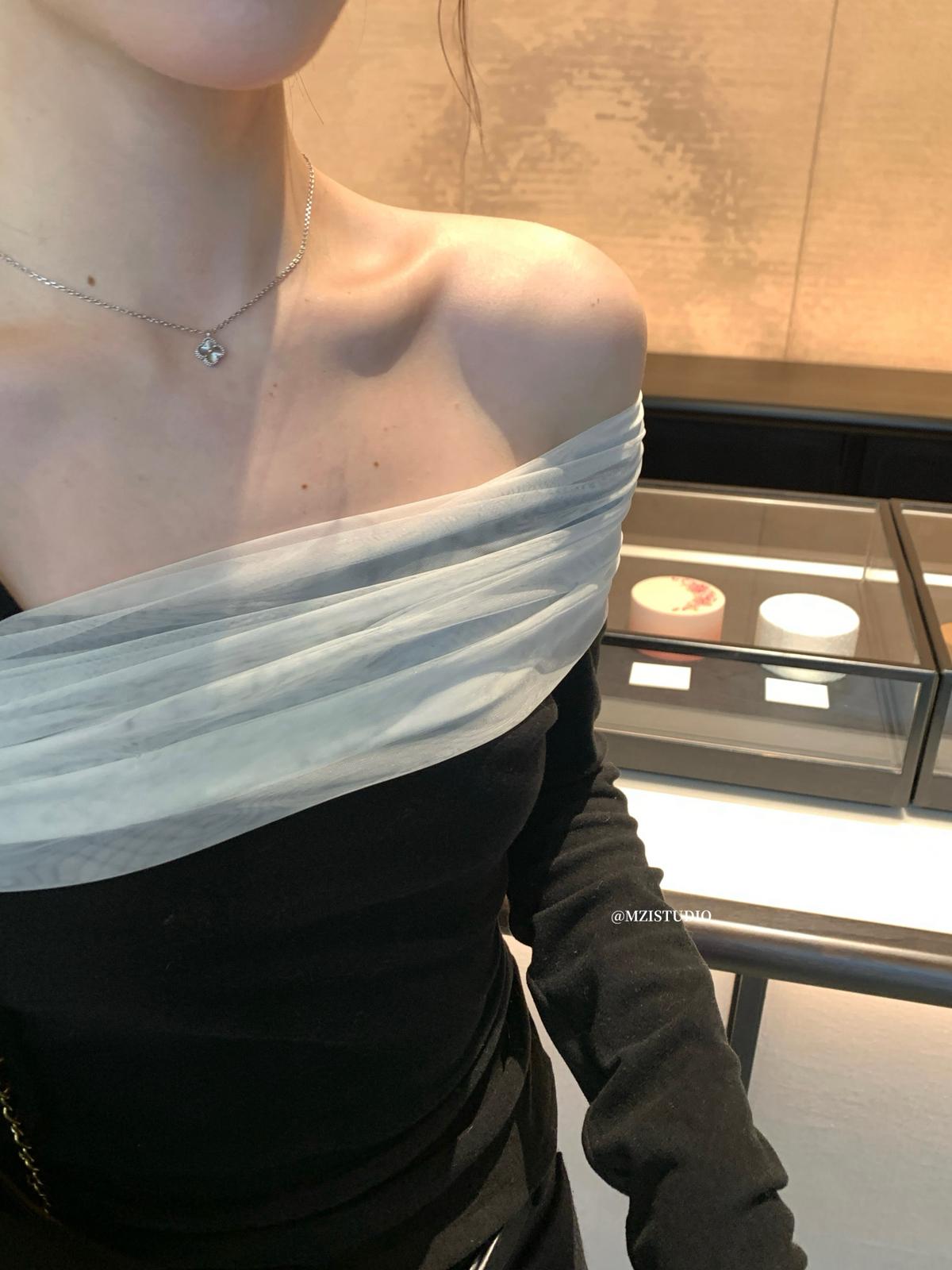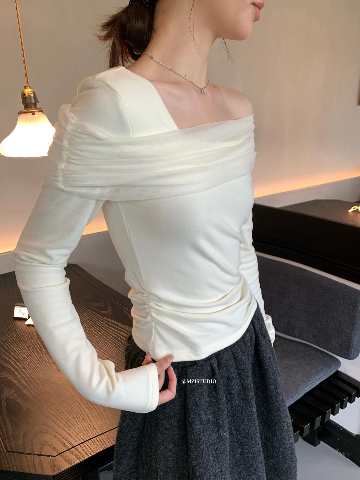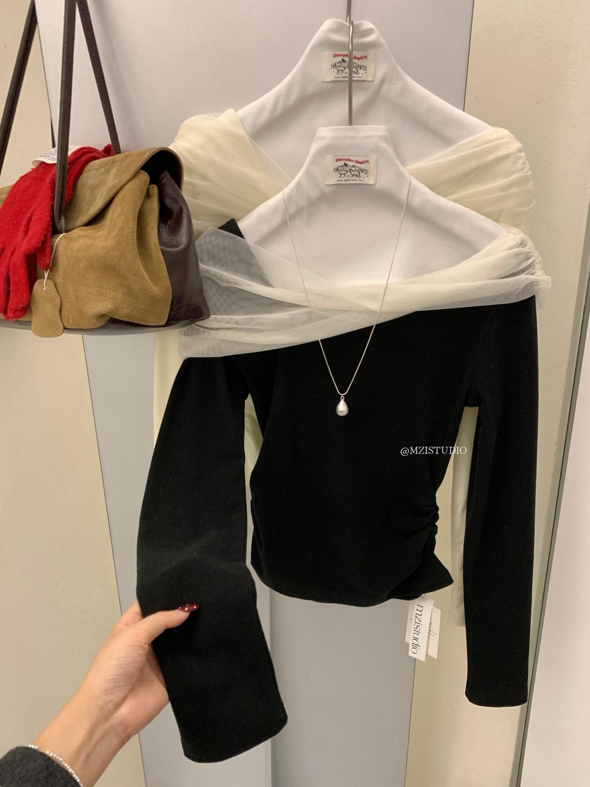 【C8496】超仙歐尼穿搭一字肩網紗拼接抽褶收腰顯瘦套頭小衫