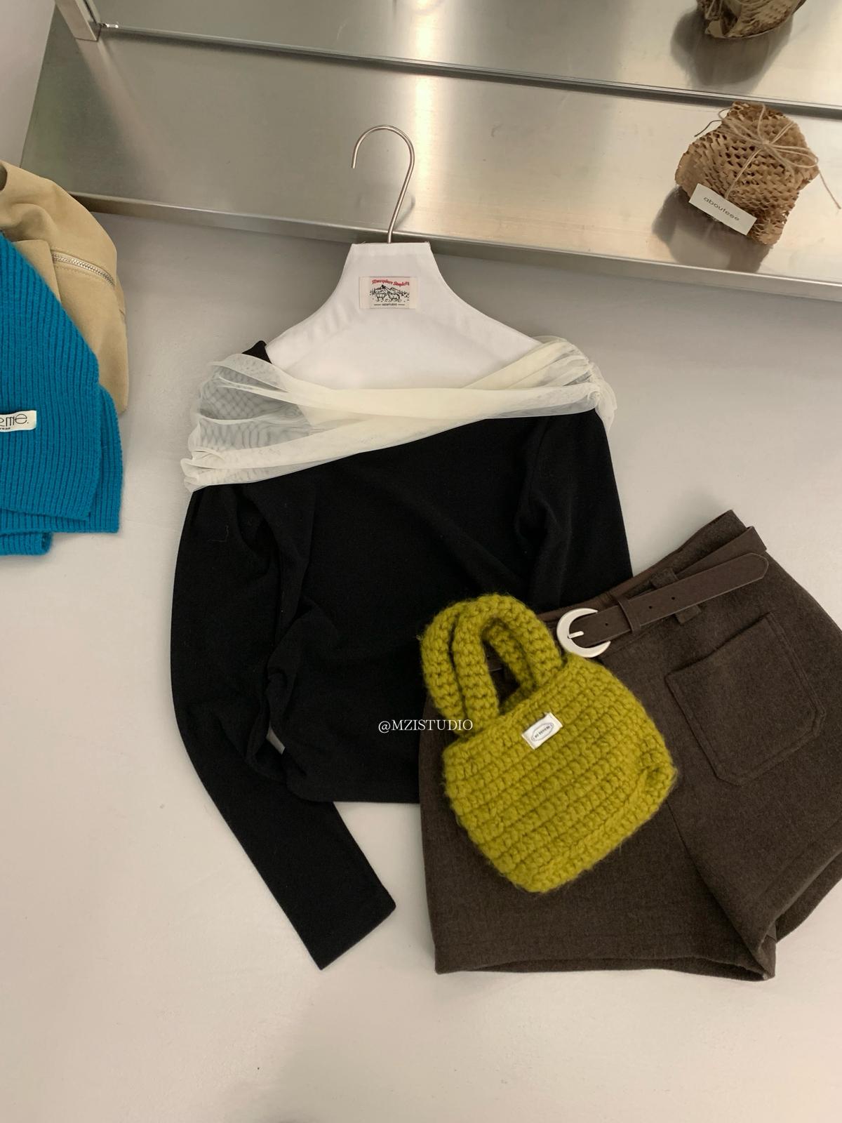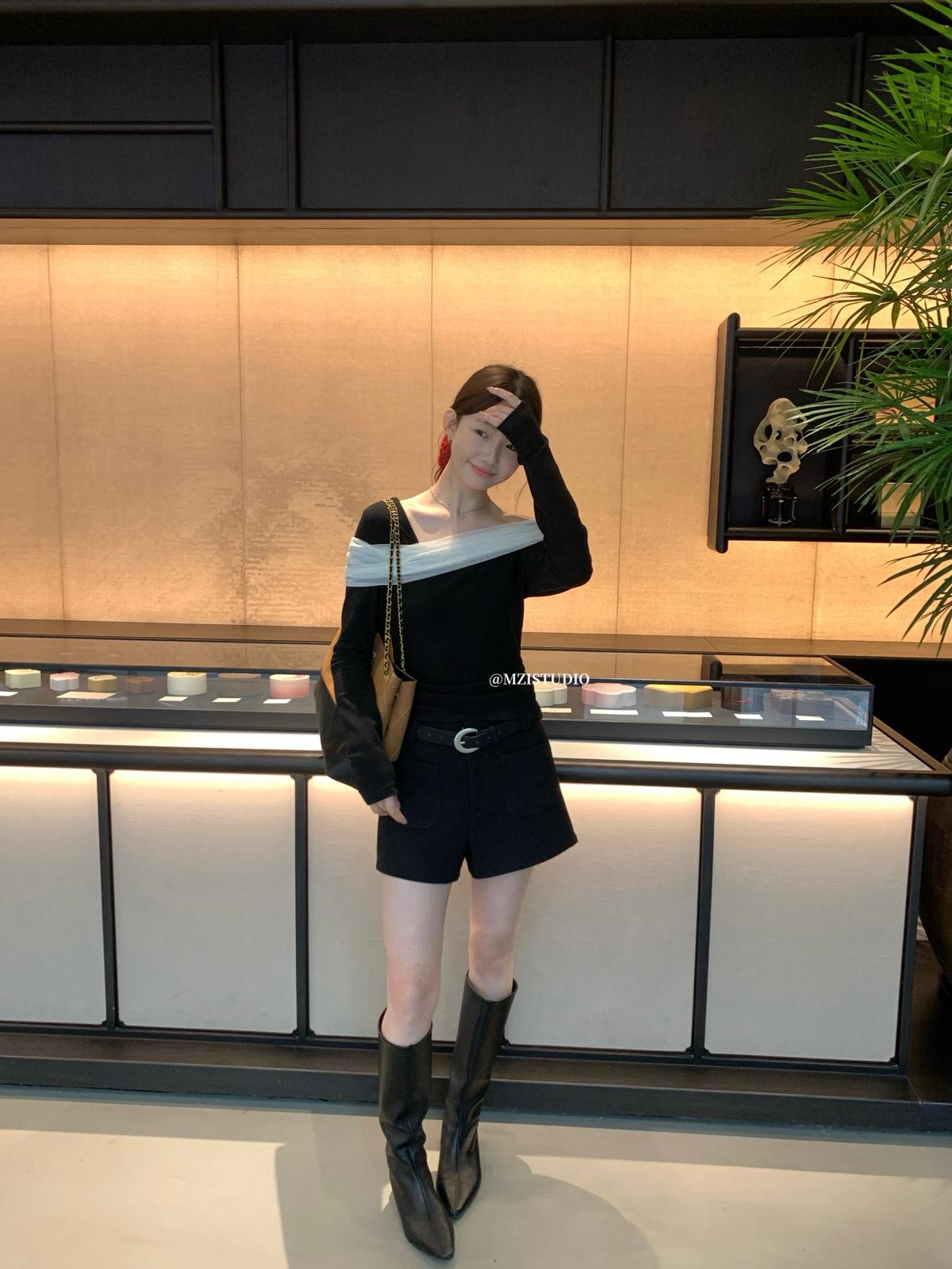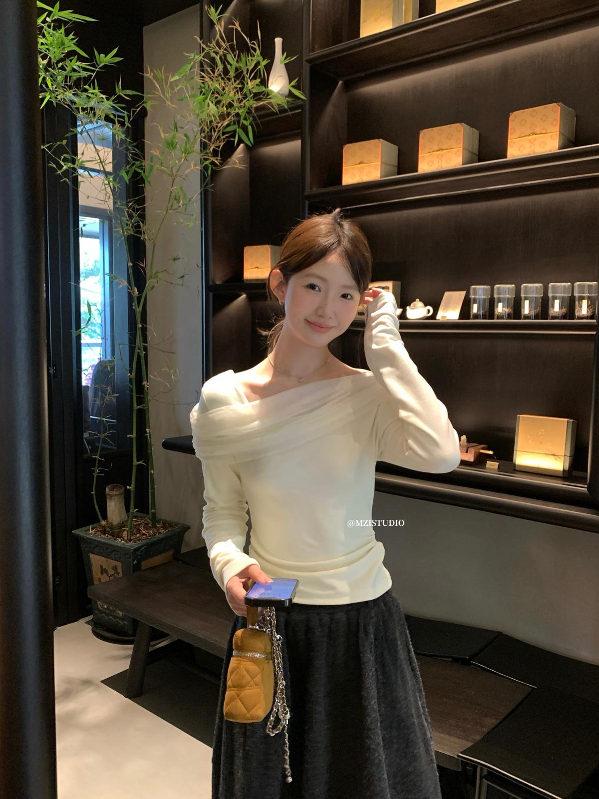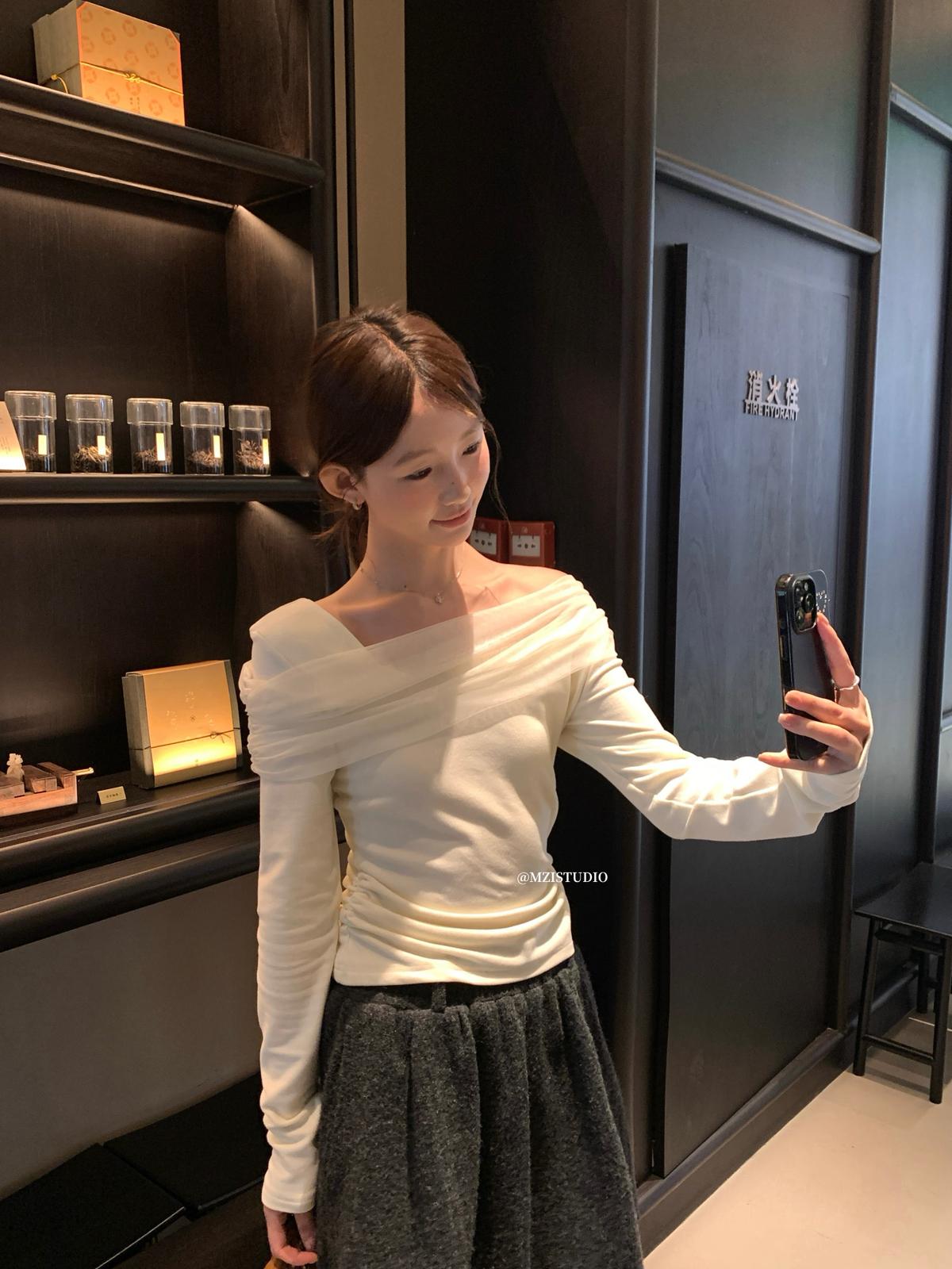 【C8496】超仙歐尼穿搭一字肩網紗拼接抽褶收腰顯瘦套頭小衫