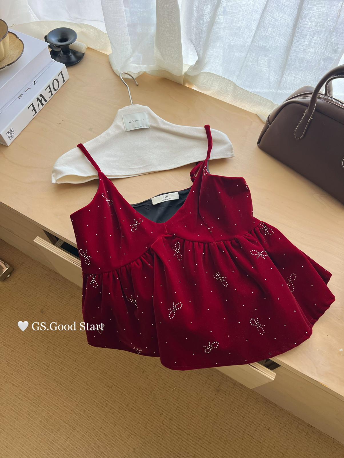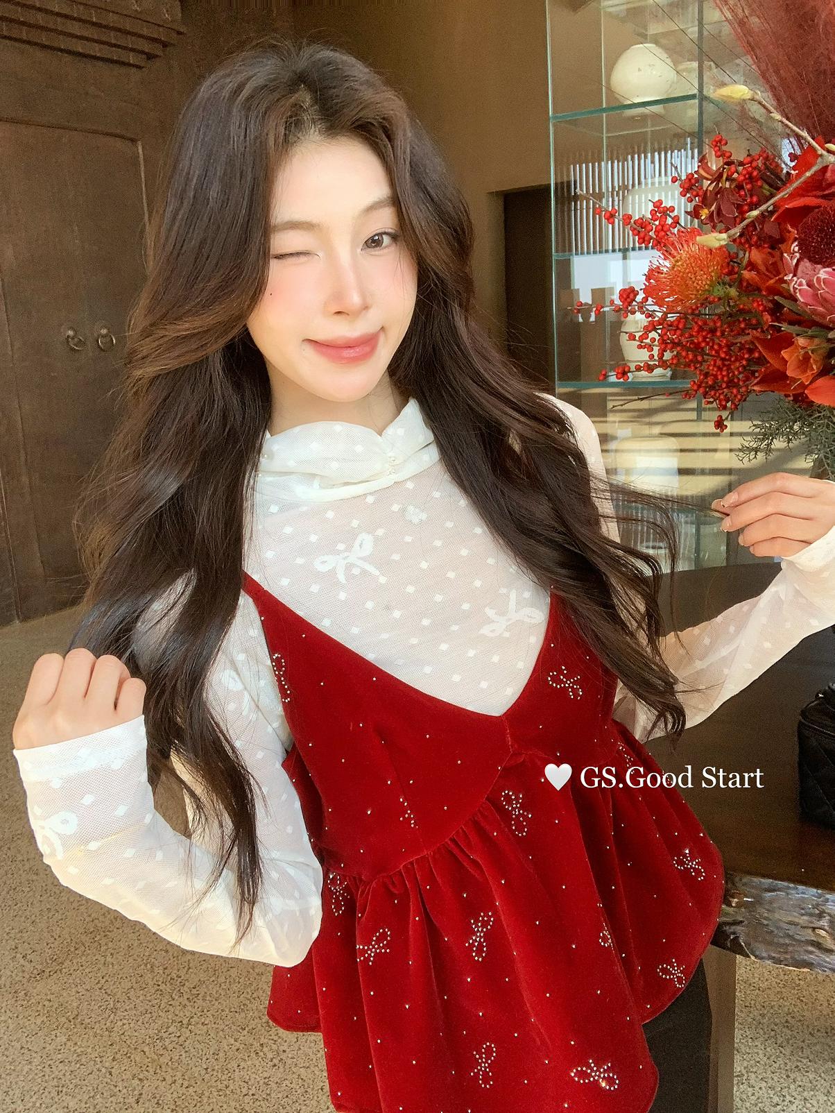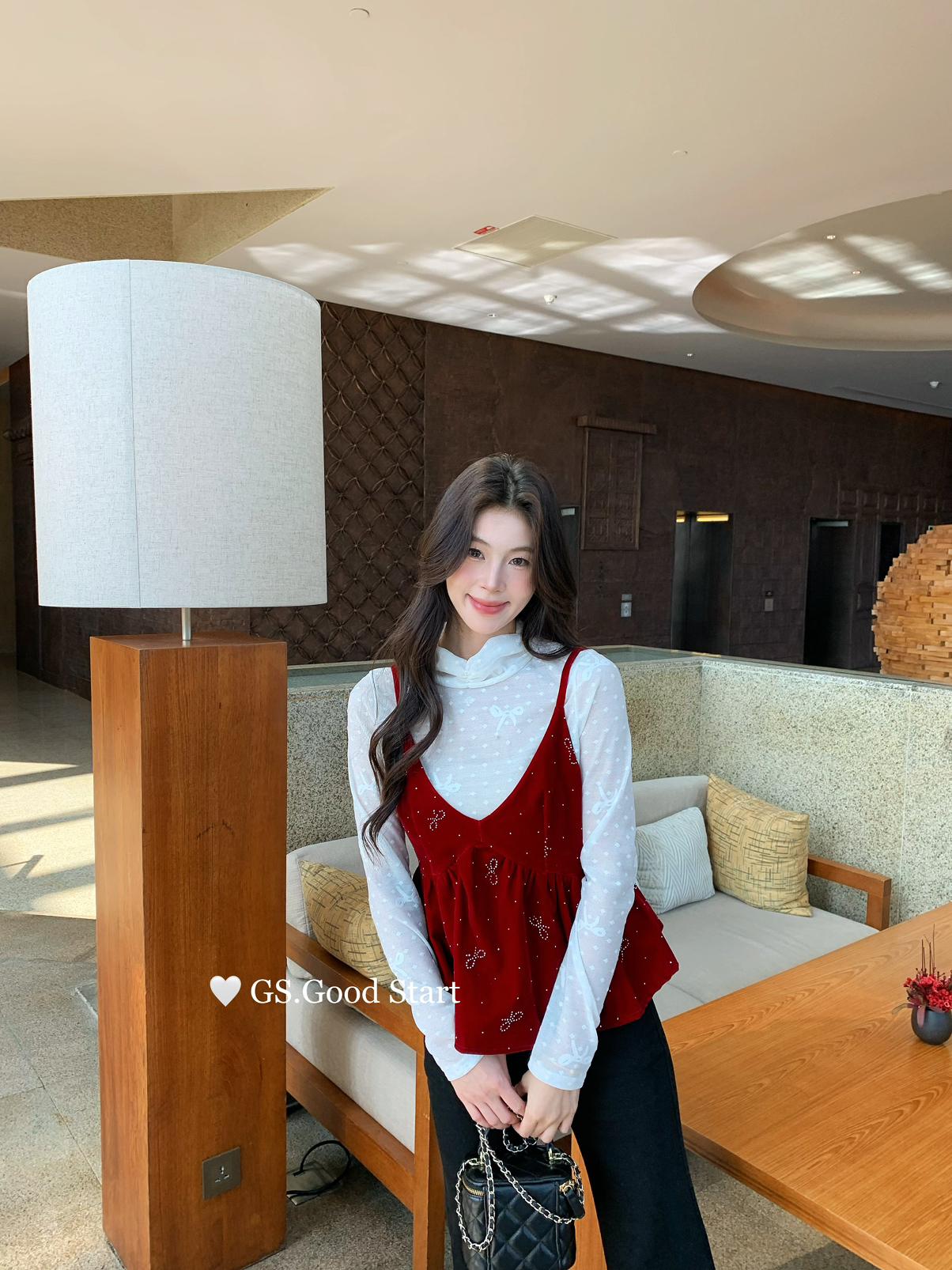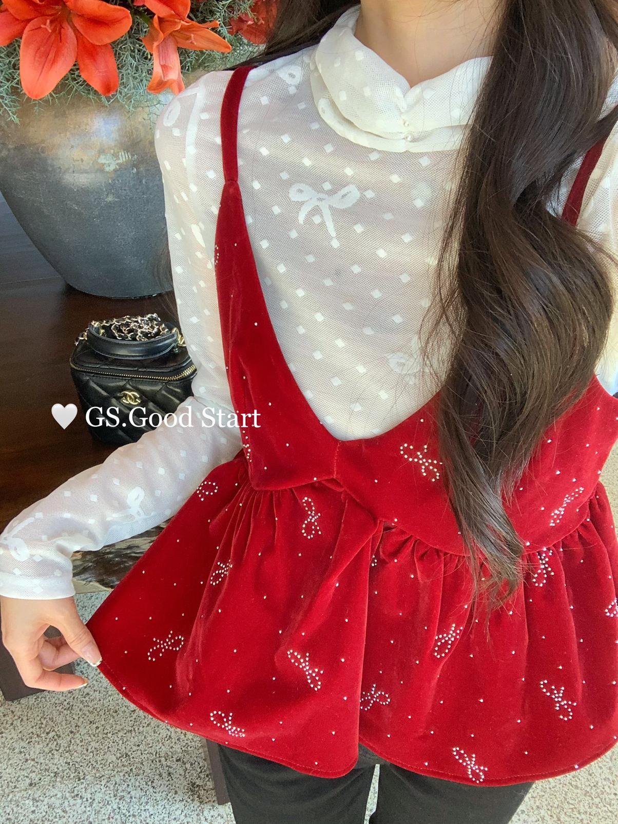 【C8497】發財新年紅!人人誇*開爆啦!法式復古絲絨燙鑽背心+波點小衫套裝