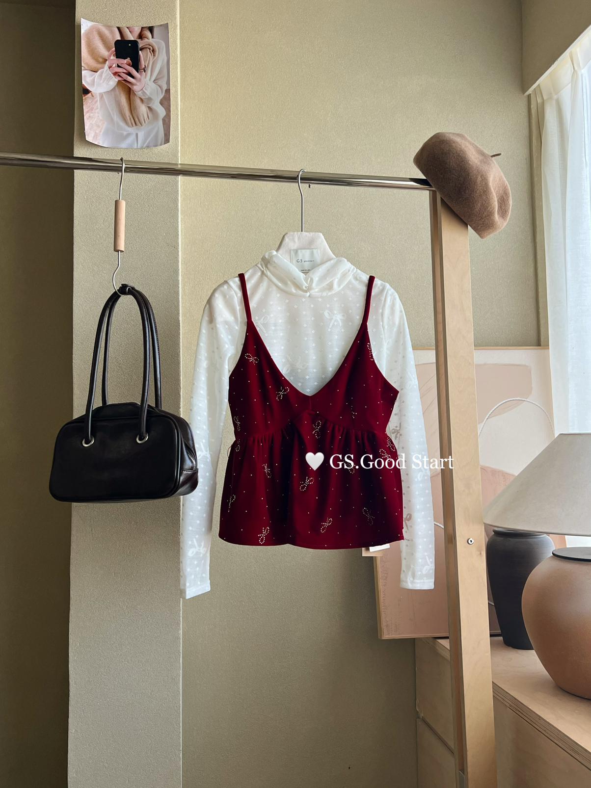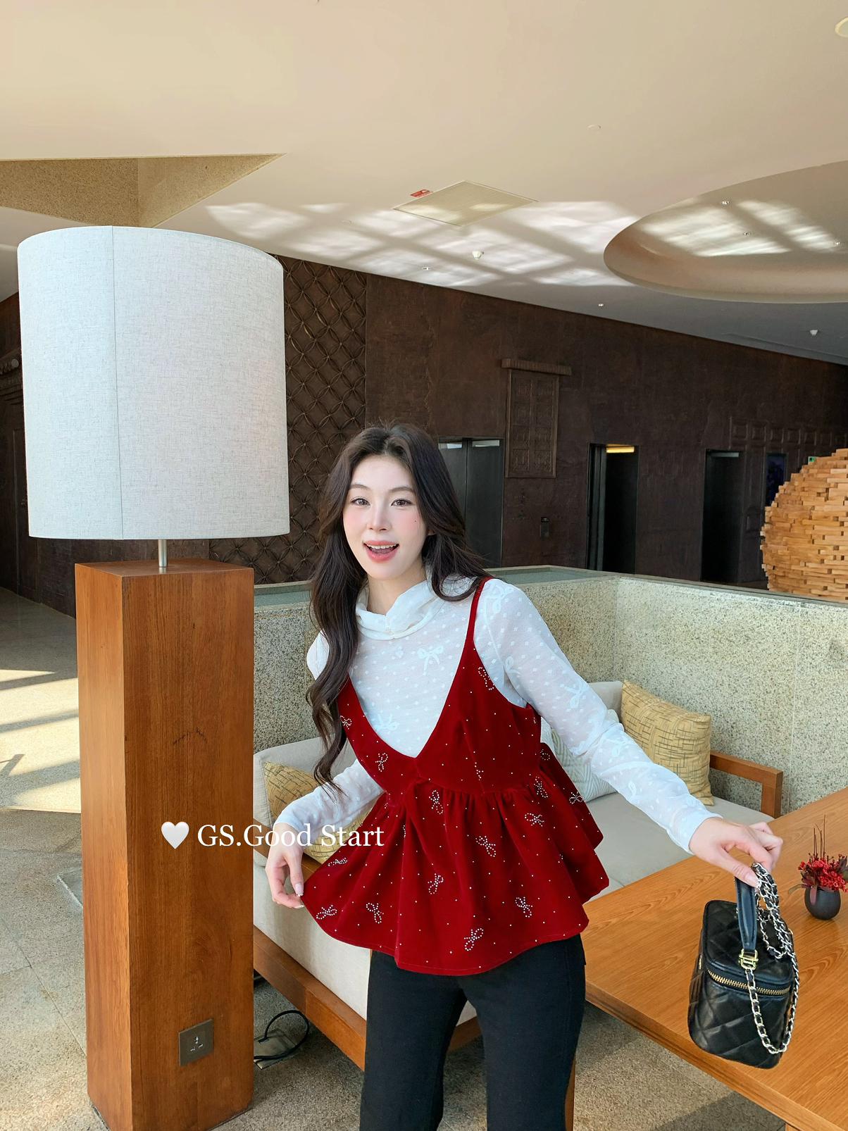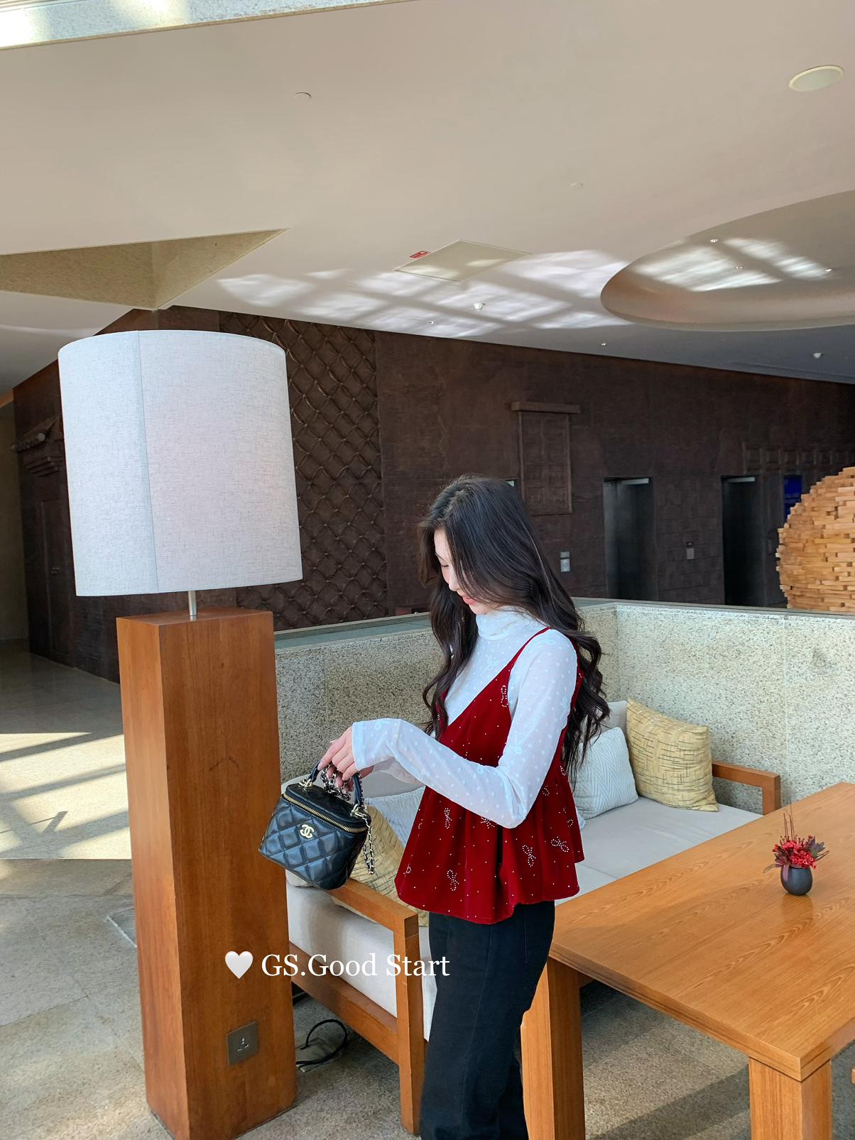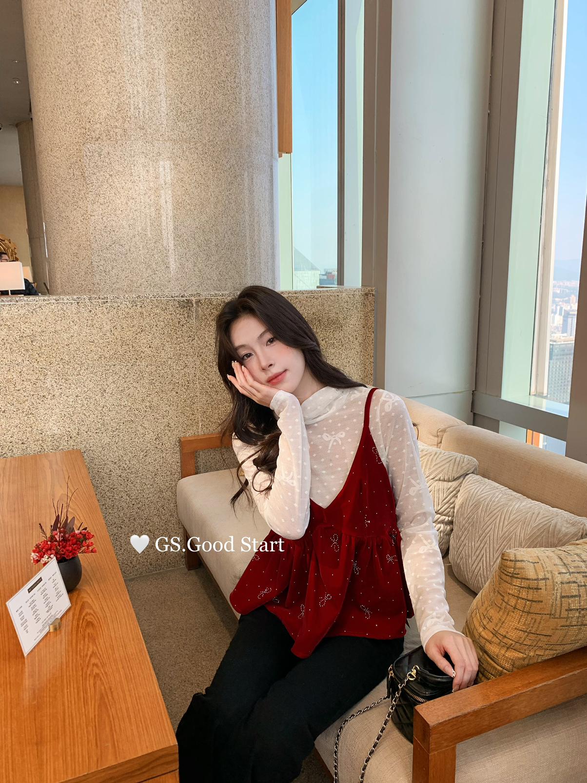 【C8497】發財新年紅!人人誇*開爆啦!法式復古絲絨燙鑽背心+波點小衫套裝
