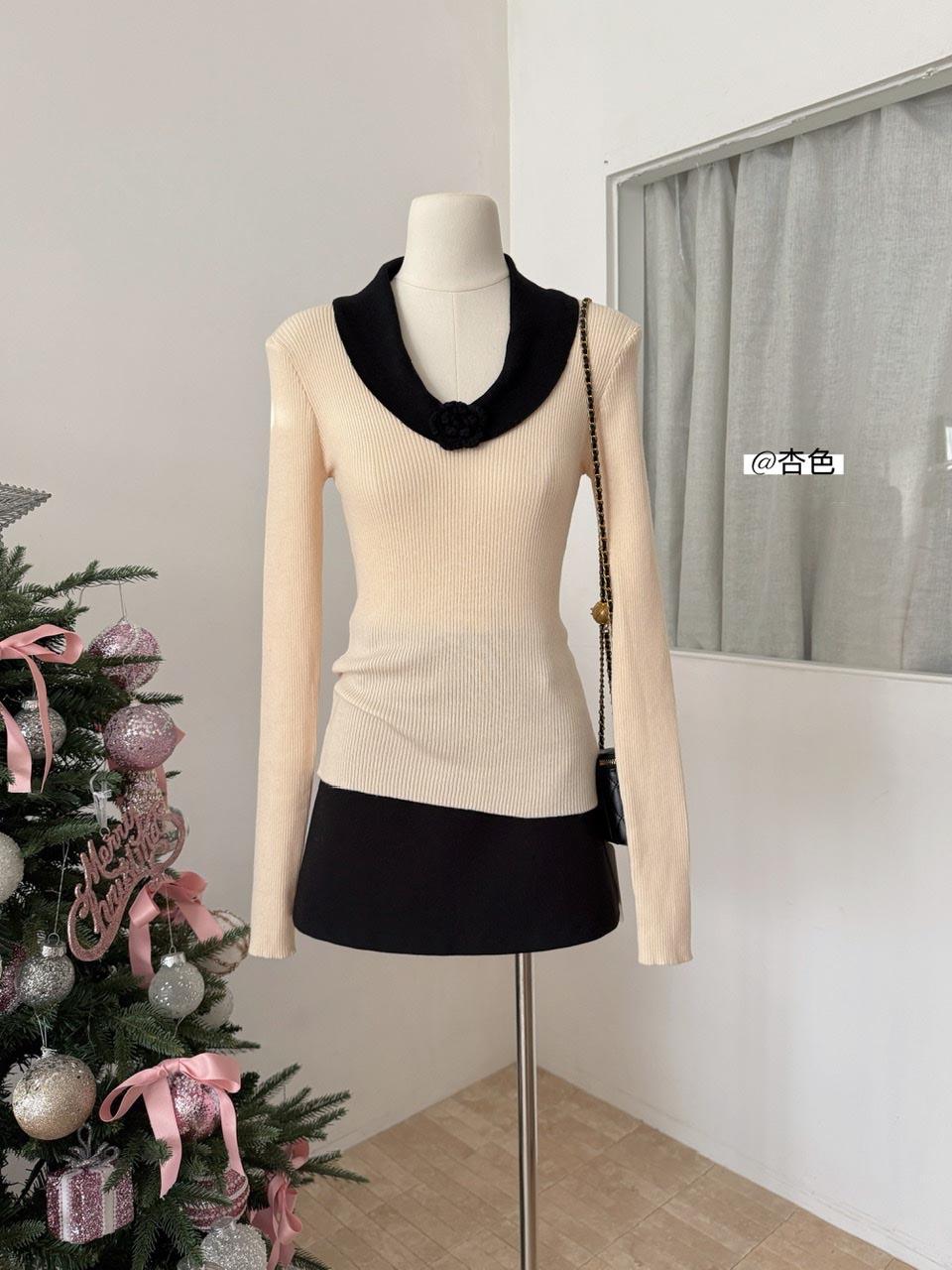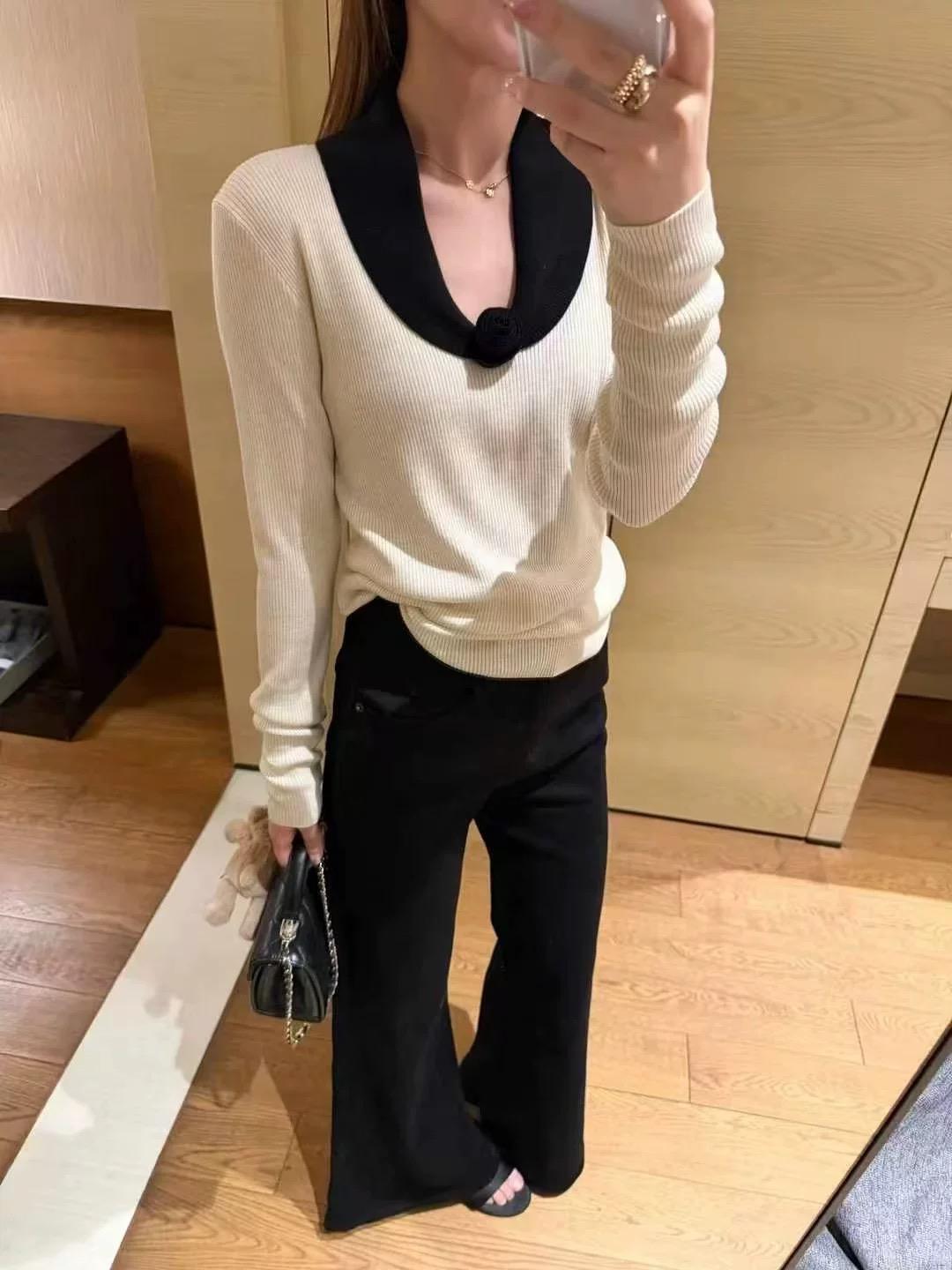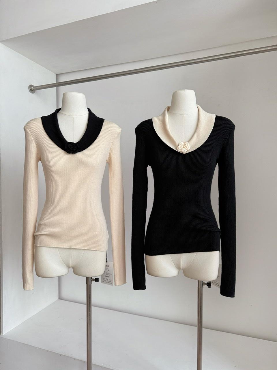 【C8499】翻領針織打底衫撞色氣質小花設計感內搭上衣小衆百搭針織衫(花朵不可拆卸)