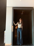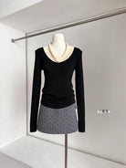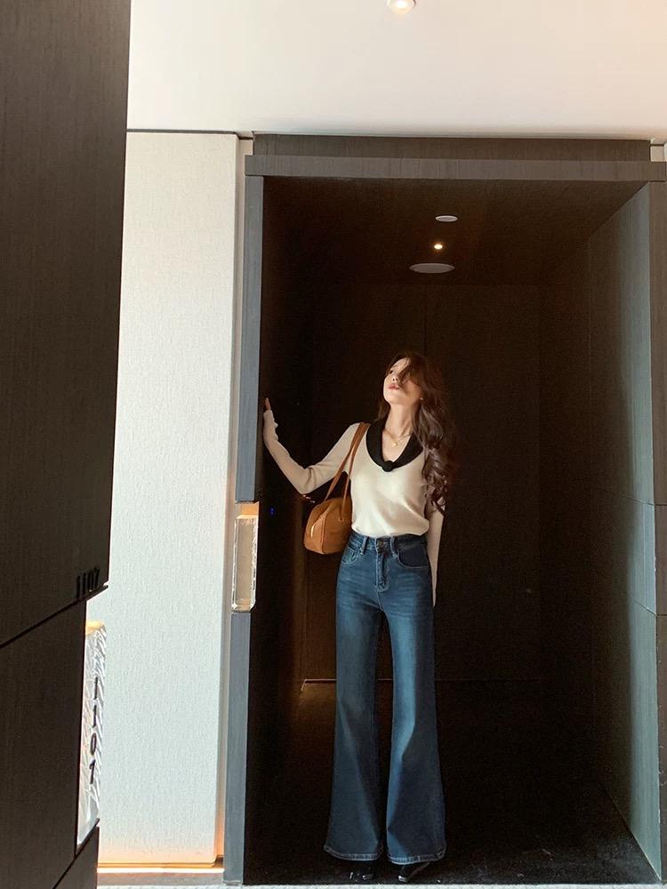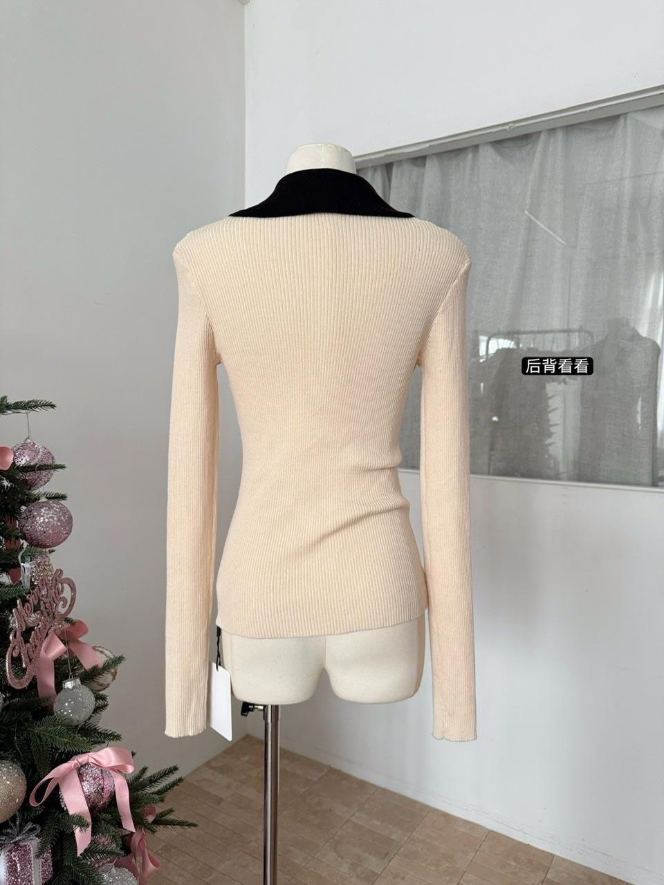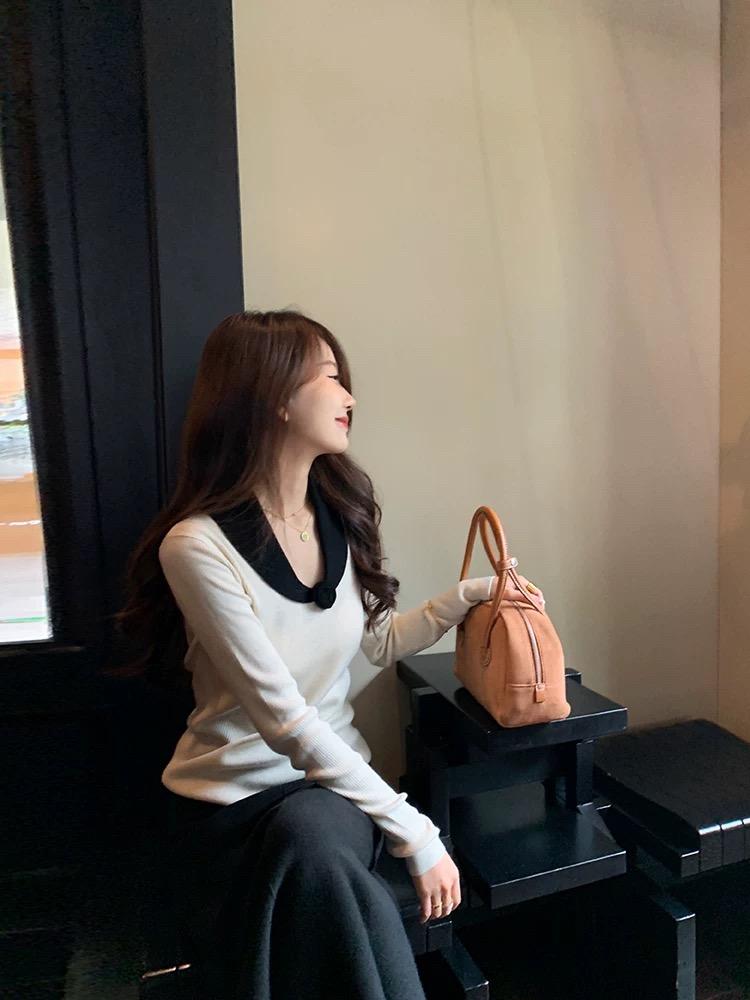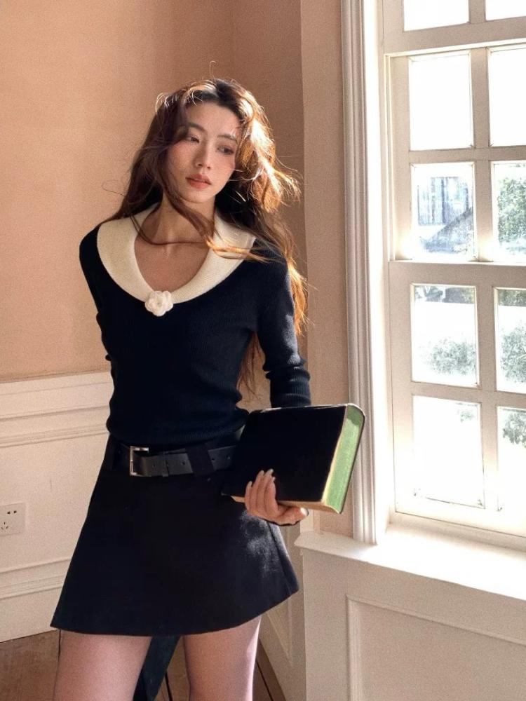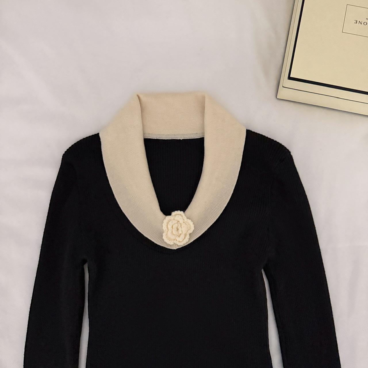 【C8499】翻領針織打底衫撞色氣質小花設計感內搭上衣小衆百搭針織衫(花朵不可拆卸)