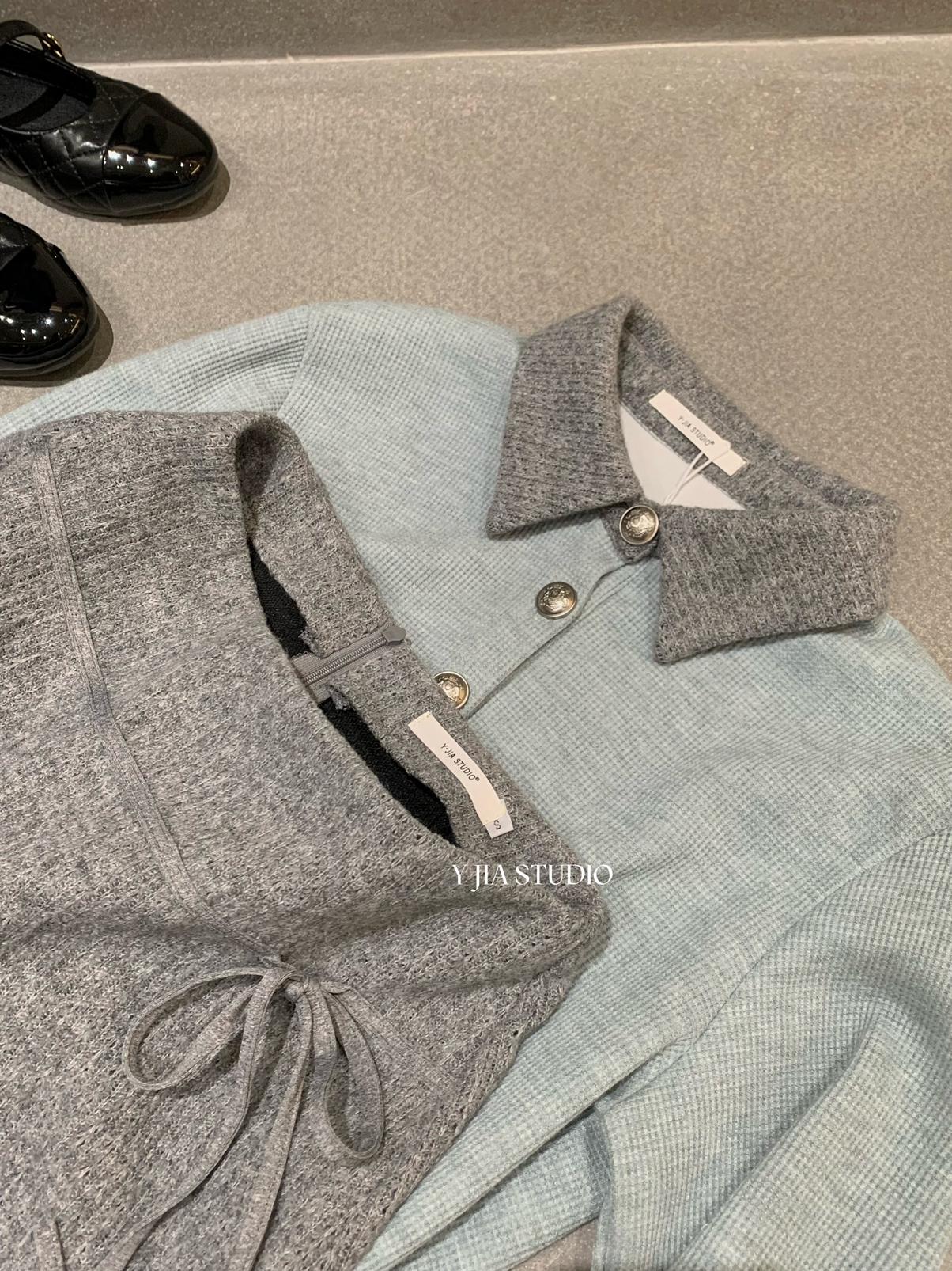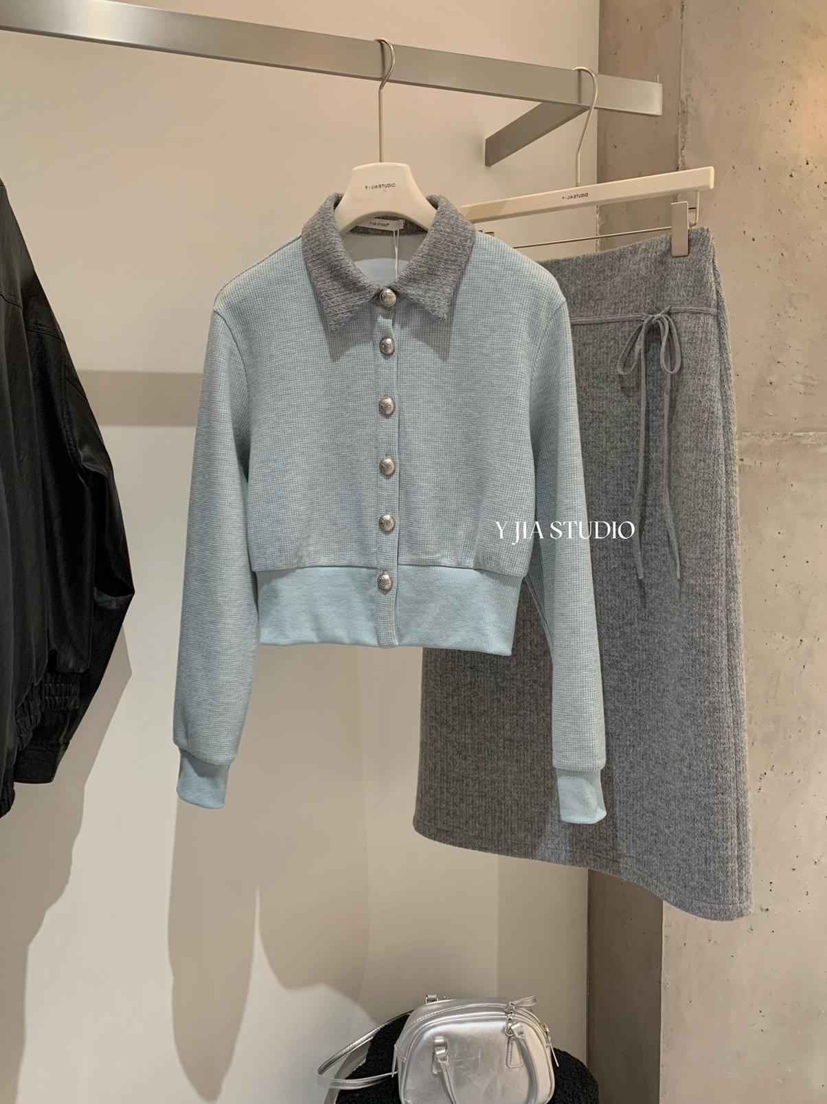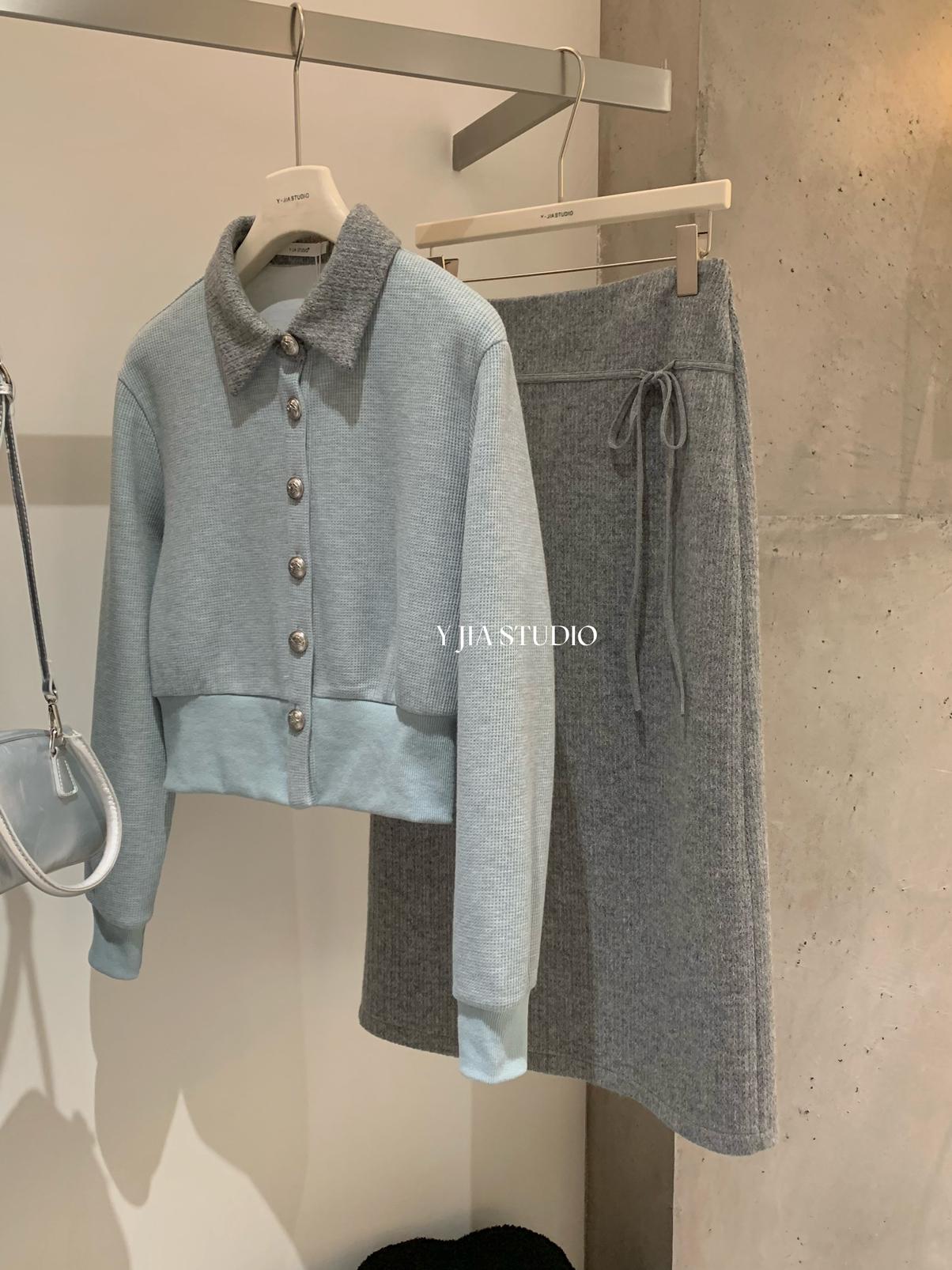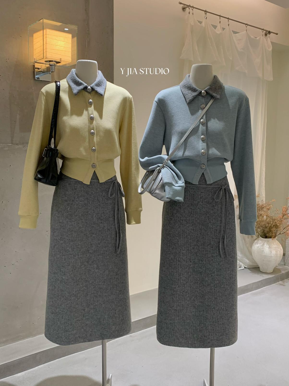 【C8530】“江南美人”高智感撞色假兩件針織開衫+設計感綁帶蝴蝶結半身裙套裝