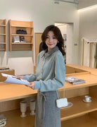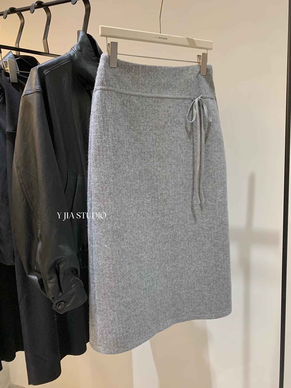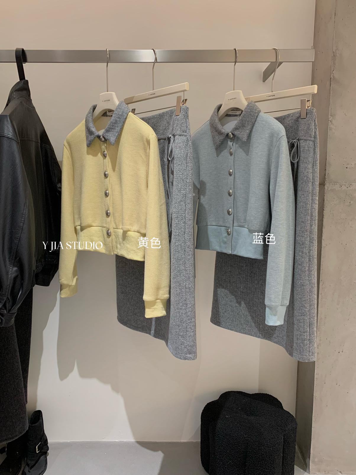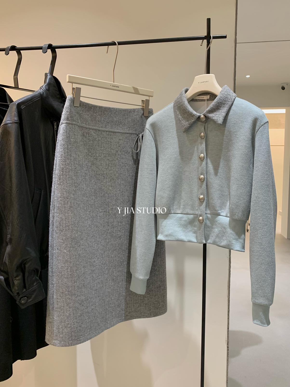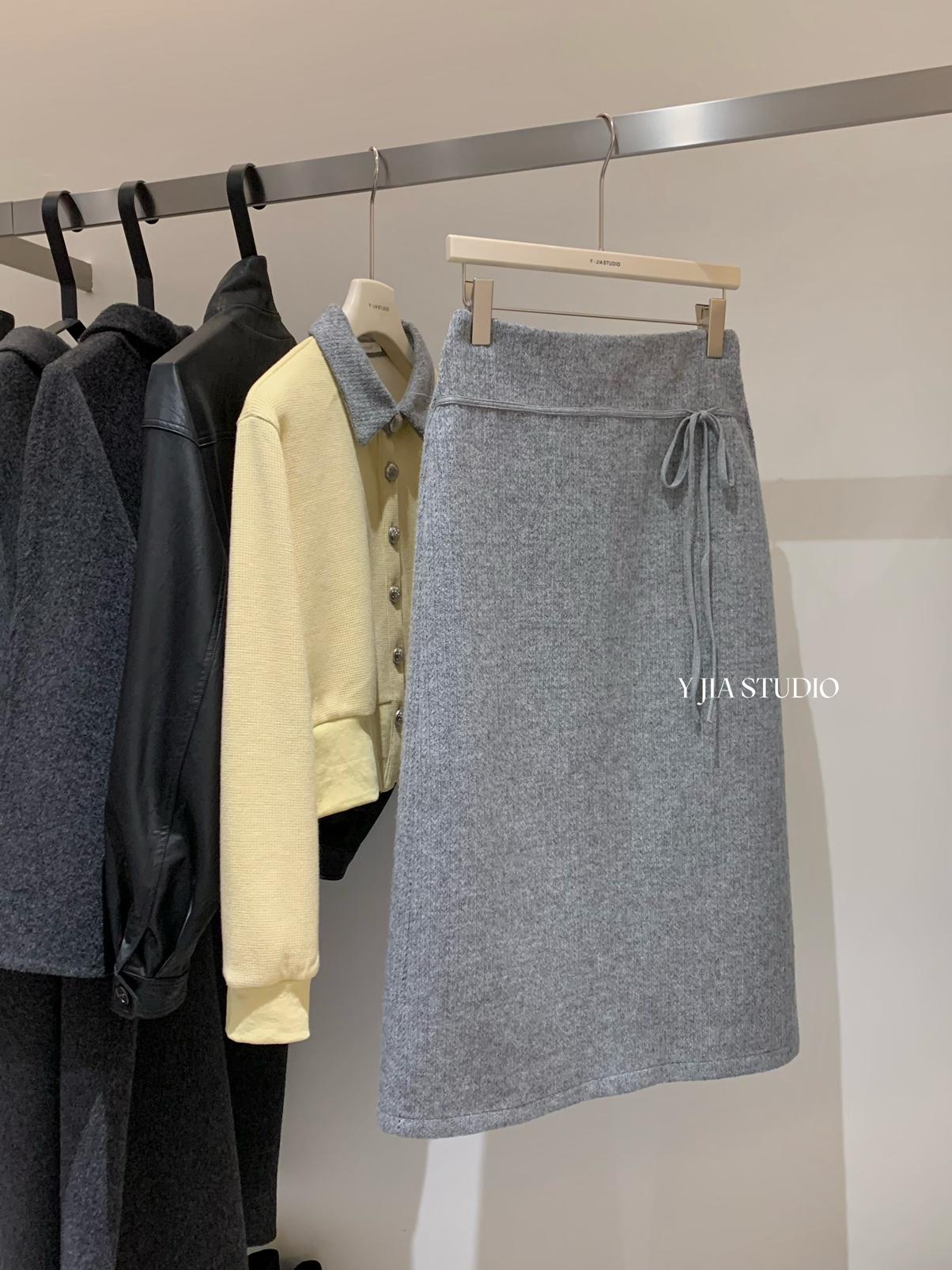 【C8530】“江南美人”高智感撞色假兩件針織開衫+設計感綁帶蝴蝶結半身裙套裝