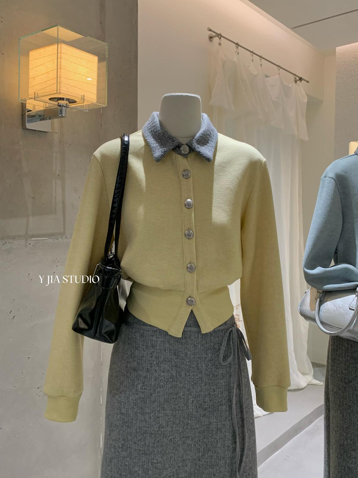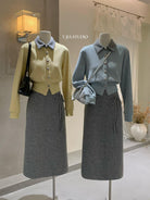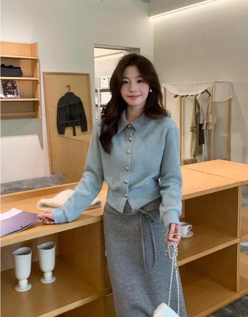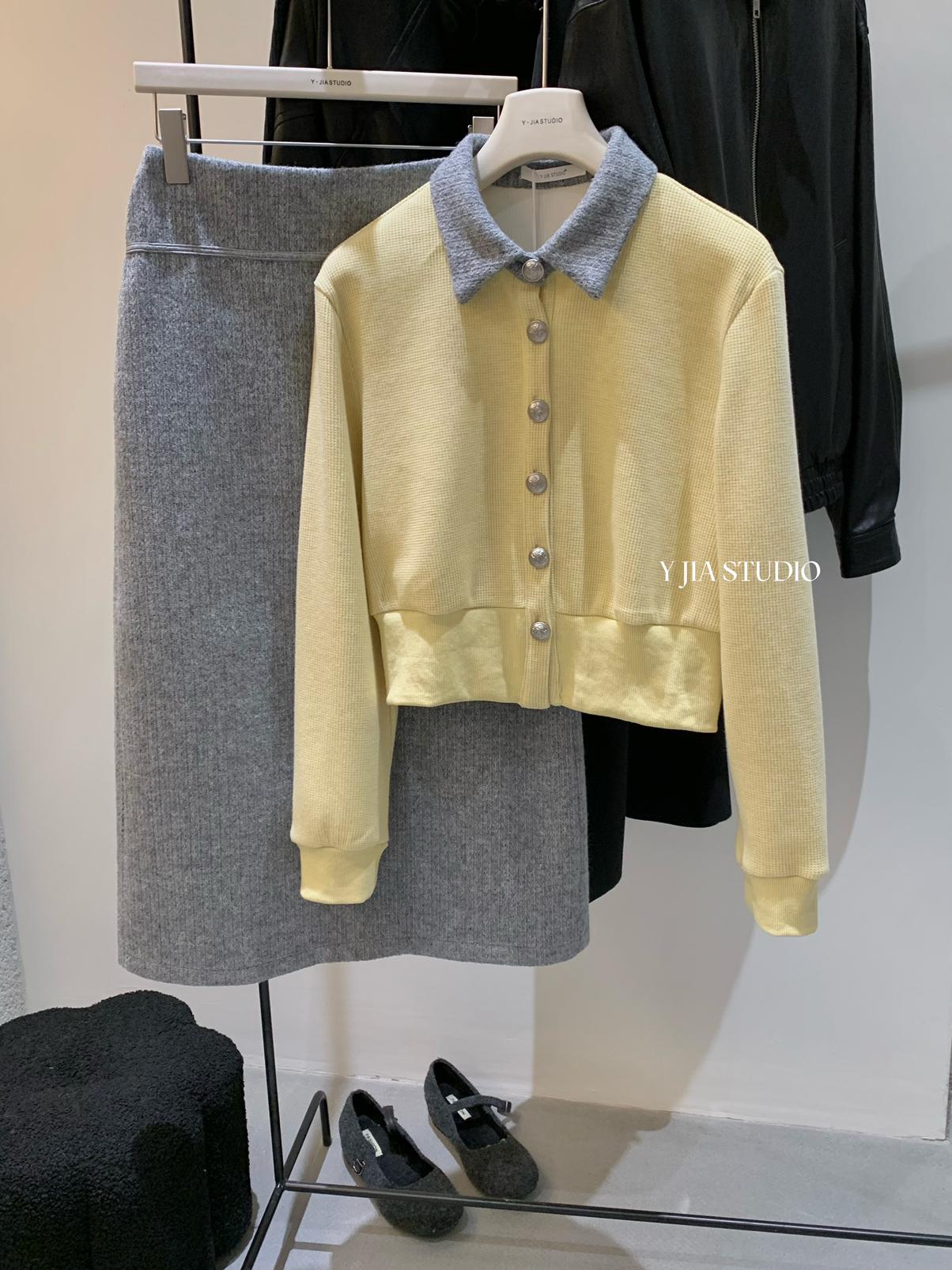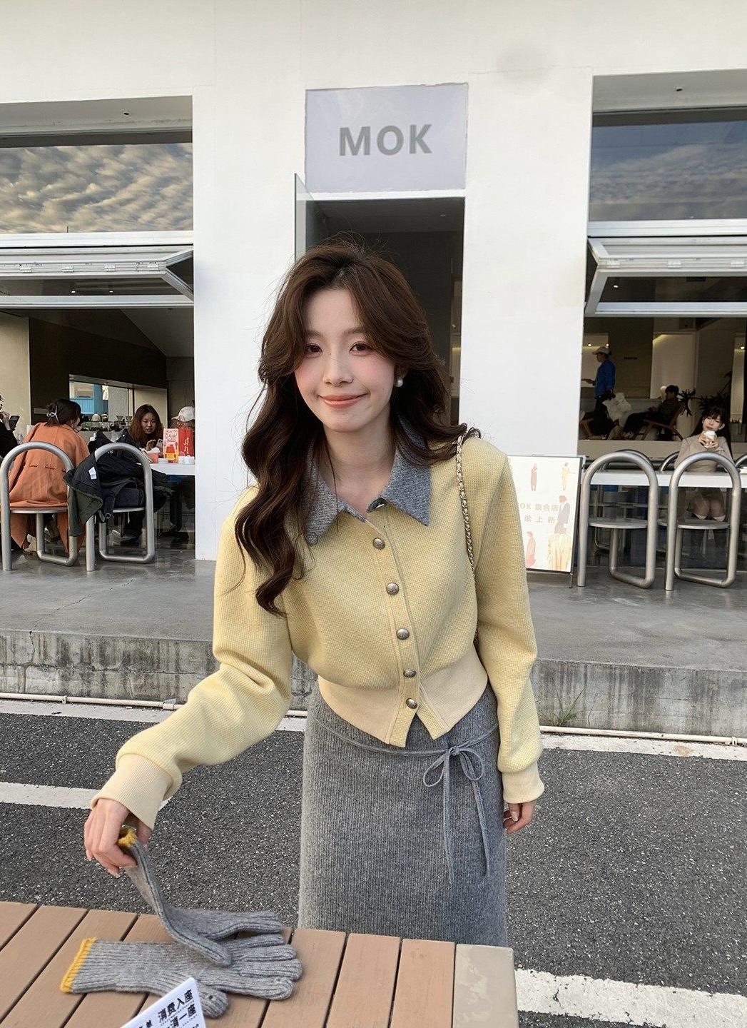 【C8530】“江南美人”高智感撞色假兩件針織開衫+設計感綁帶蝴蝶結半身裙套裝
