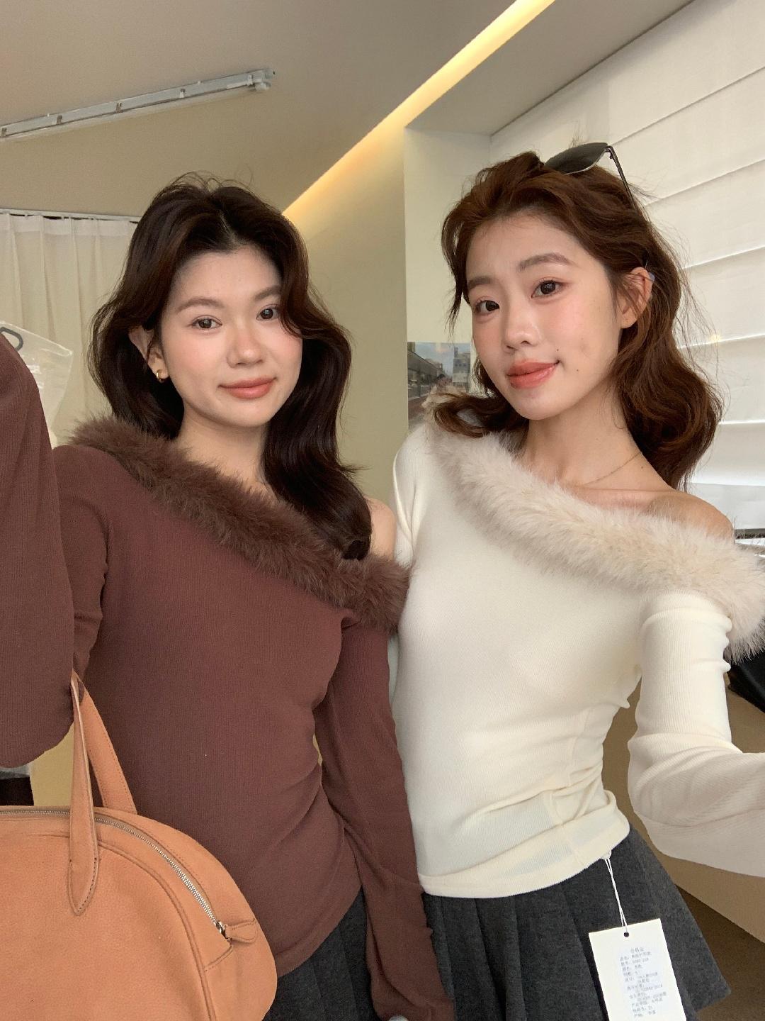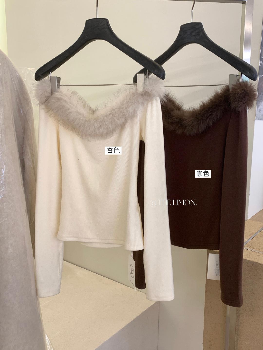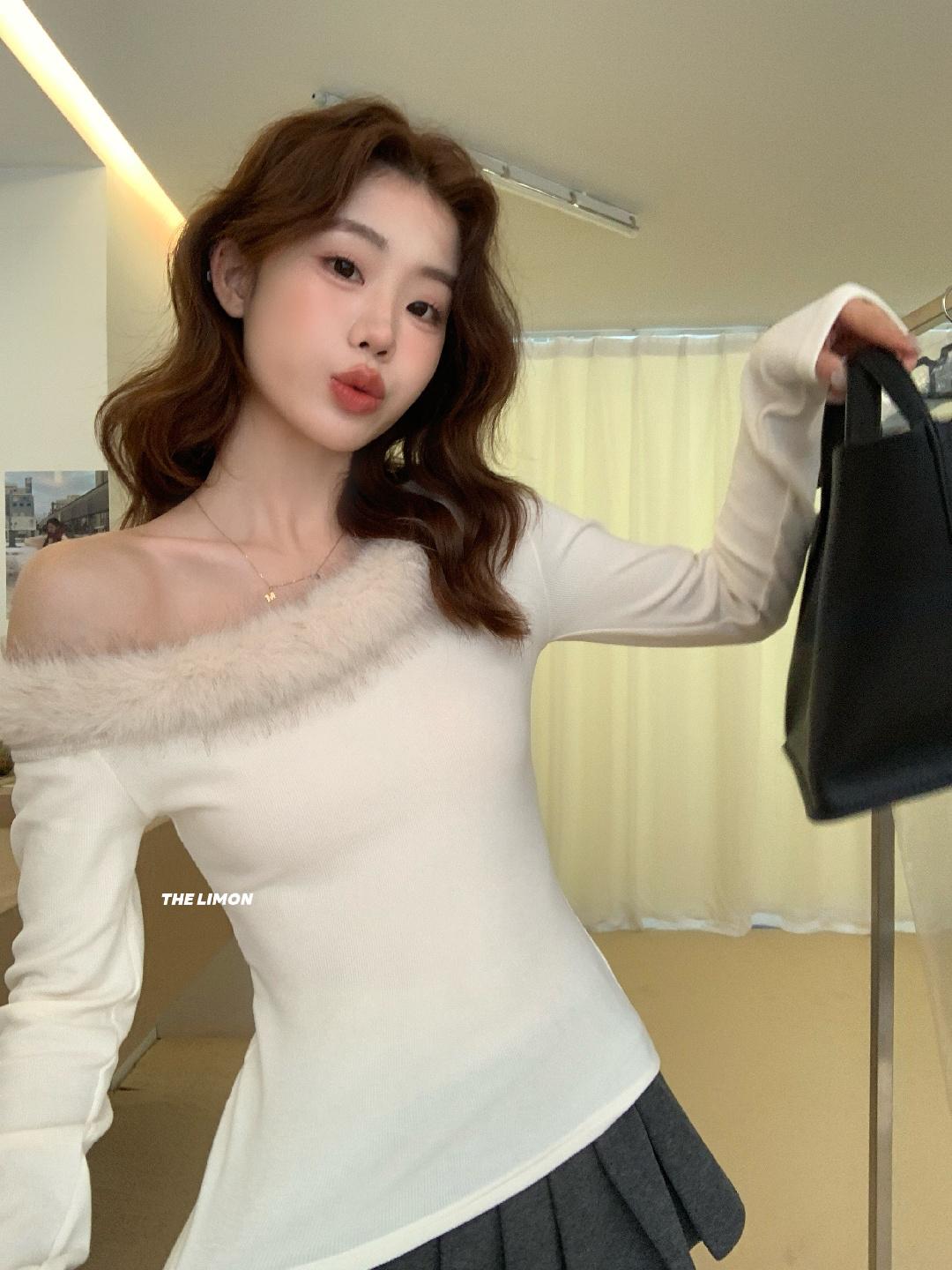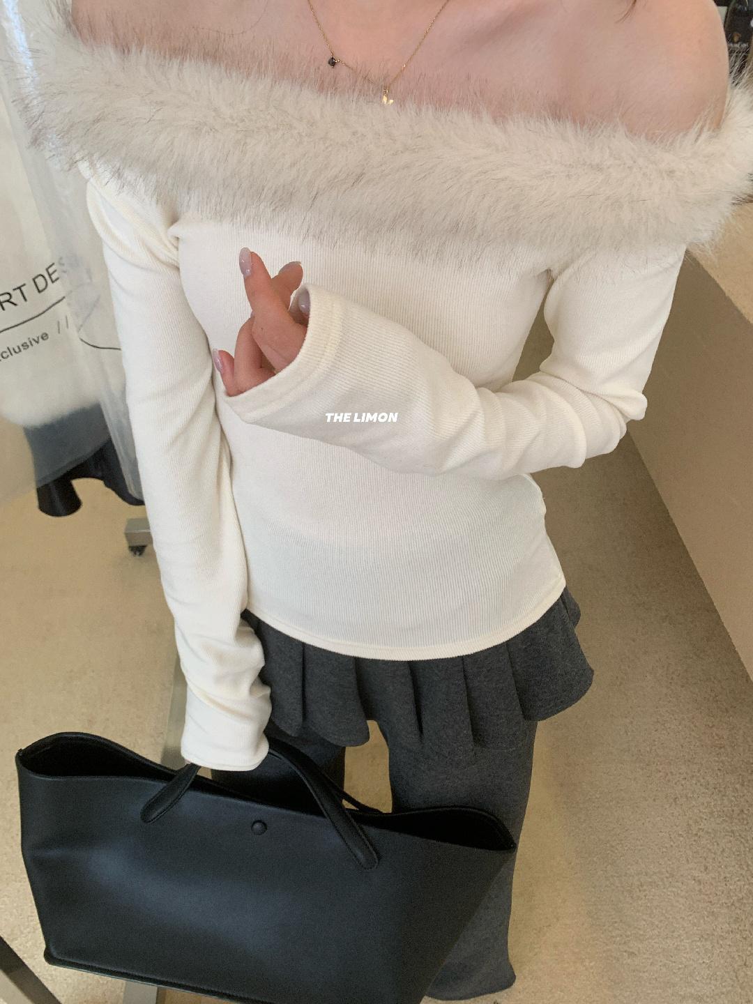 【C8534】高級感毛領斜肩修身針織打底衫(C位白月光~)