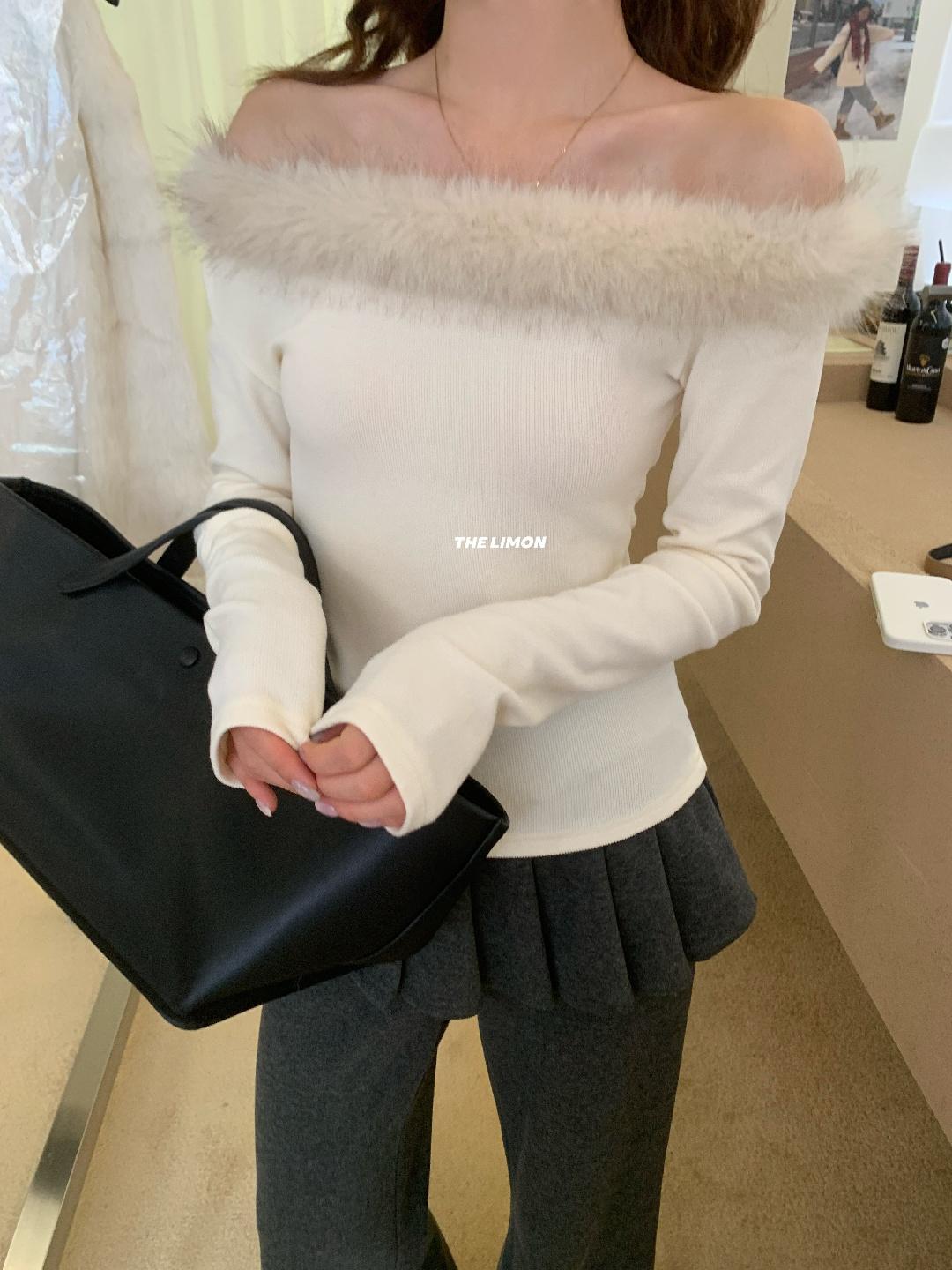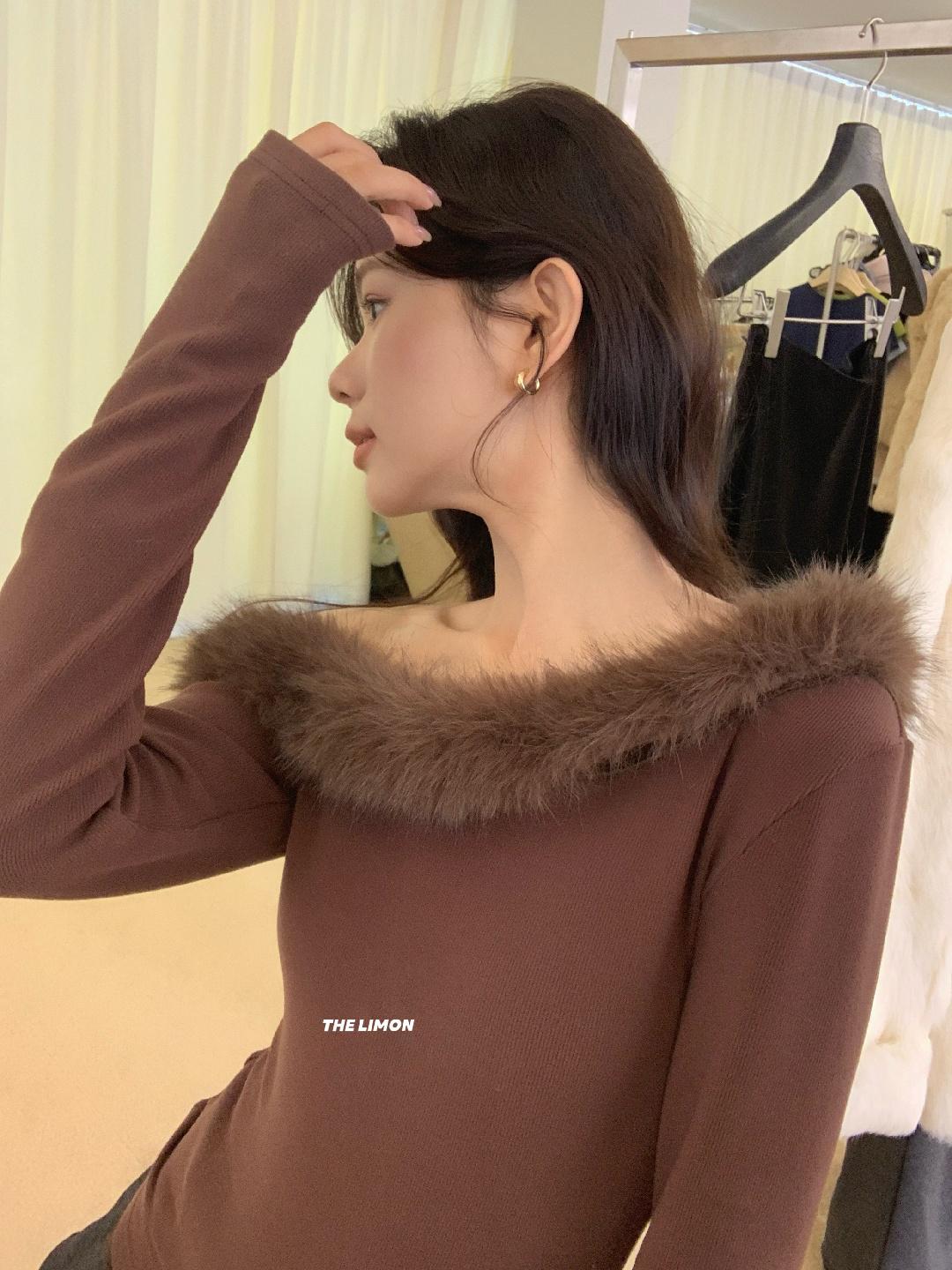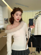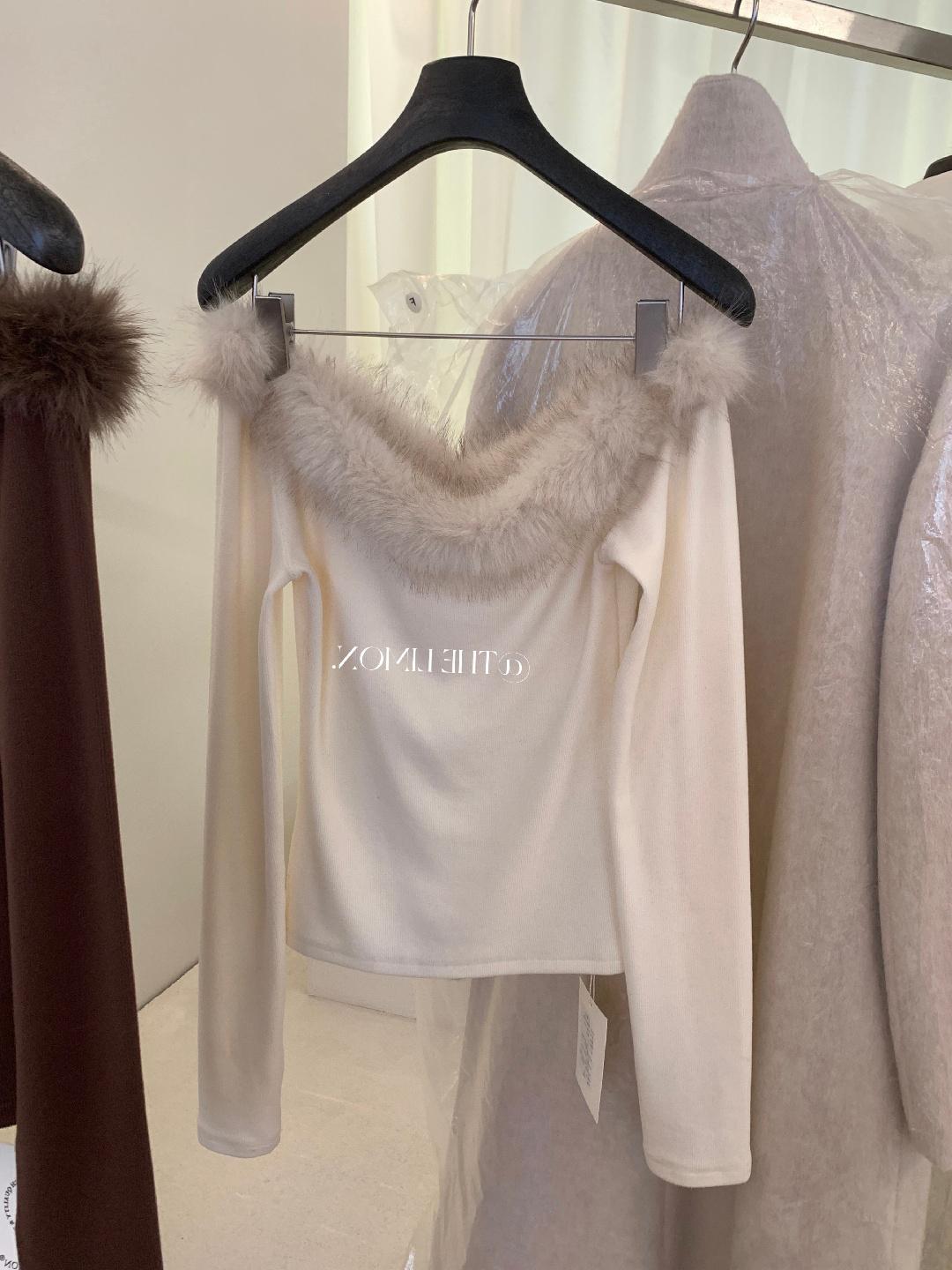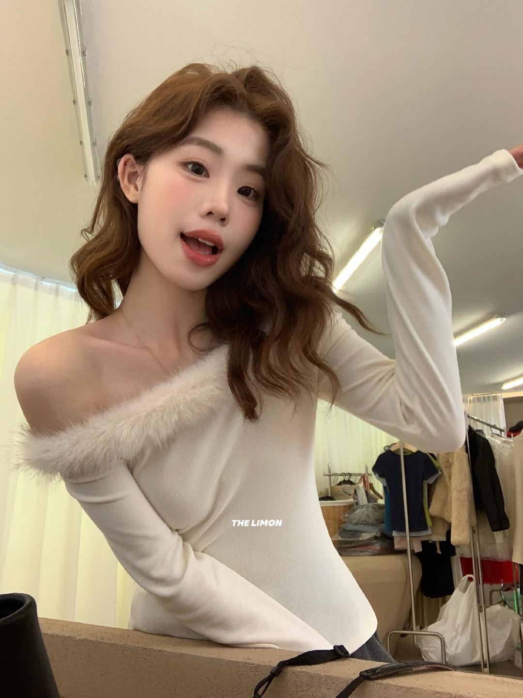 【C8534】高級感毛領斜肩修身針織打底衫(C位白月光~)