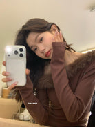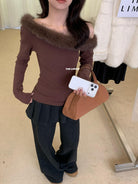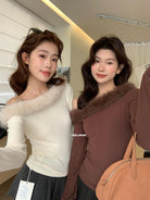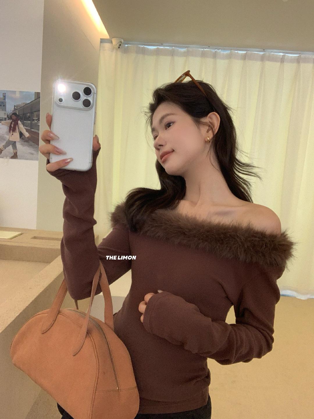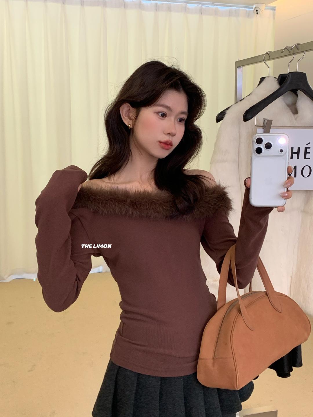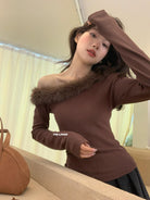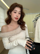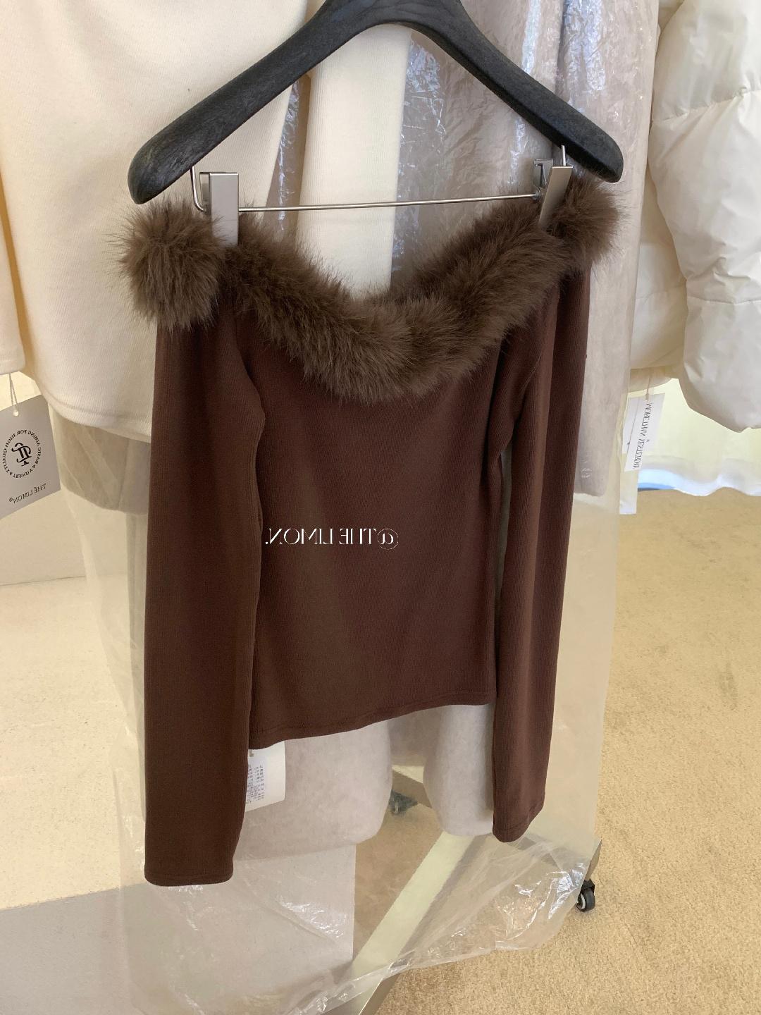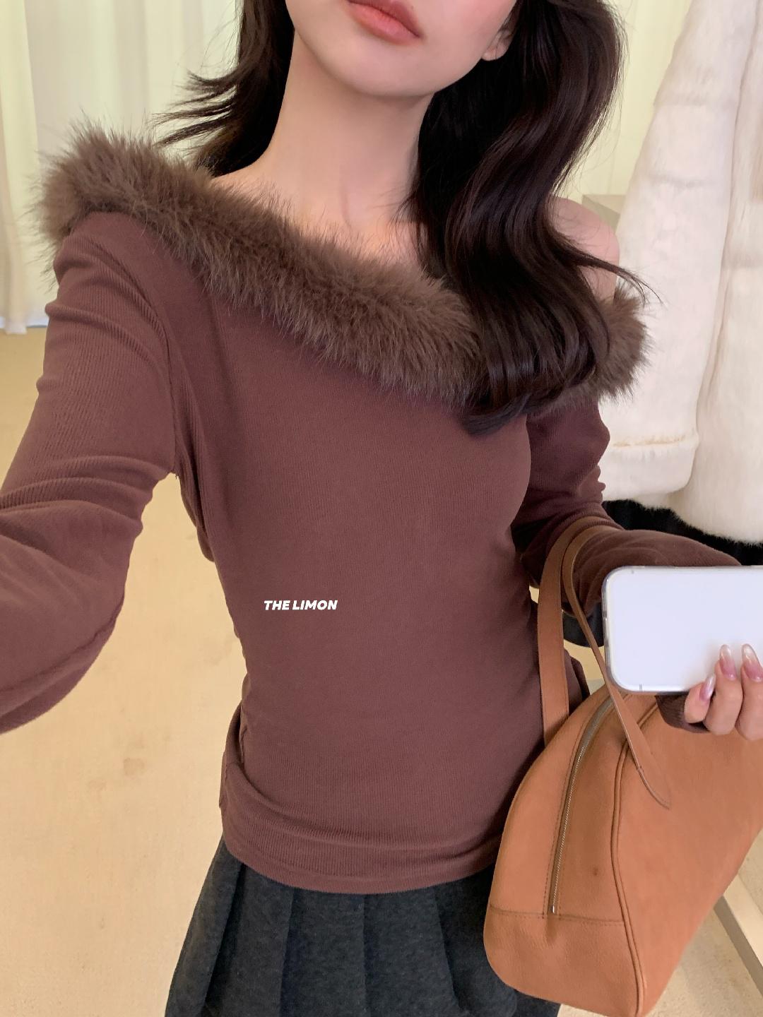 【C8534】高級感毛領斜肩修身針織打底衫(C位白月光~)