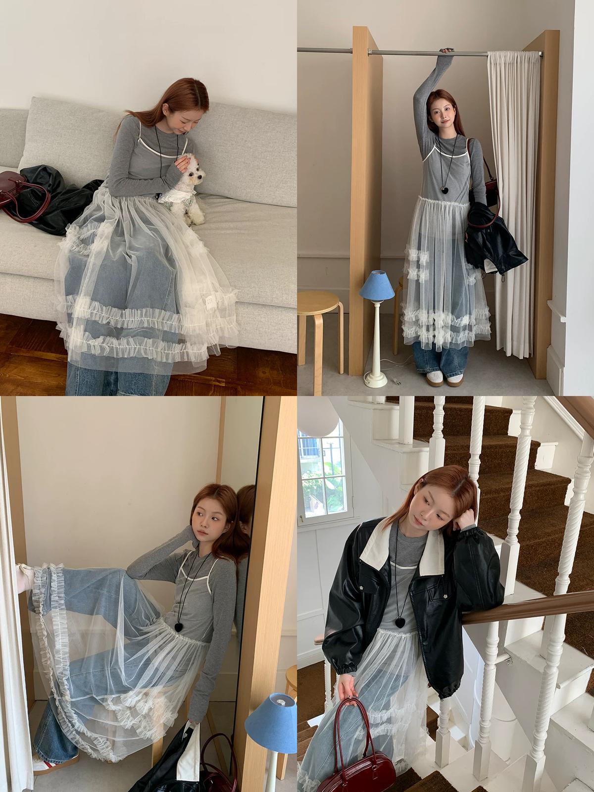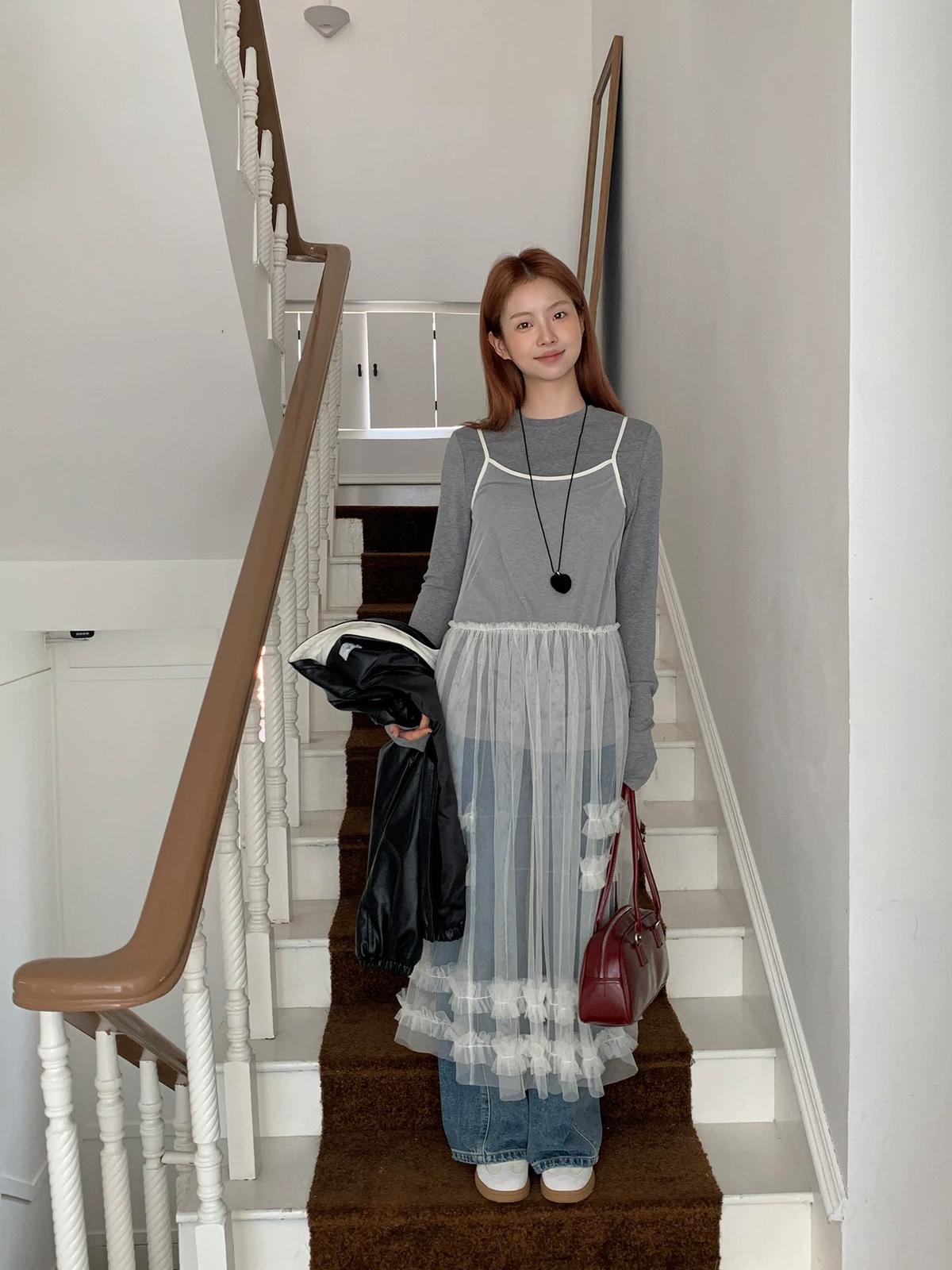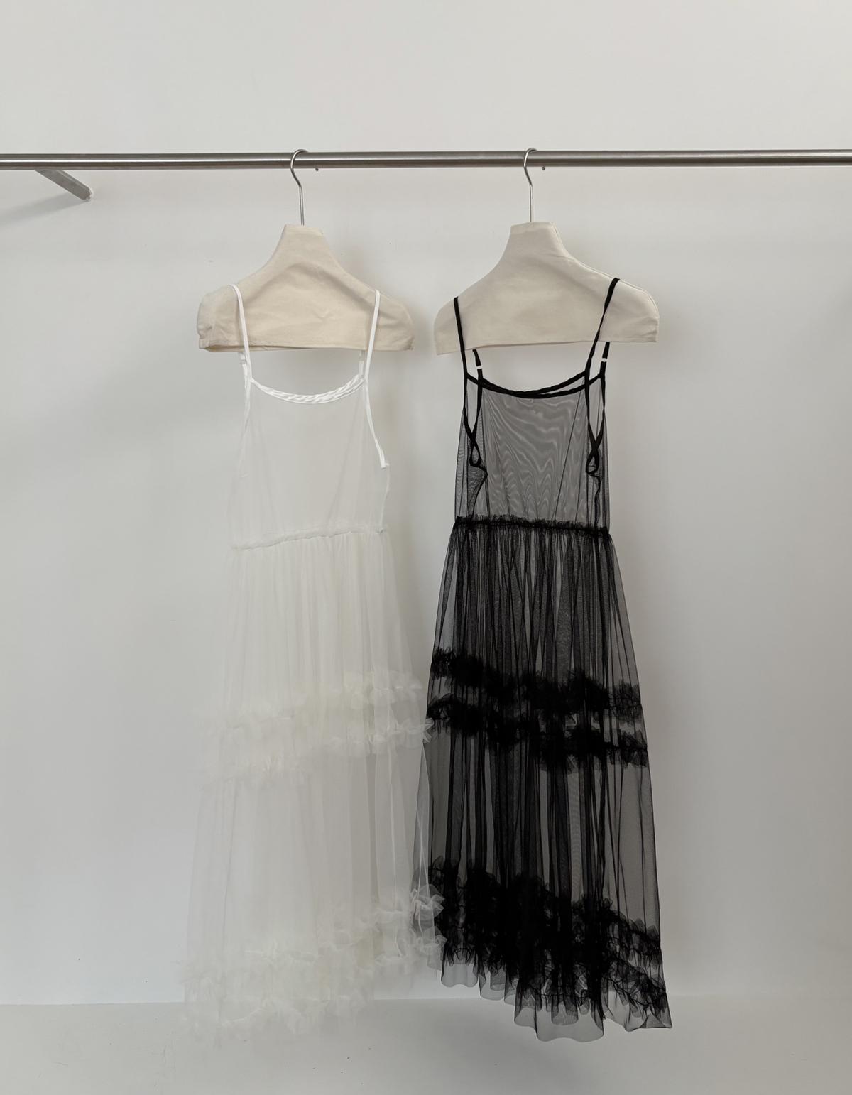 【C8615】“疊疊樂”韓系甜美網紗透視疊穿吊帶罩裙女早春新款層次感蓬蓬連衣裙