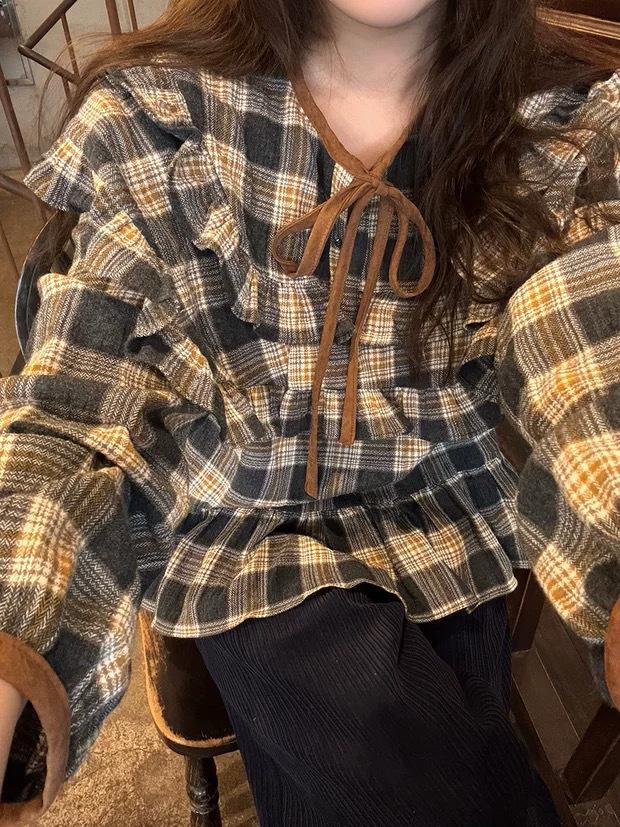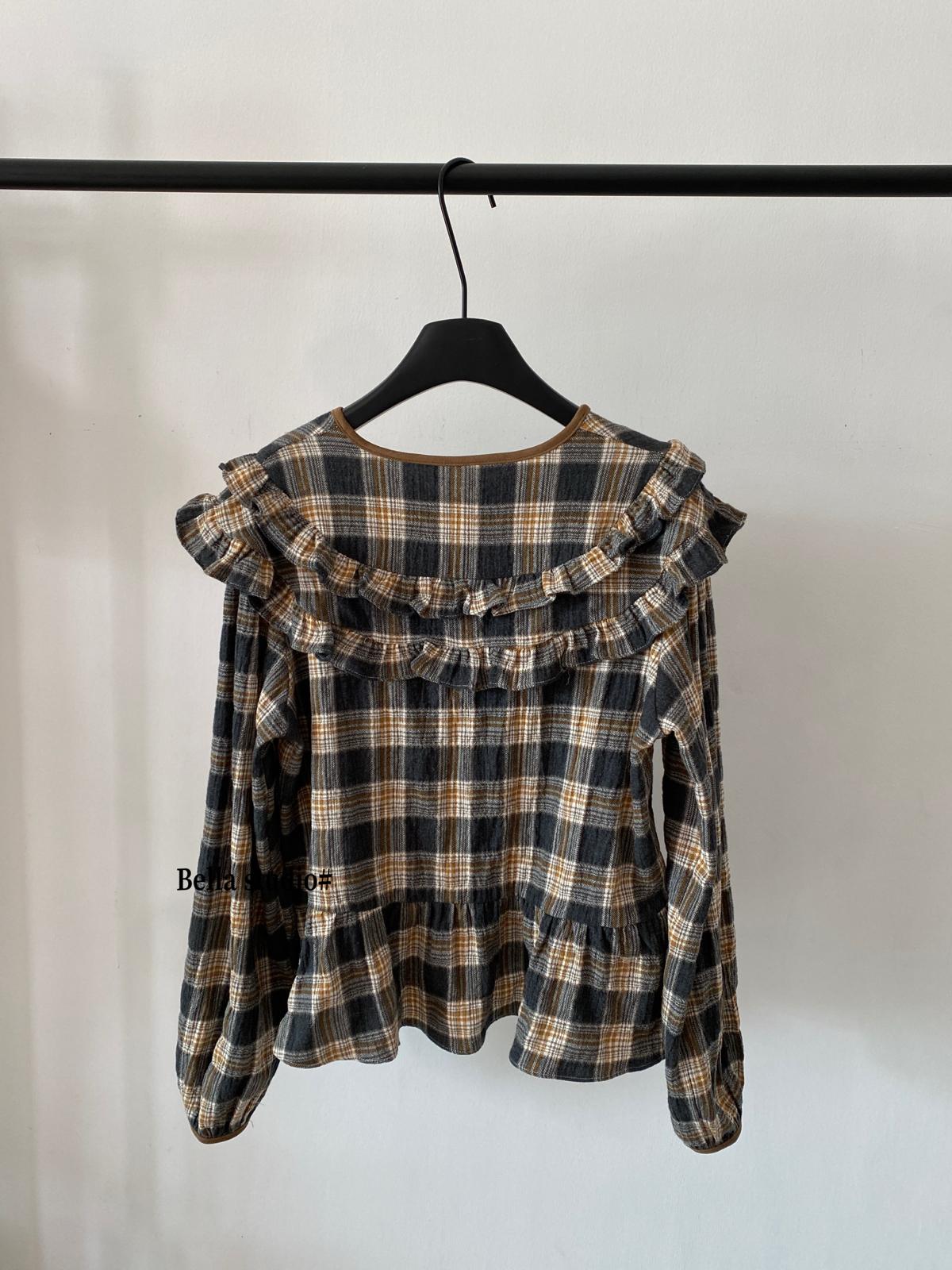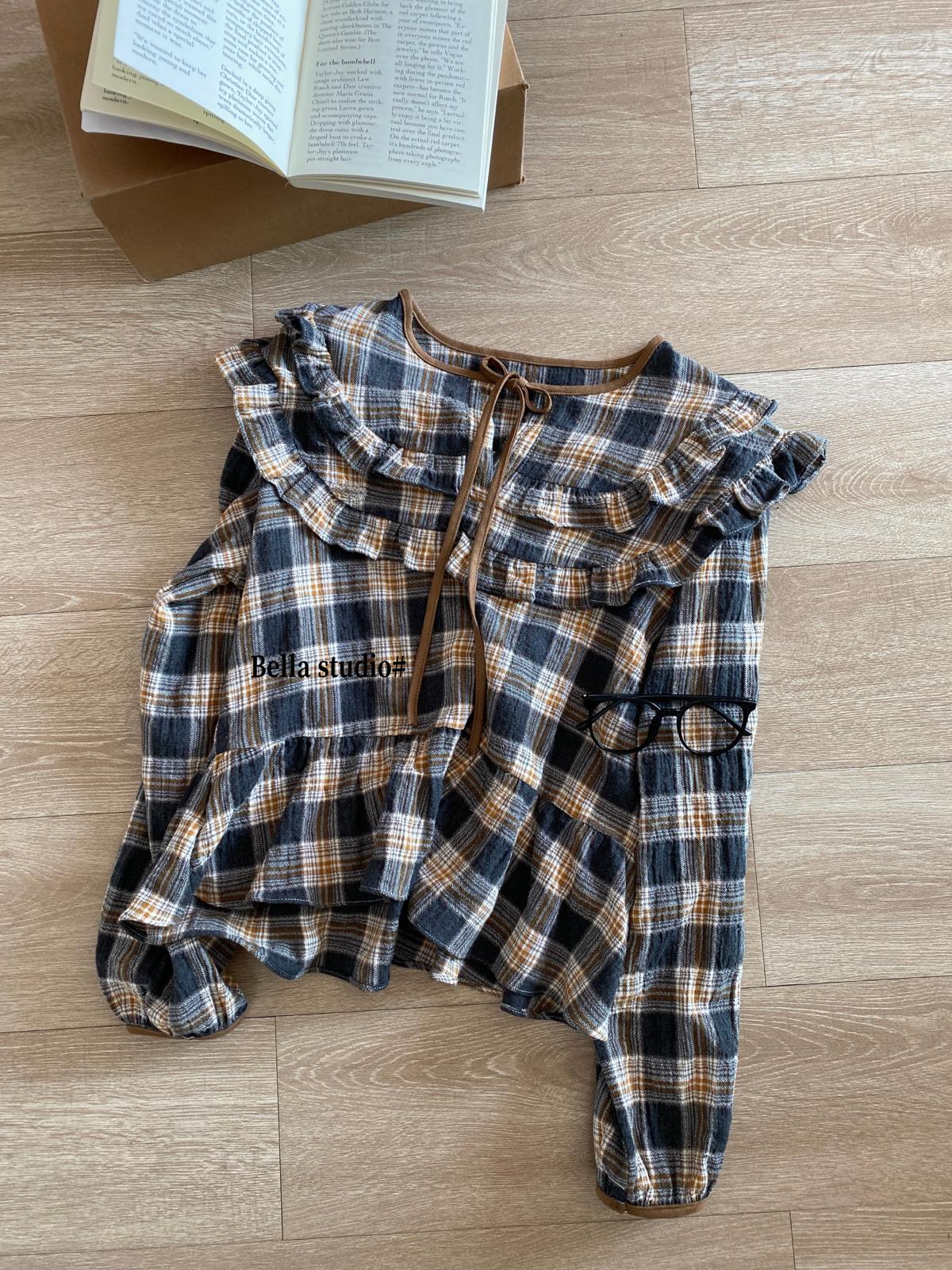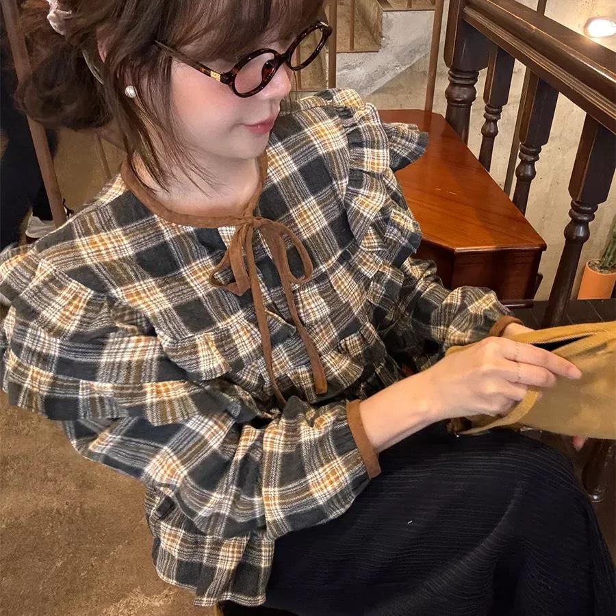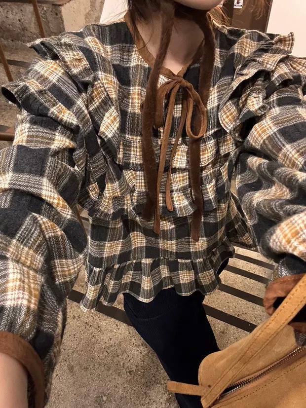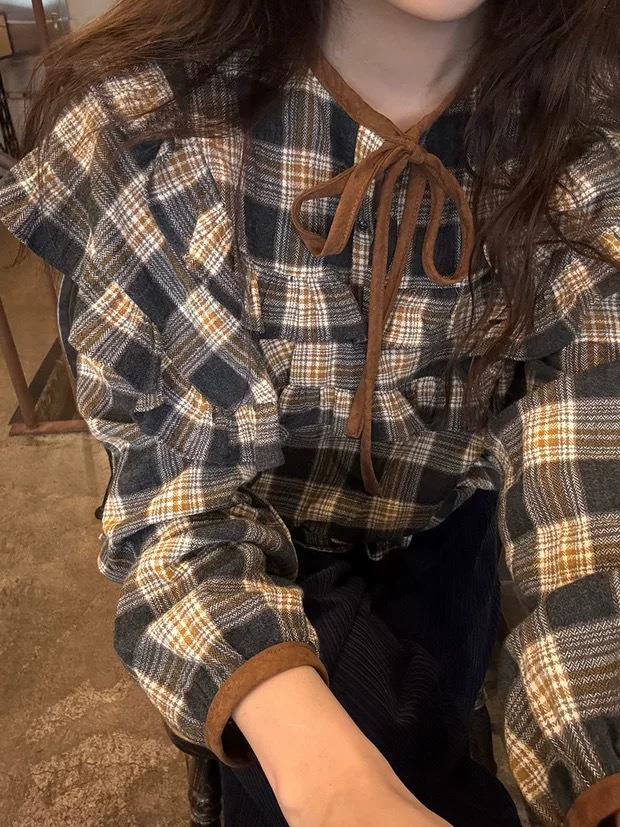 【C8617】韓系休閒寬鬆荷葉邊繫帶格子小衫襯衫