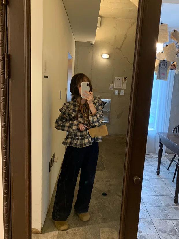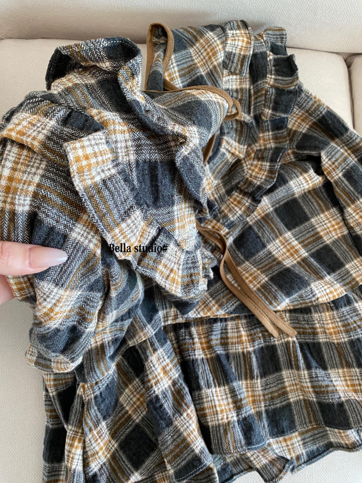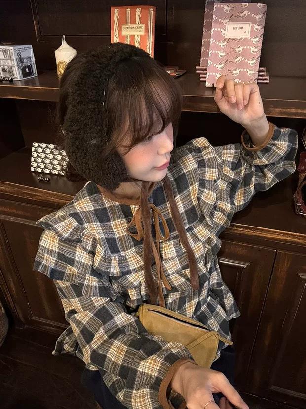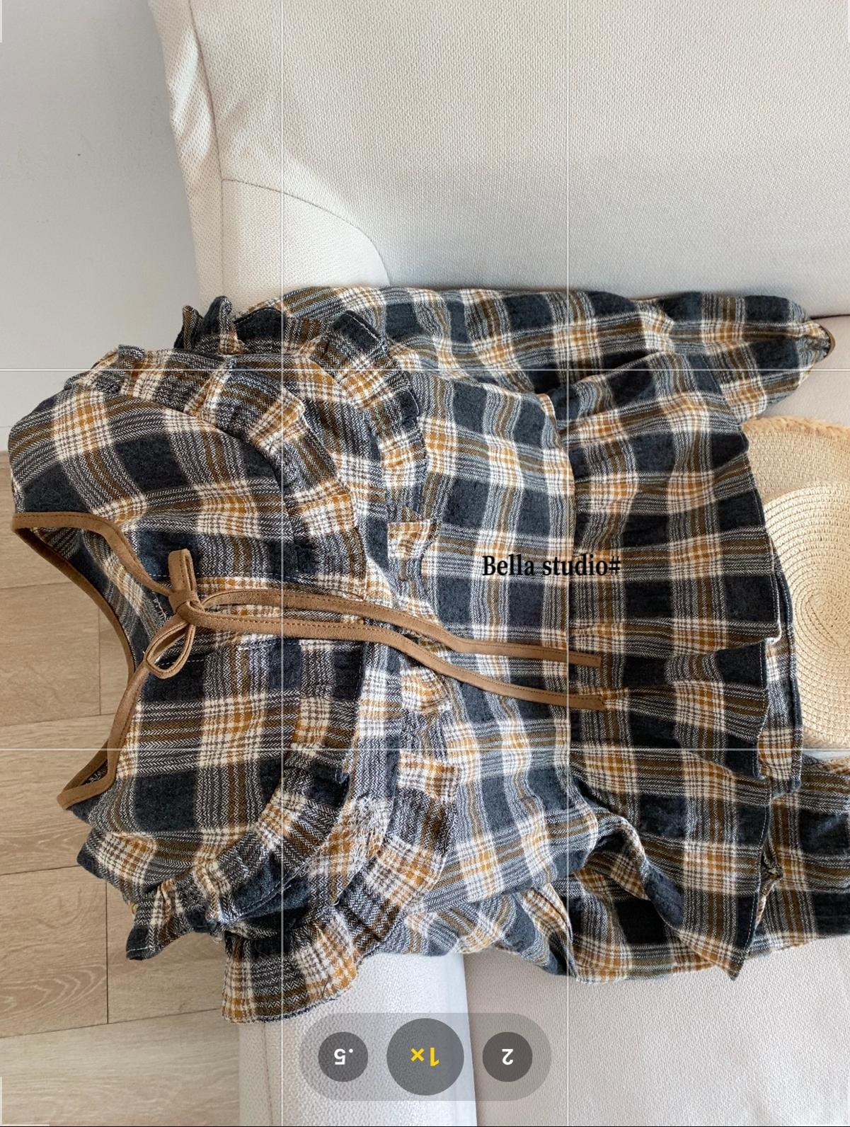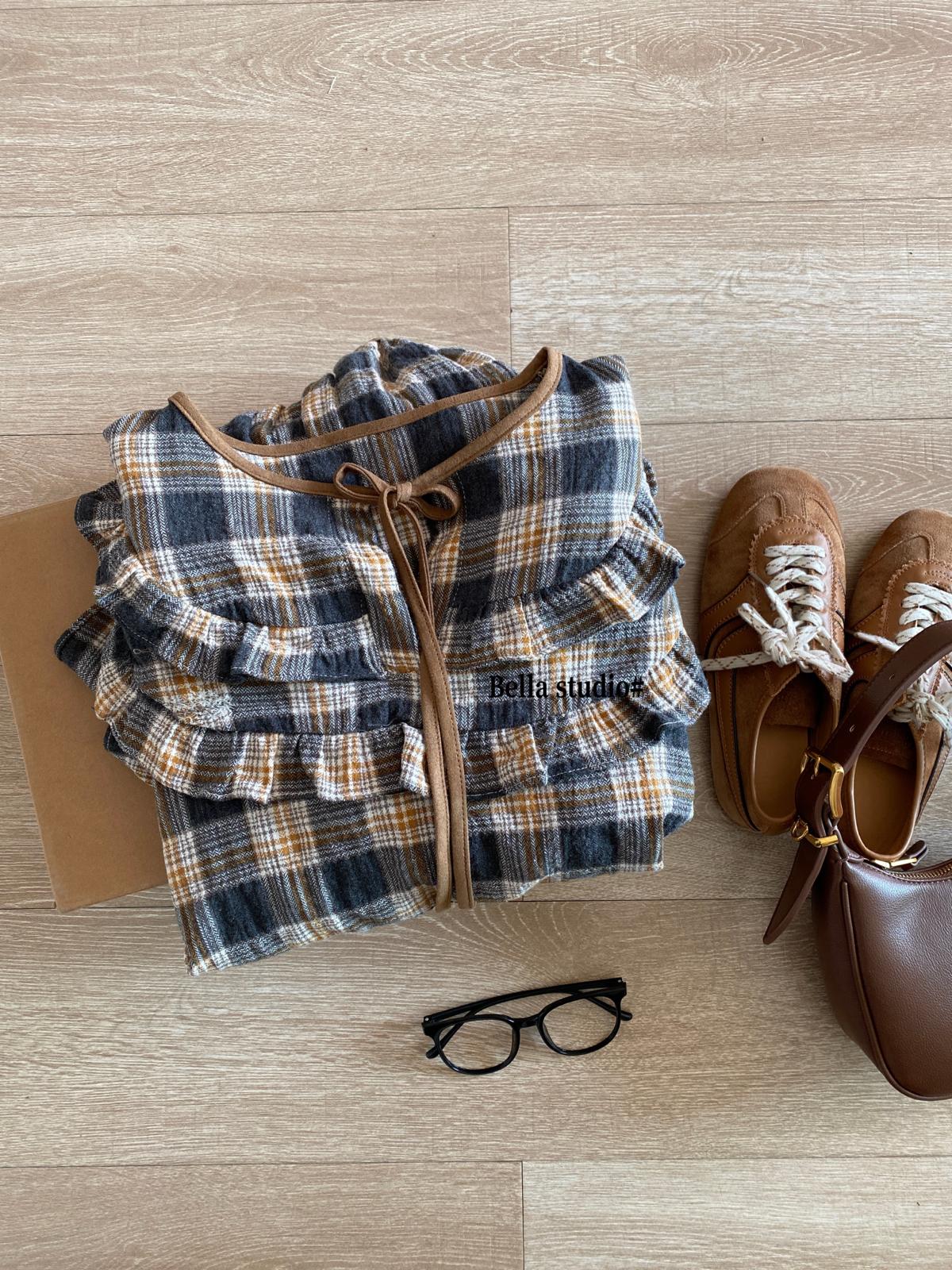 【C8617】韓系休閒寬鬆荷葉邊繫帶格子小衫襯衫