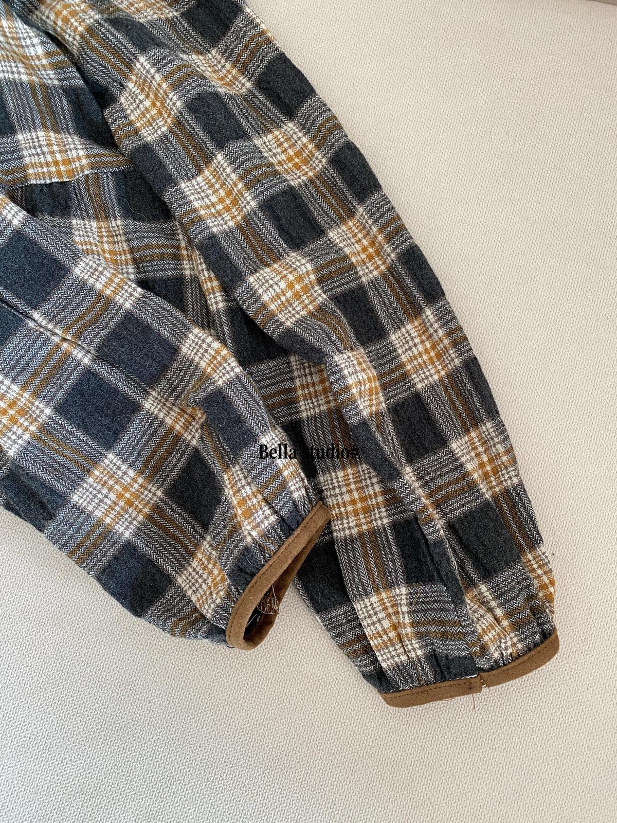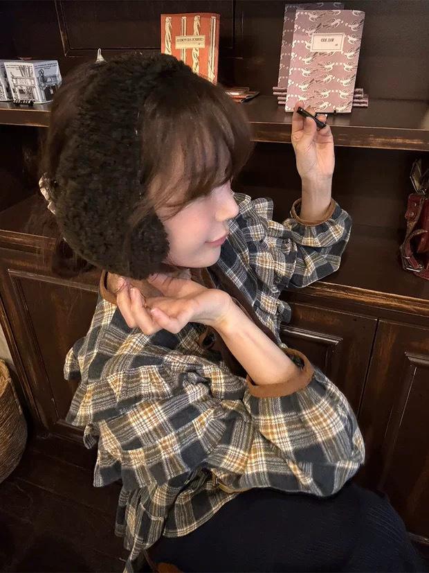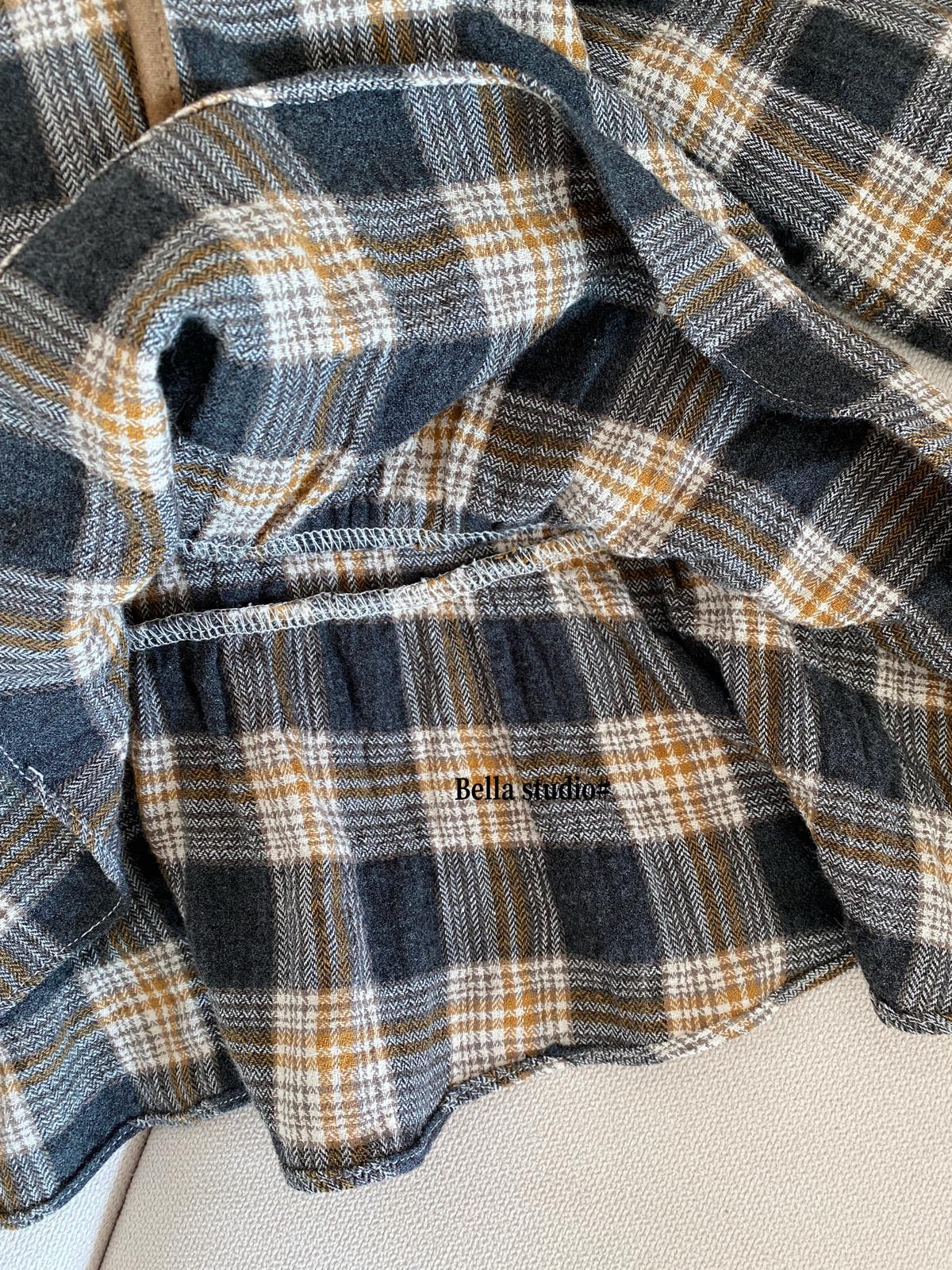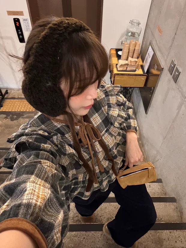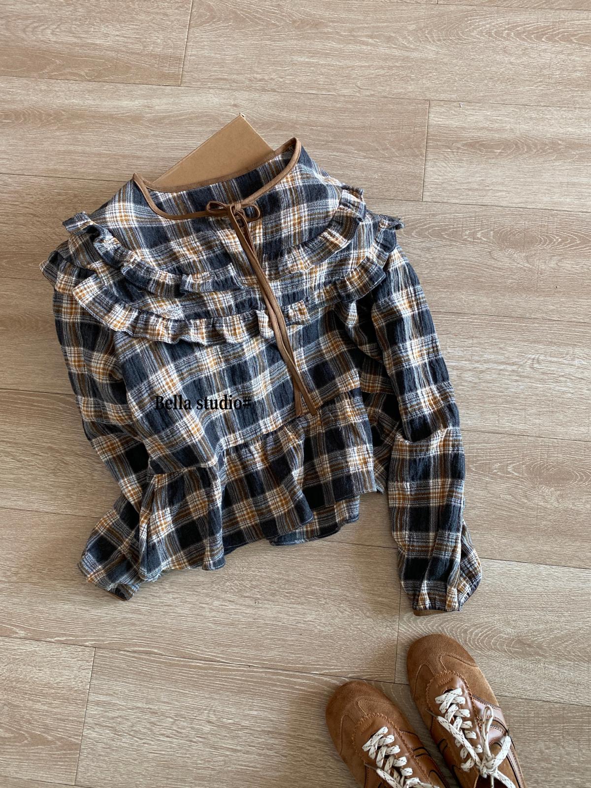 【C8617】韓系休閒寬鬆荷葉邊繫帶格子小衫襯衫