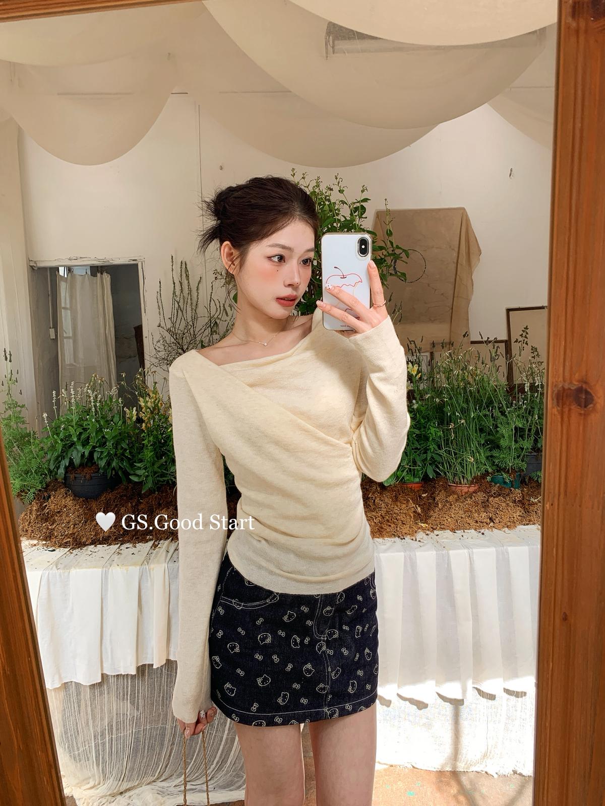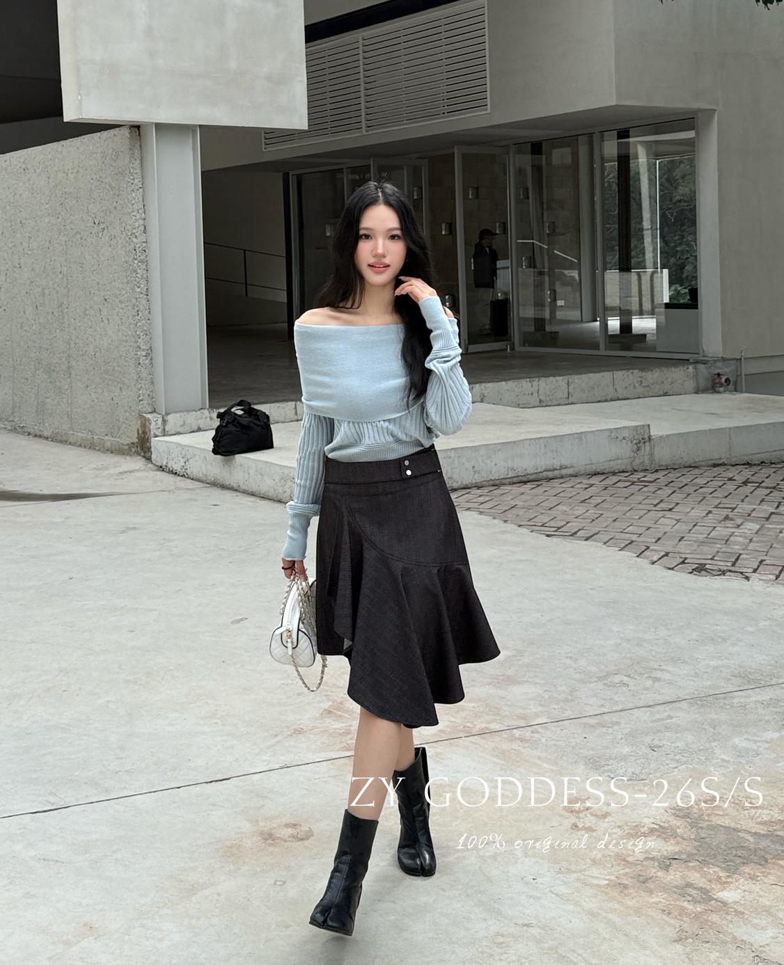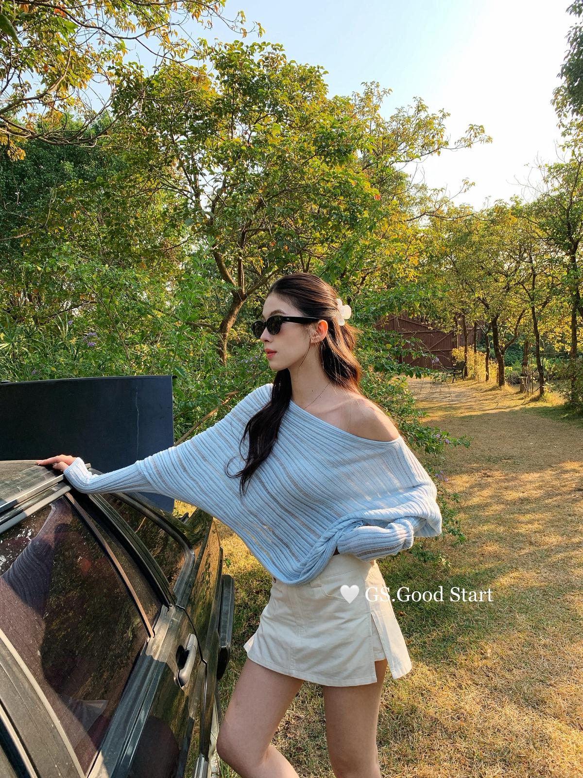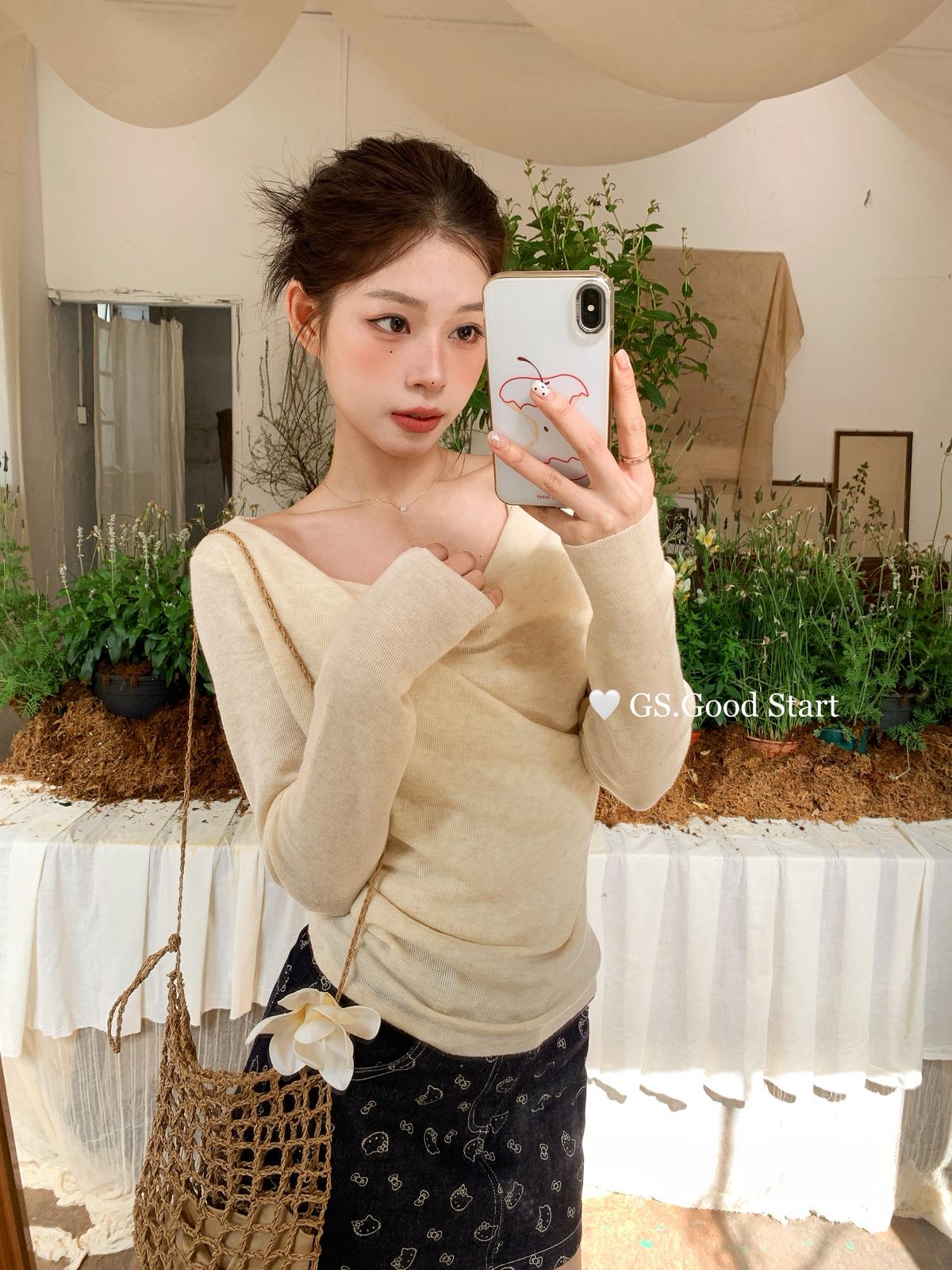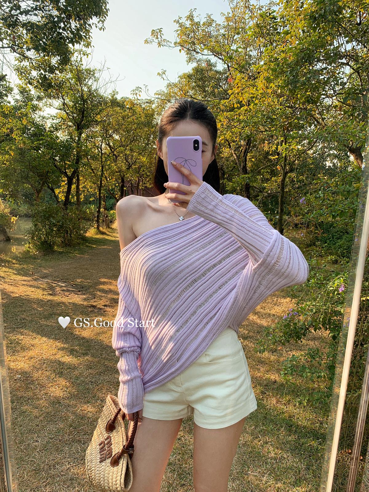 【C8648】爆款來了!釣系姐姐*sha瘋了!春季氣質時髦斜肩不規則針織小衫