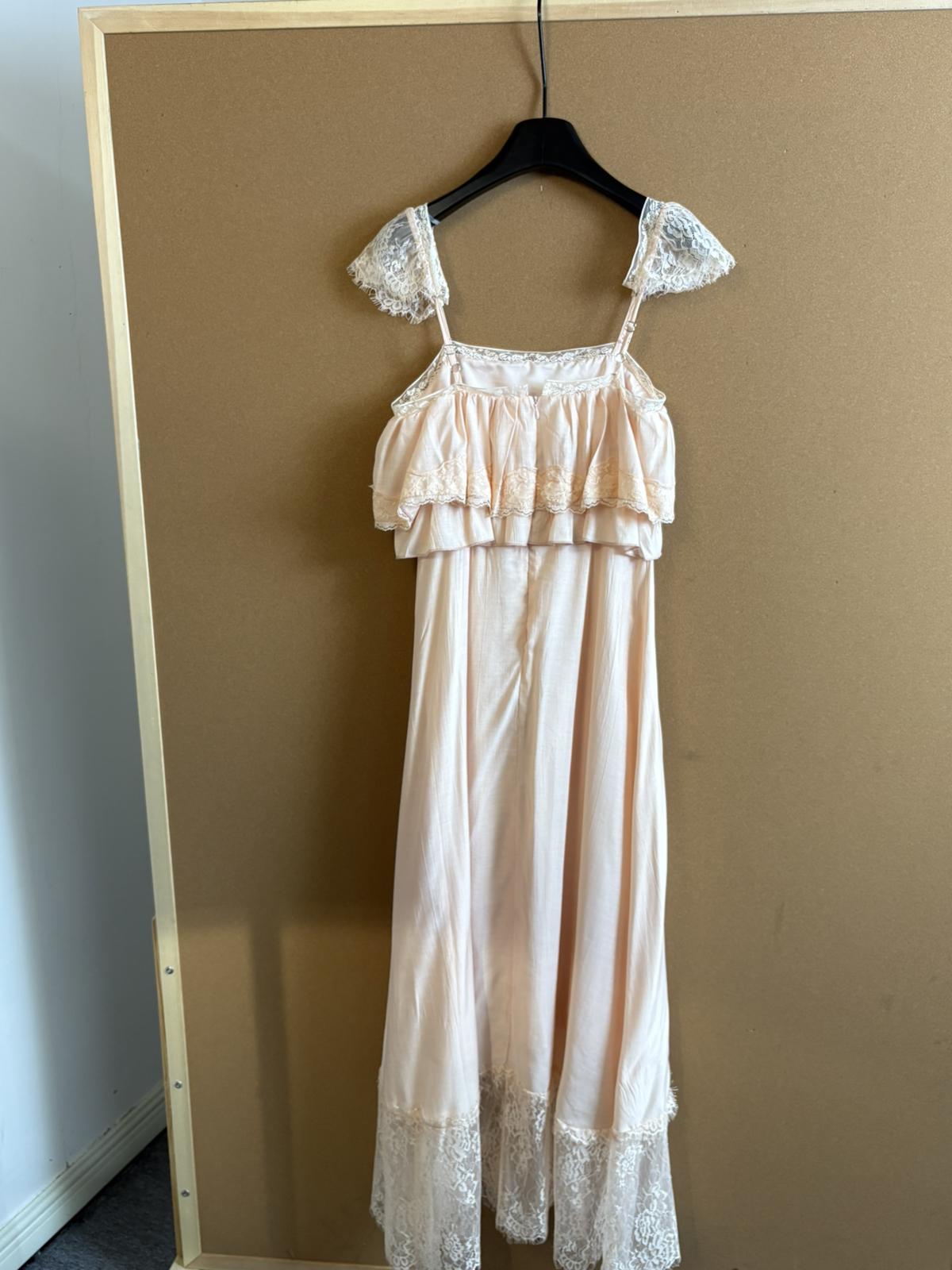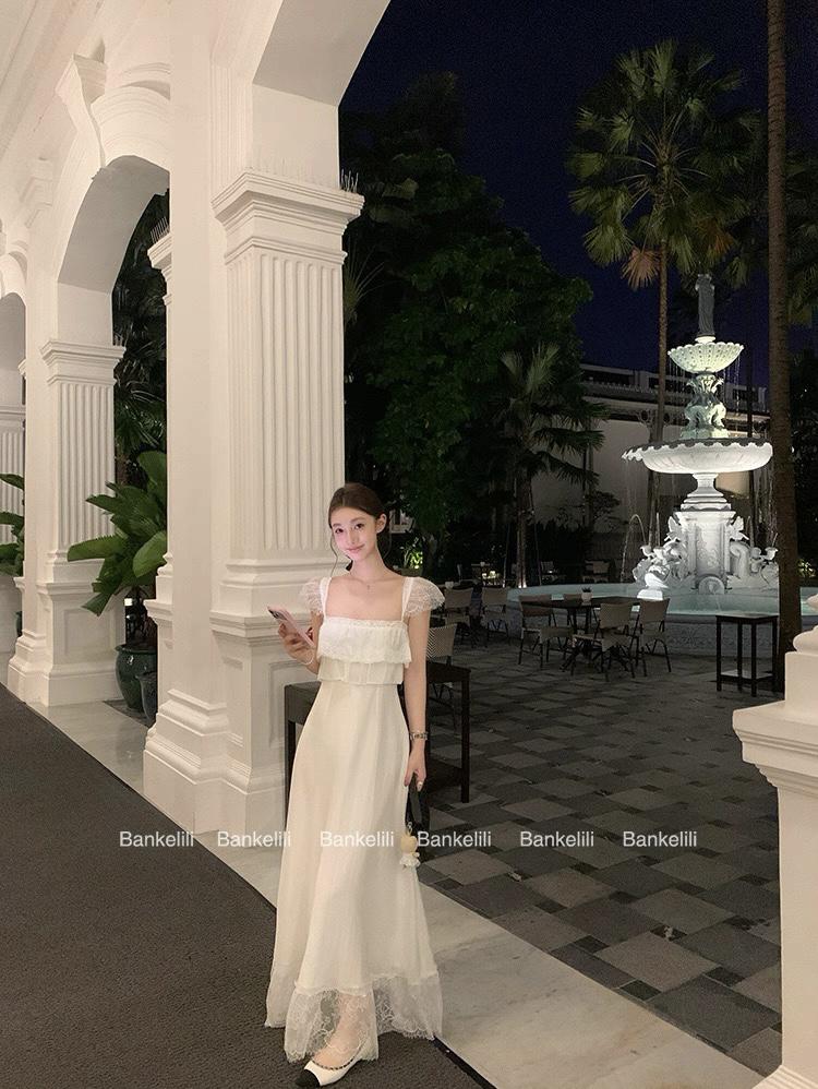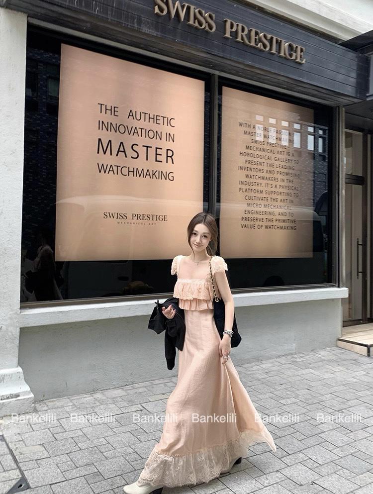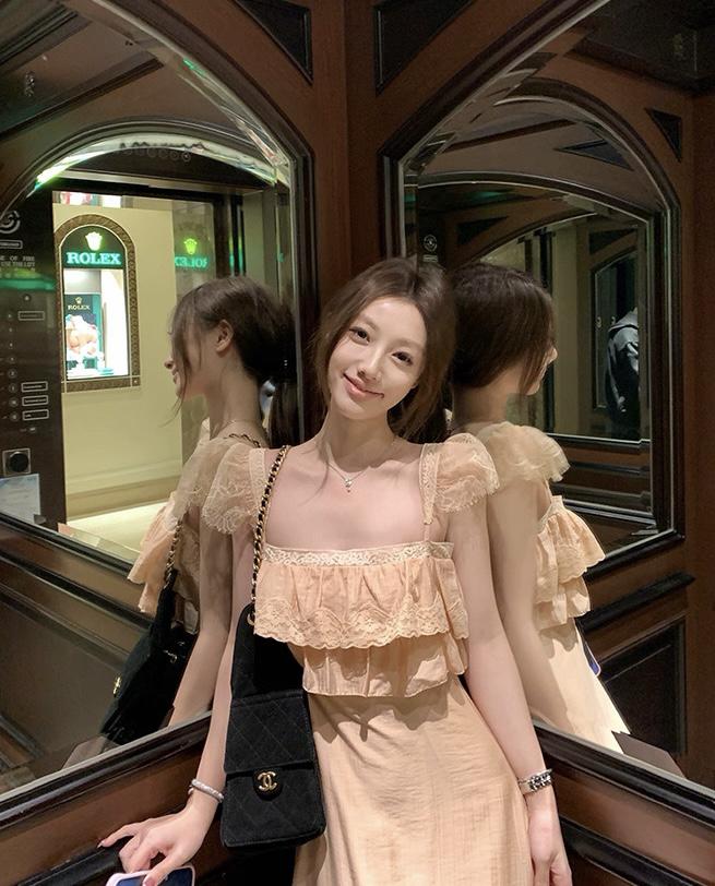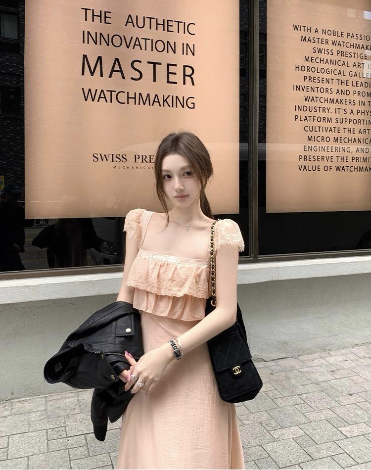 【C8626】早春氛圍感拼接蕾絲荷葉邊收腰A字百搭吊帶連衣裙
