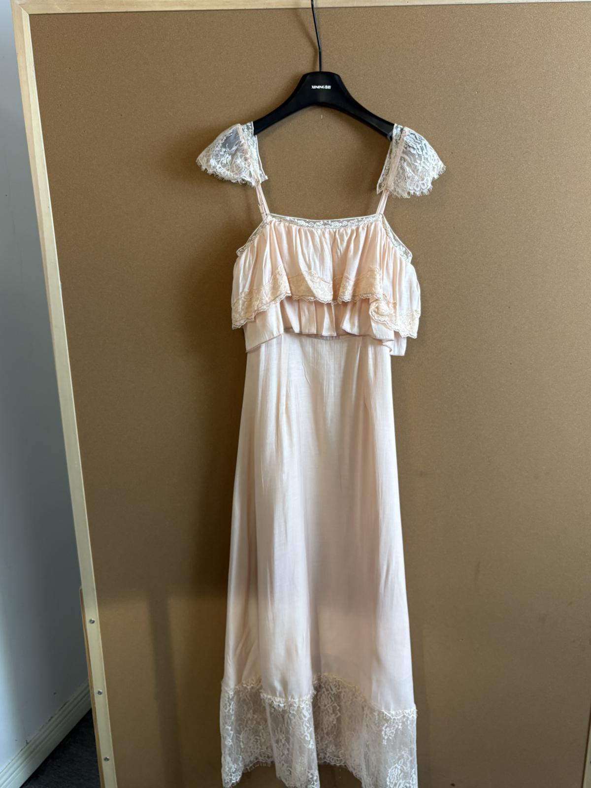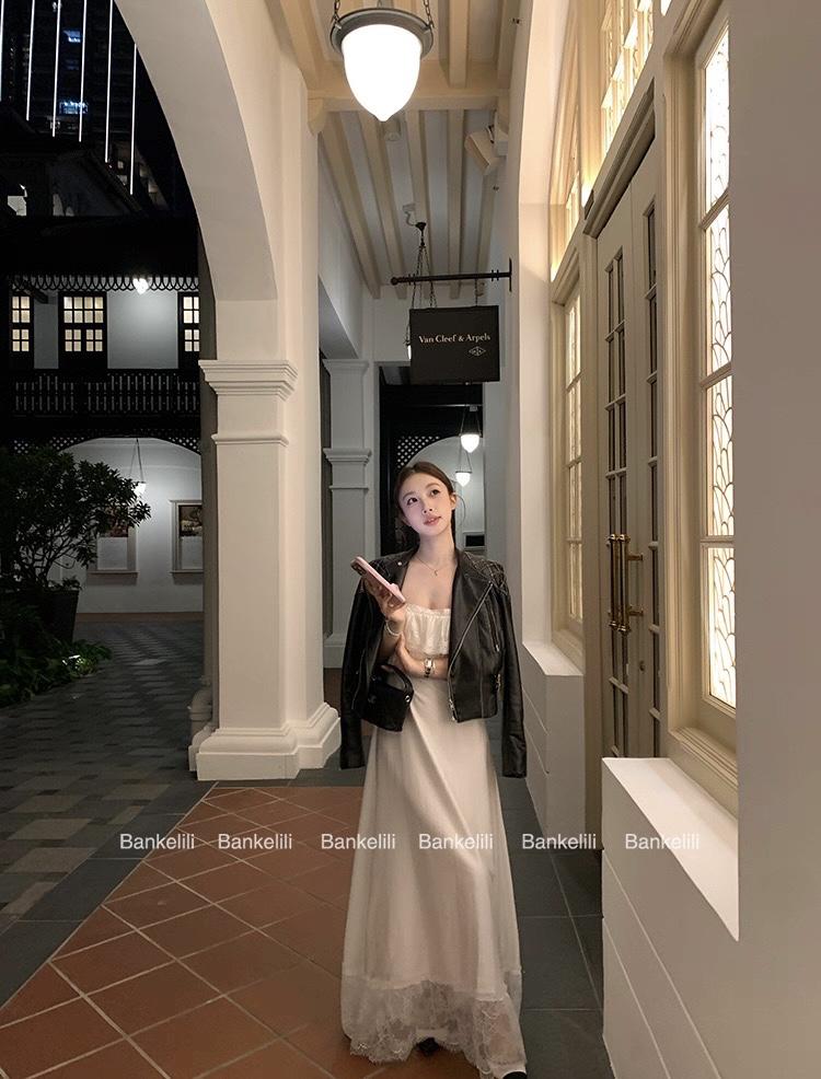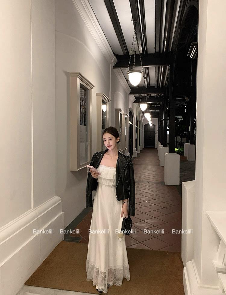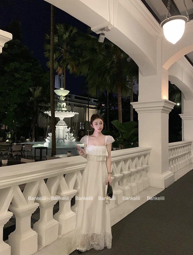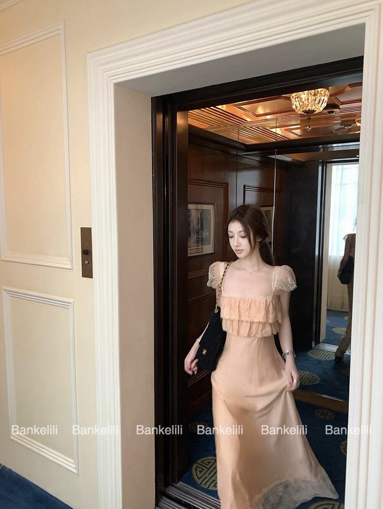 【C8626】早春氛圍感拼接蕾絲荷葉邊收腰A字百搭吊帶連衣裙