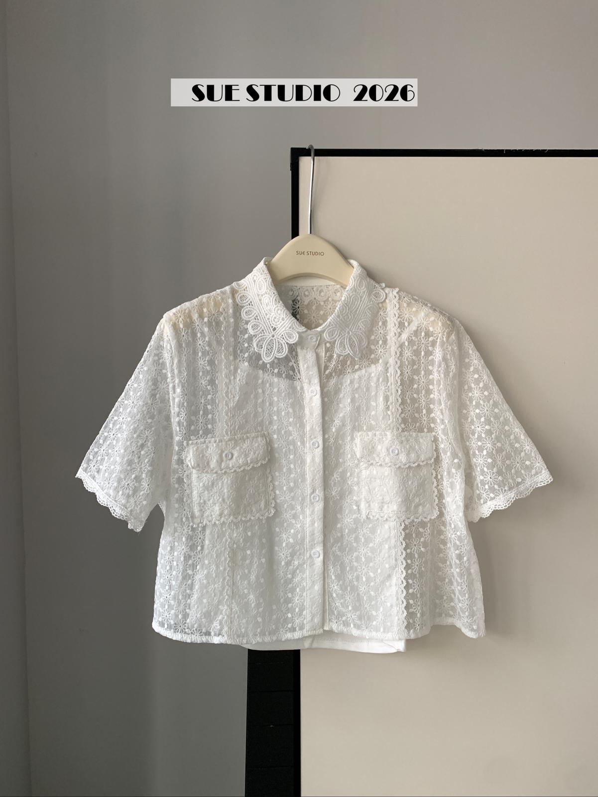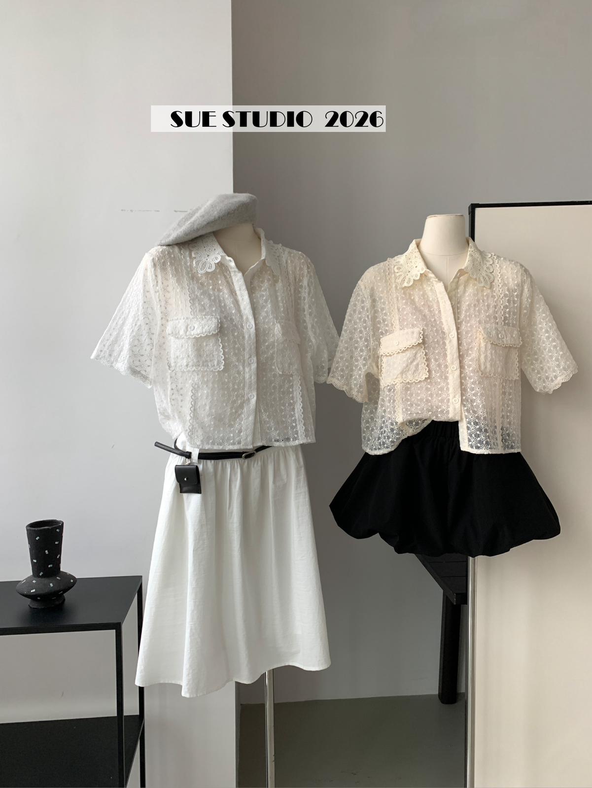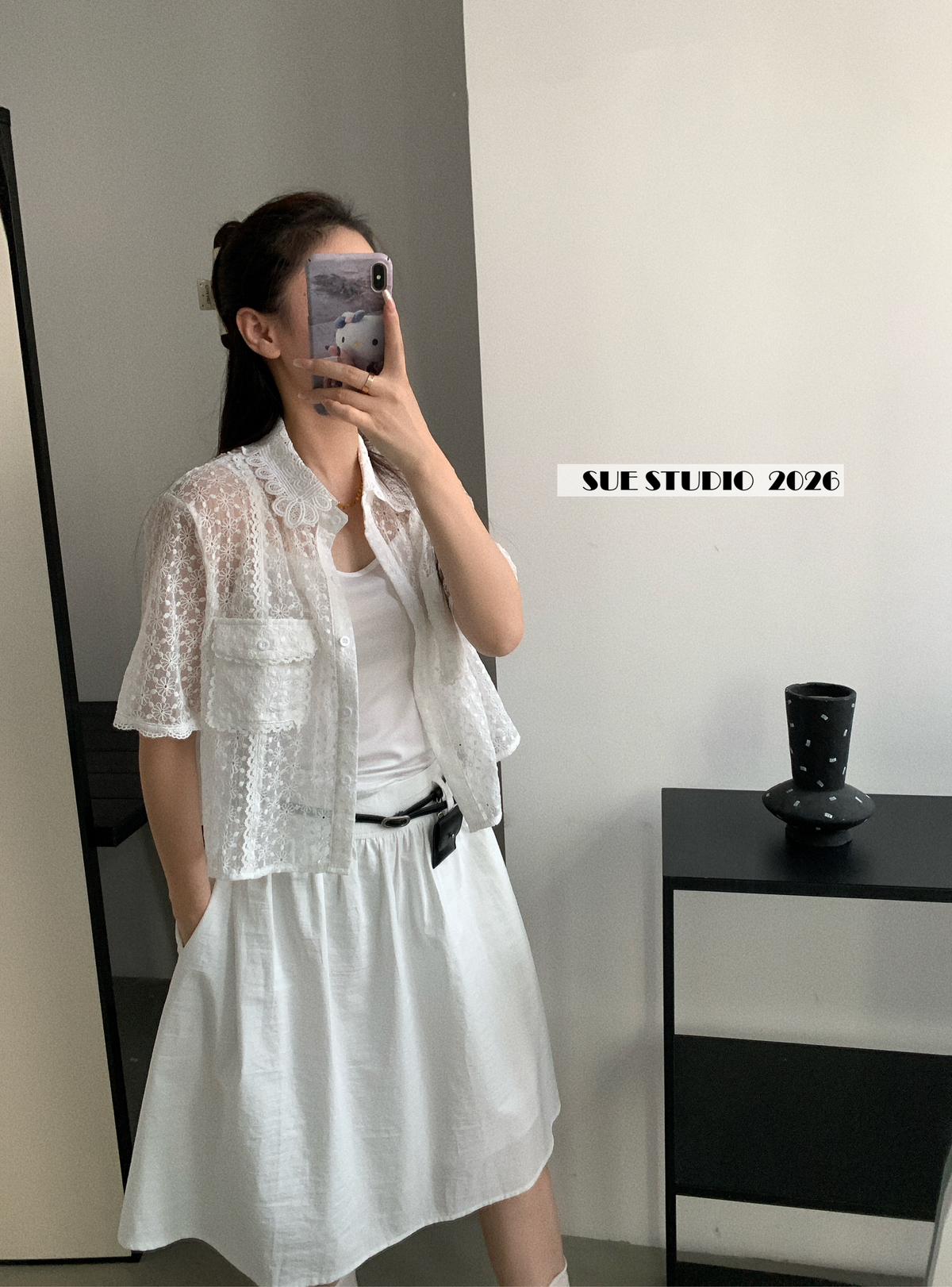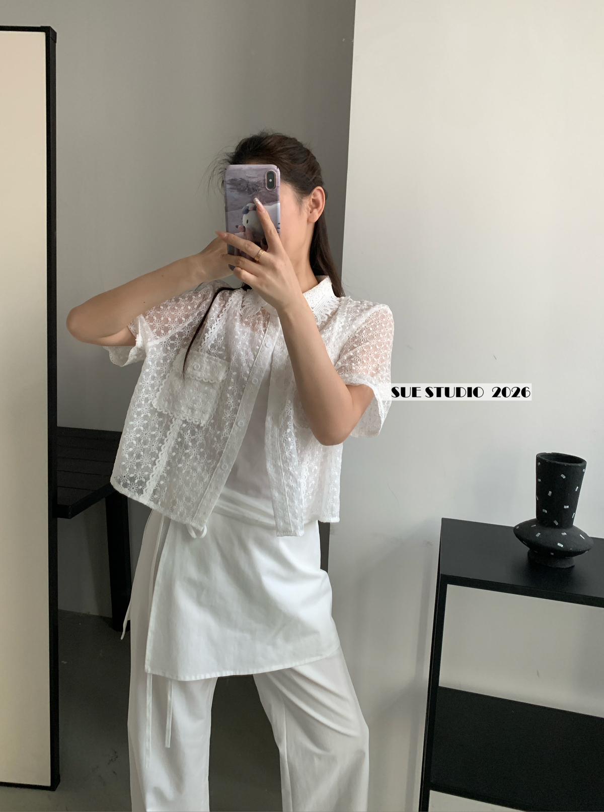 【C8636】韓系休閒簡約蕾絲開扣短袖襯衫式小衫+背心套裝