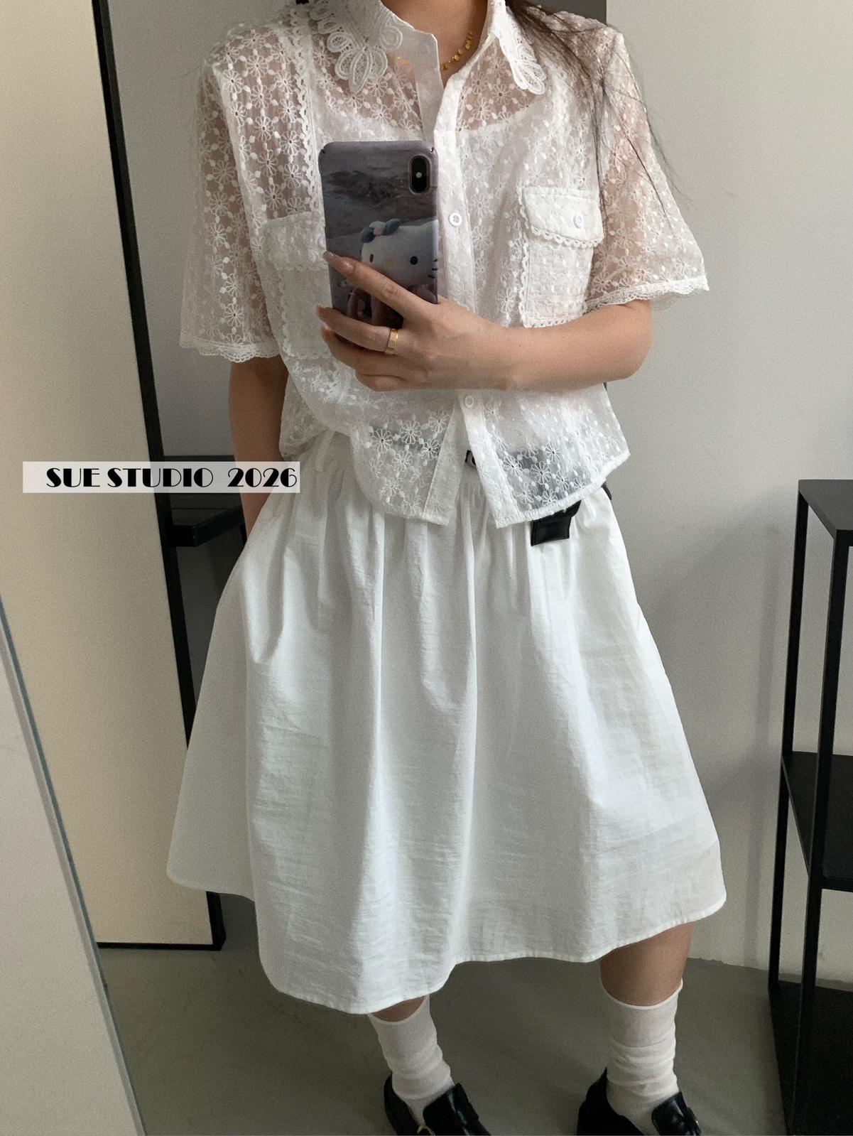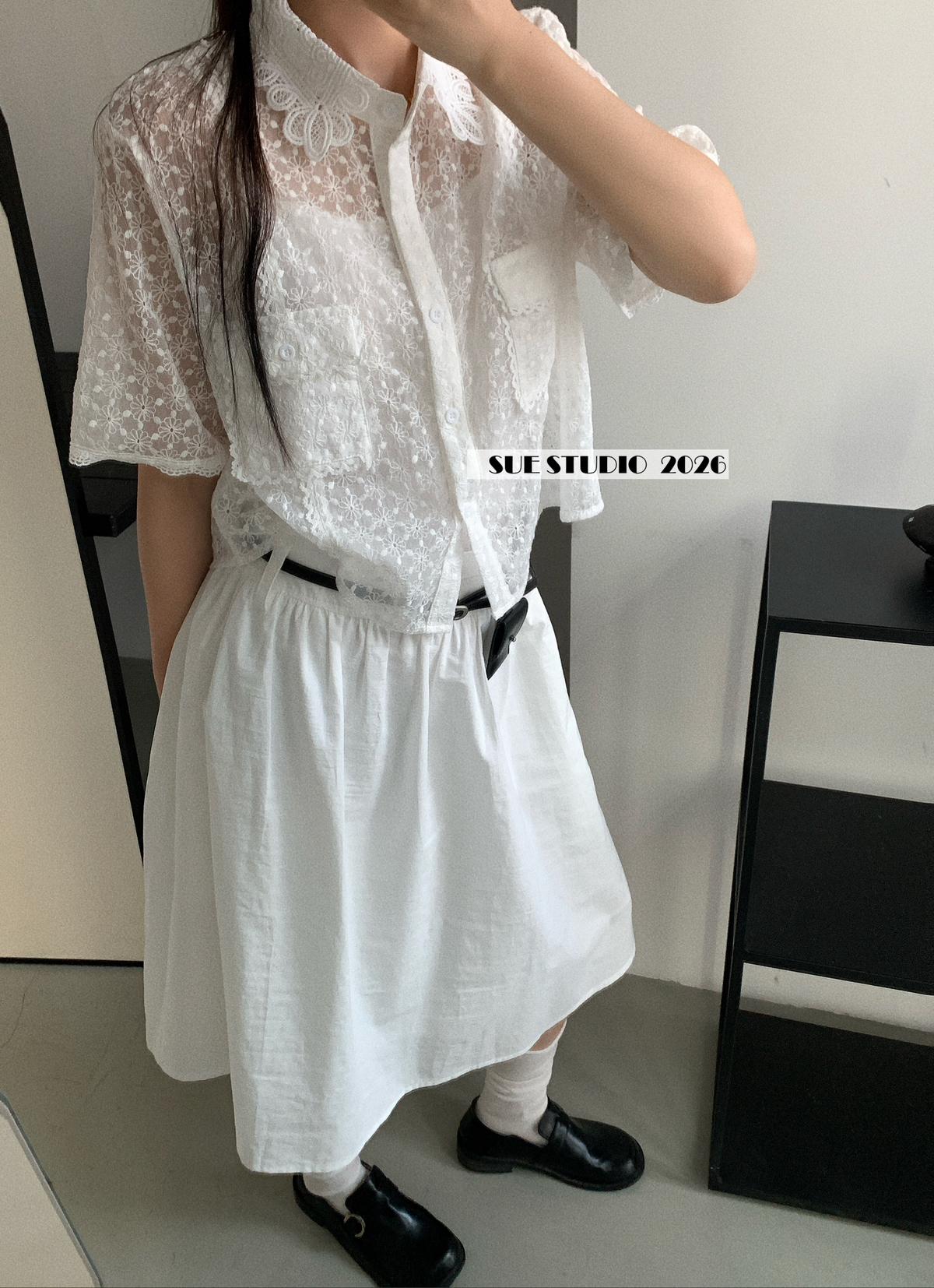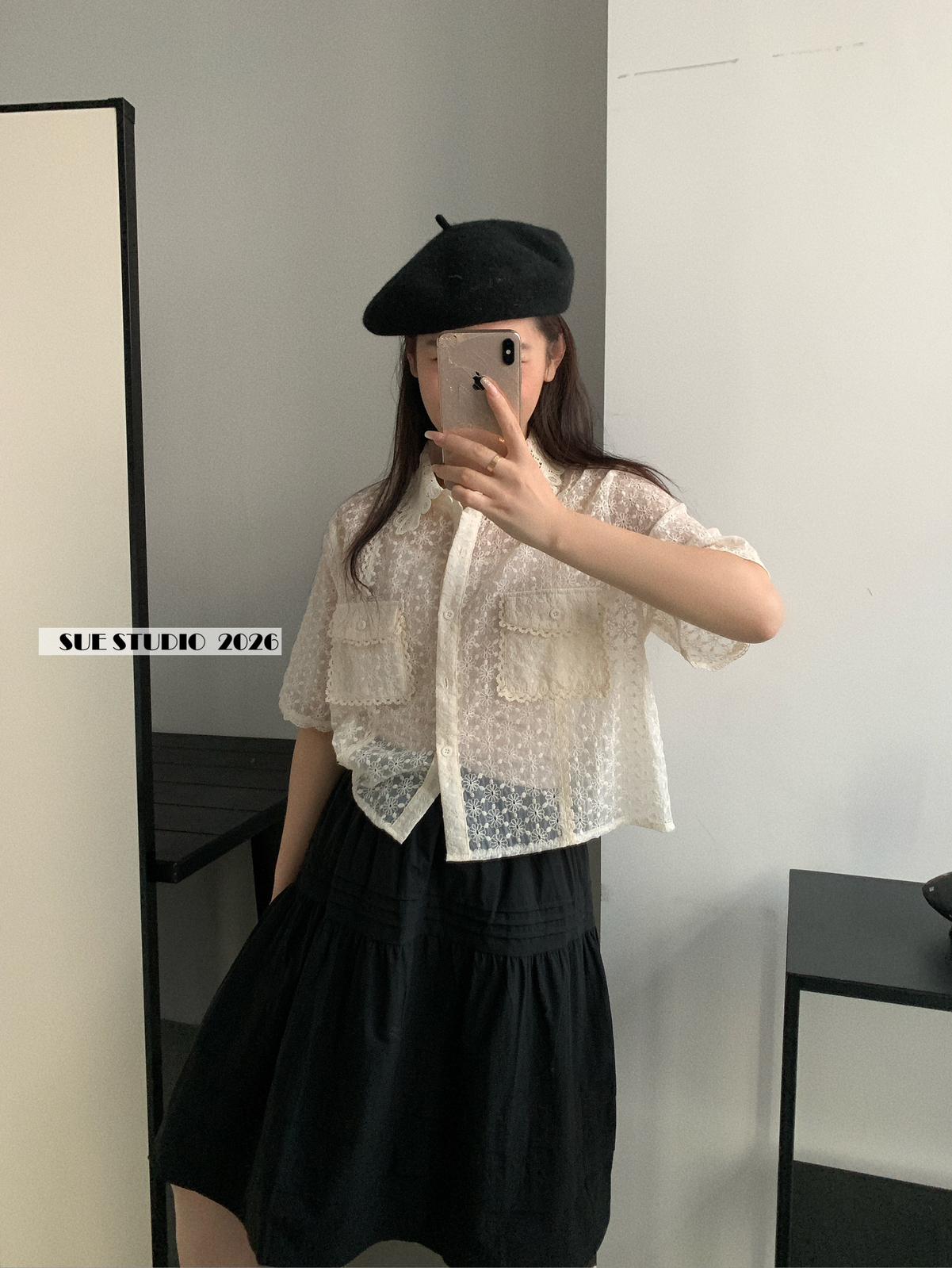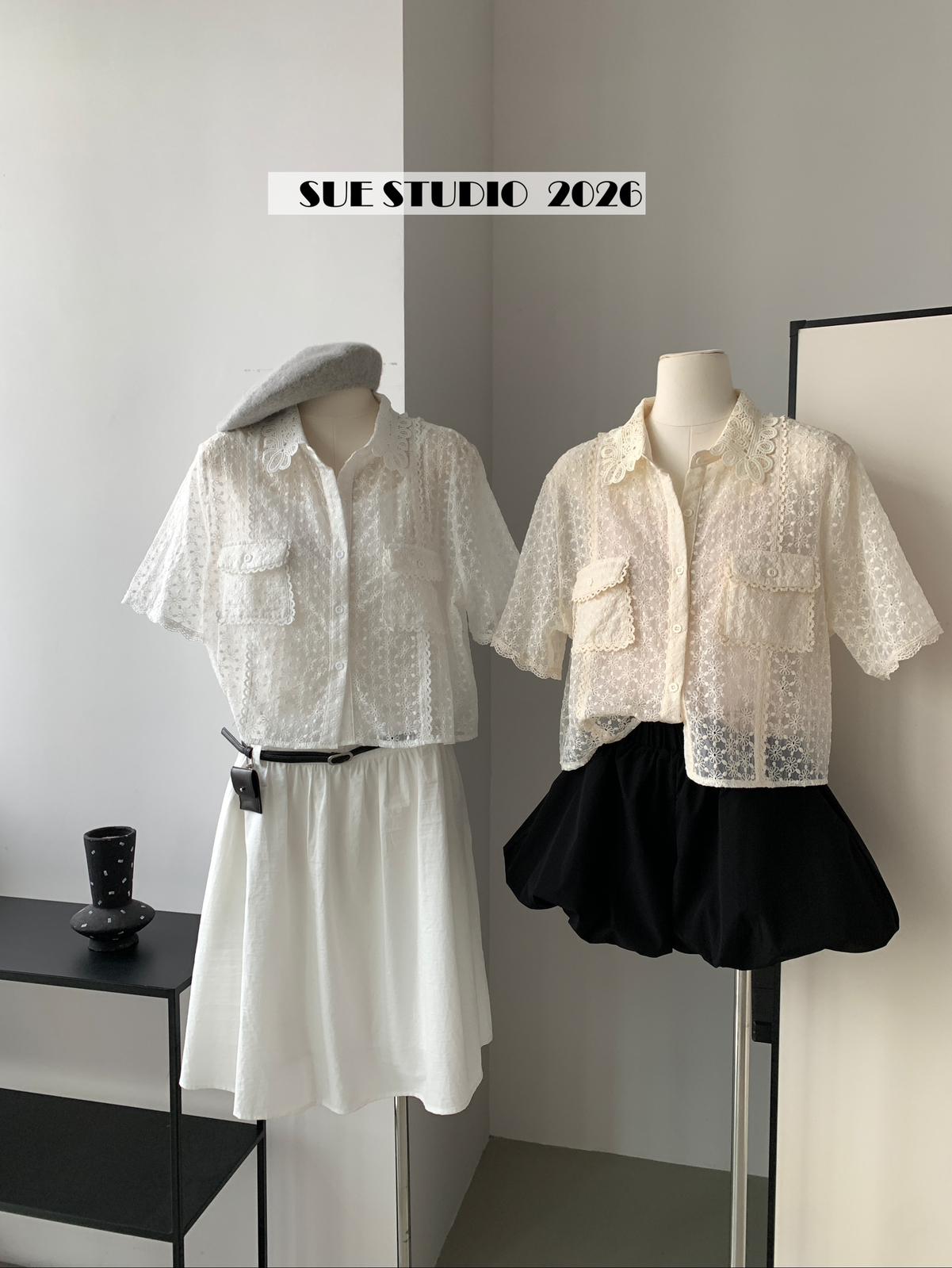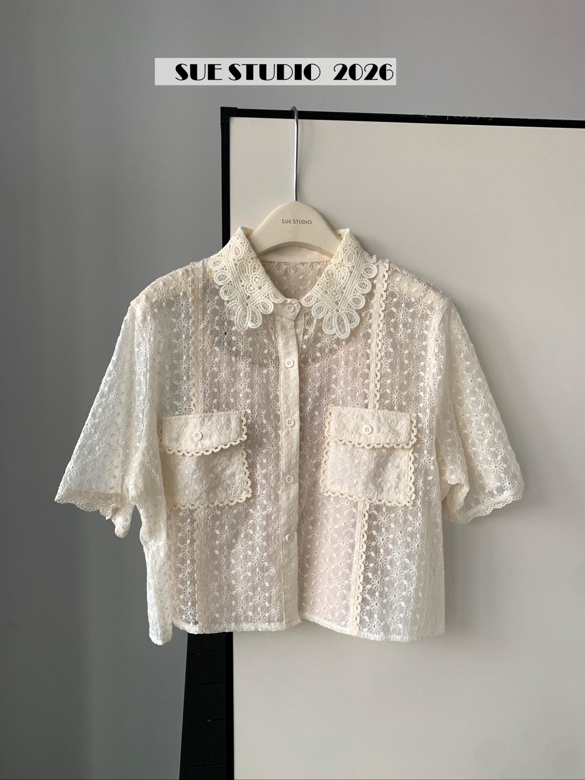 【C8636】韓系休閒簡約蕾絲開扣短袖襯衫式小衫+背心套裝
