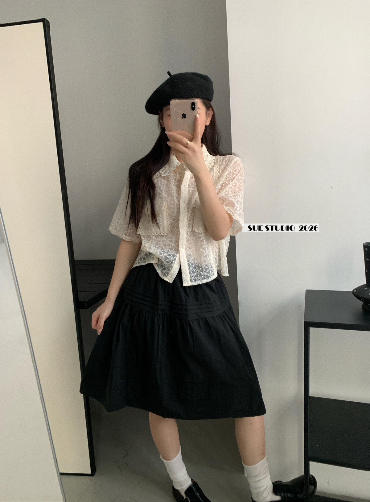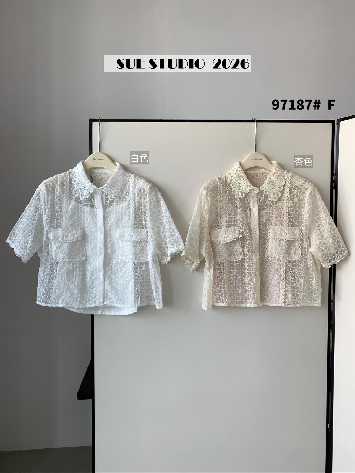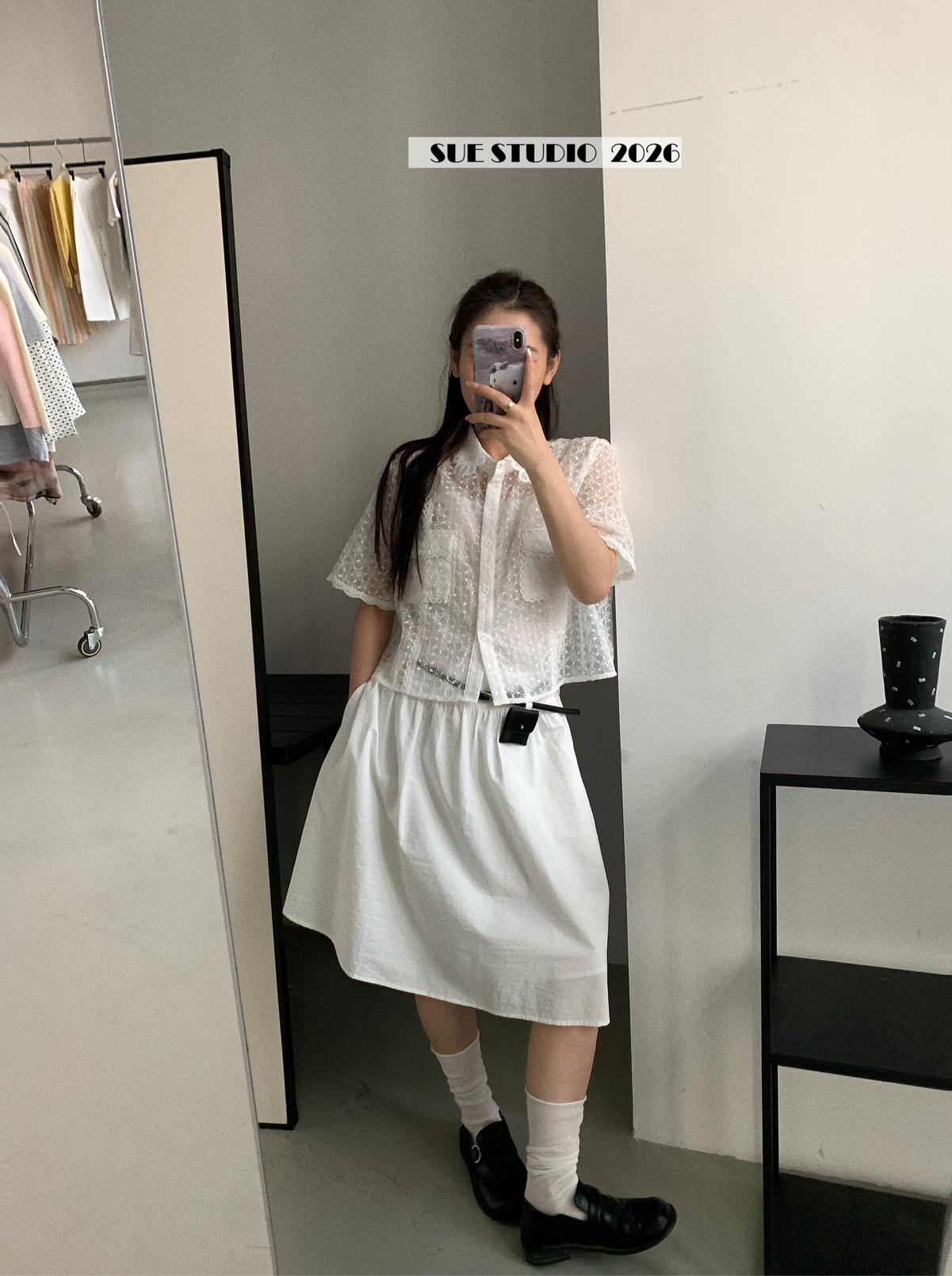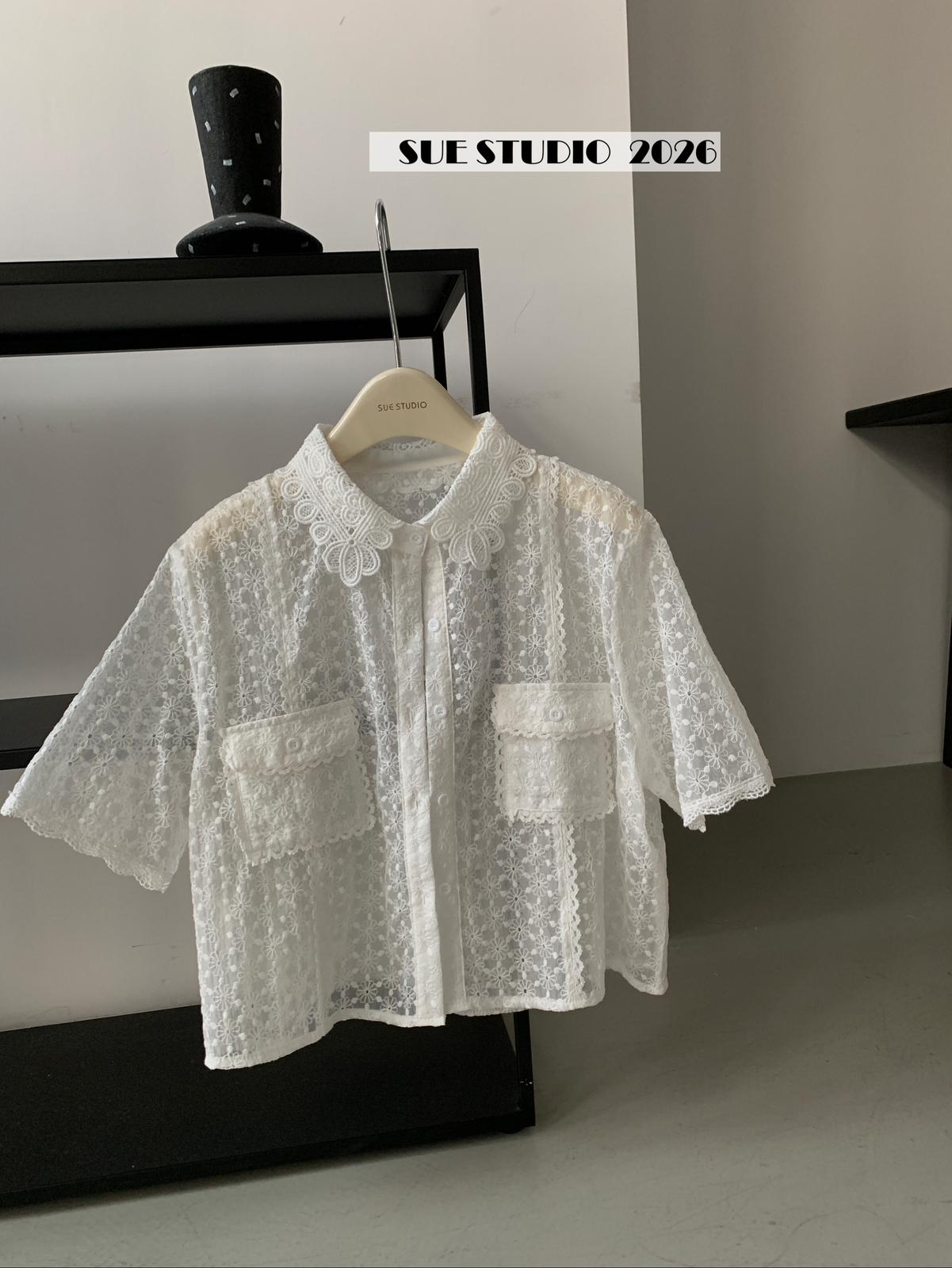 【C8636】韓系休閒簡約蕾絲開扣短袖襯衫式小衫+背心套裝